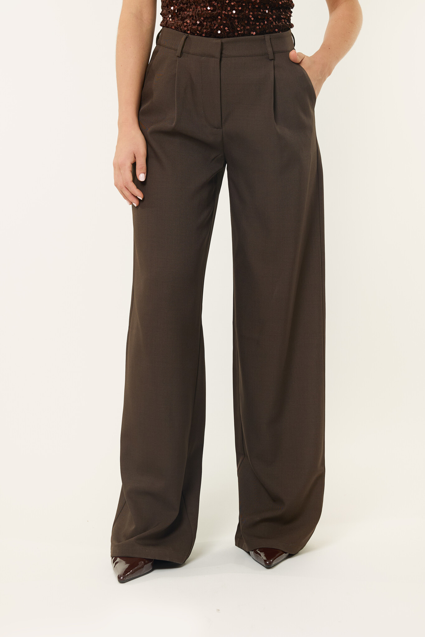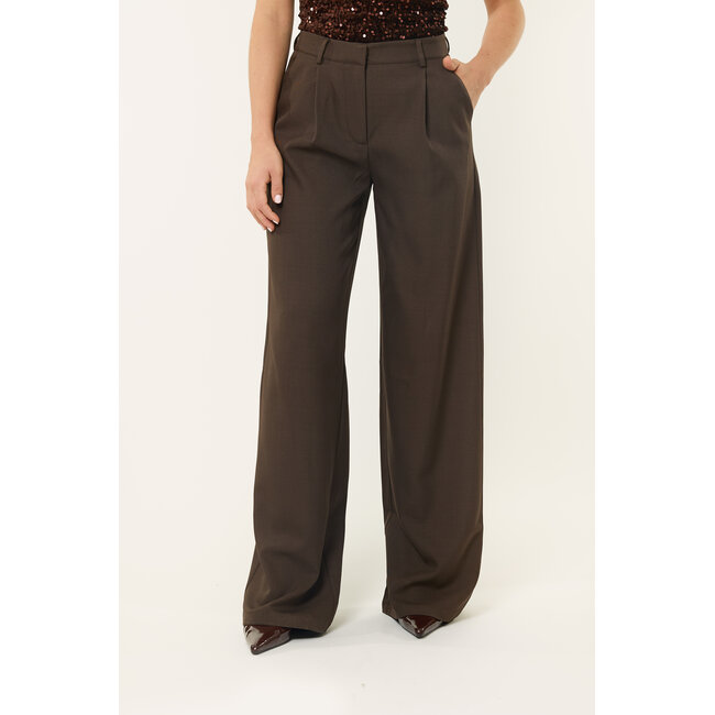 Onze bruine wide leg pantalon is een echte essential voor elke garderobe. Deze bruine wide leg pantalon combineert een tijdloze, elegante look met maximaal draagcomfort, dankzij de vloeiende stof en de mooie hoge taille die je silhouet op een natuurlijke manier verlengt. De rechte, wijdvallende pijpen zorgen voor een chique, moderne uitstraling, waardoor deze bruine wide leg pantalon zowel geschikt is voor een zakelijke look met een blazer als voor een avondje uit met een mooie top. Door de veelzijdige pasvorm en neutrale kleur is de bruine wide leg pantalon eindeloos te stylen en een musthave voor het hele jaar door.