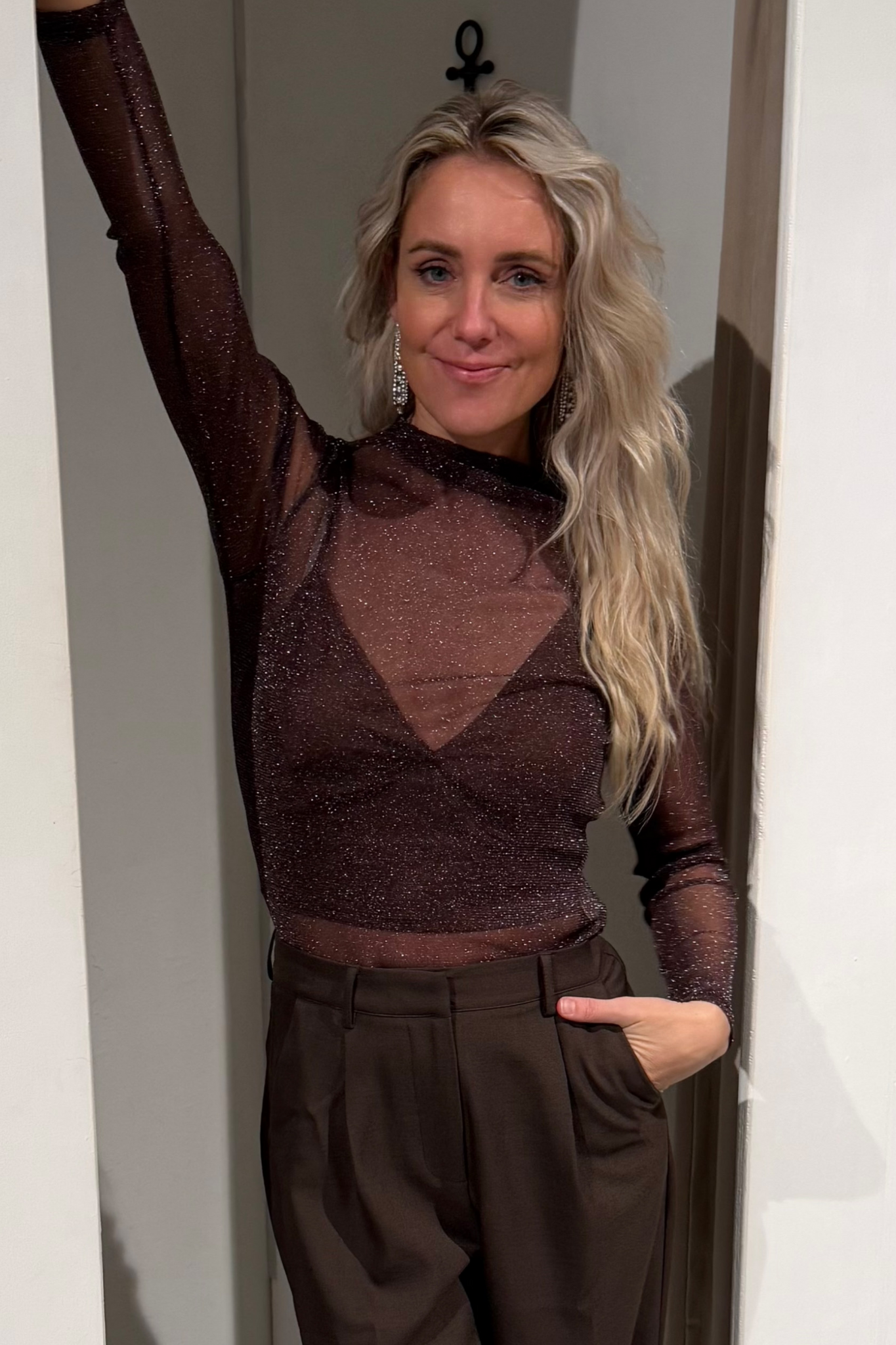 Deze bruine mesh glitter top is perfect als je een feestelijke, stoere look wilt creëren. De top is gemaakt van een fijn transparant mesh met een subtiele glitterglans, waardoor hij stijlvol opvalt zonder overheersend te zijn. Dankzij de aansluitende pasvorm en lange mouwen kun je hem makkelijk layeren over een bralette of onder een blazer voor een extra chique effect. Ideaal voor feestjes, avondjes uit of wanneer je je outfit net dat beetje sparkle wilt geven.