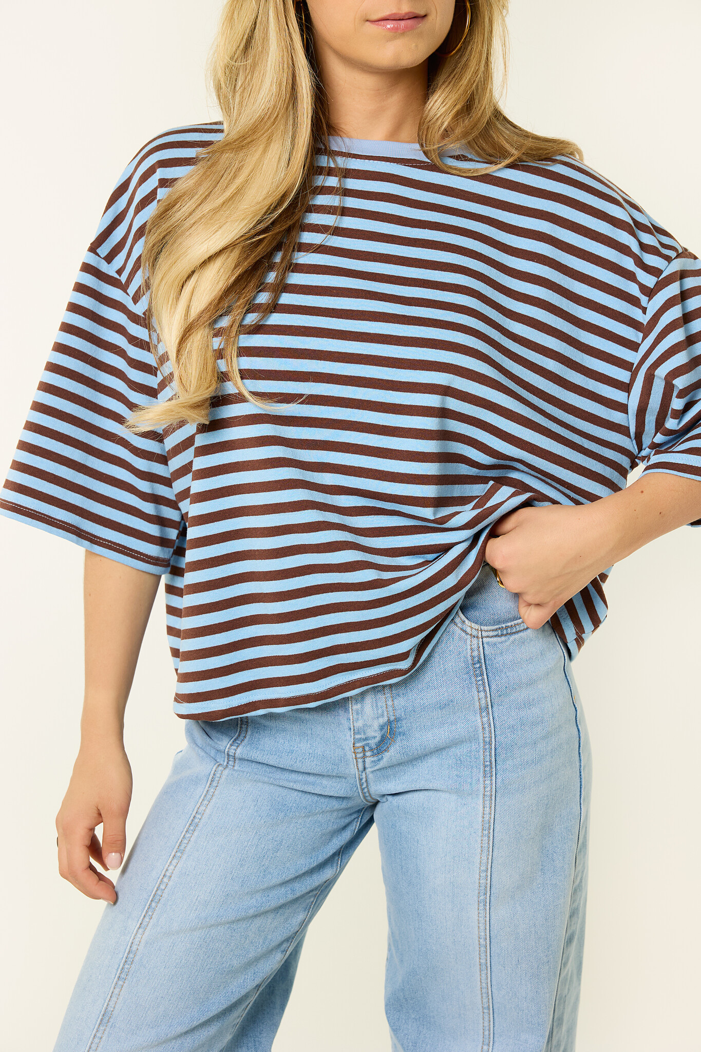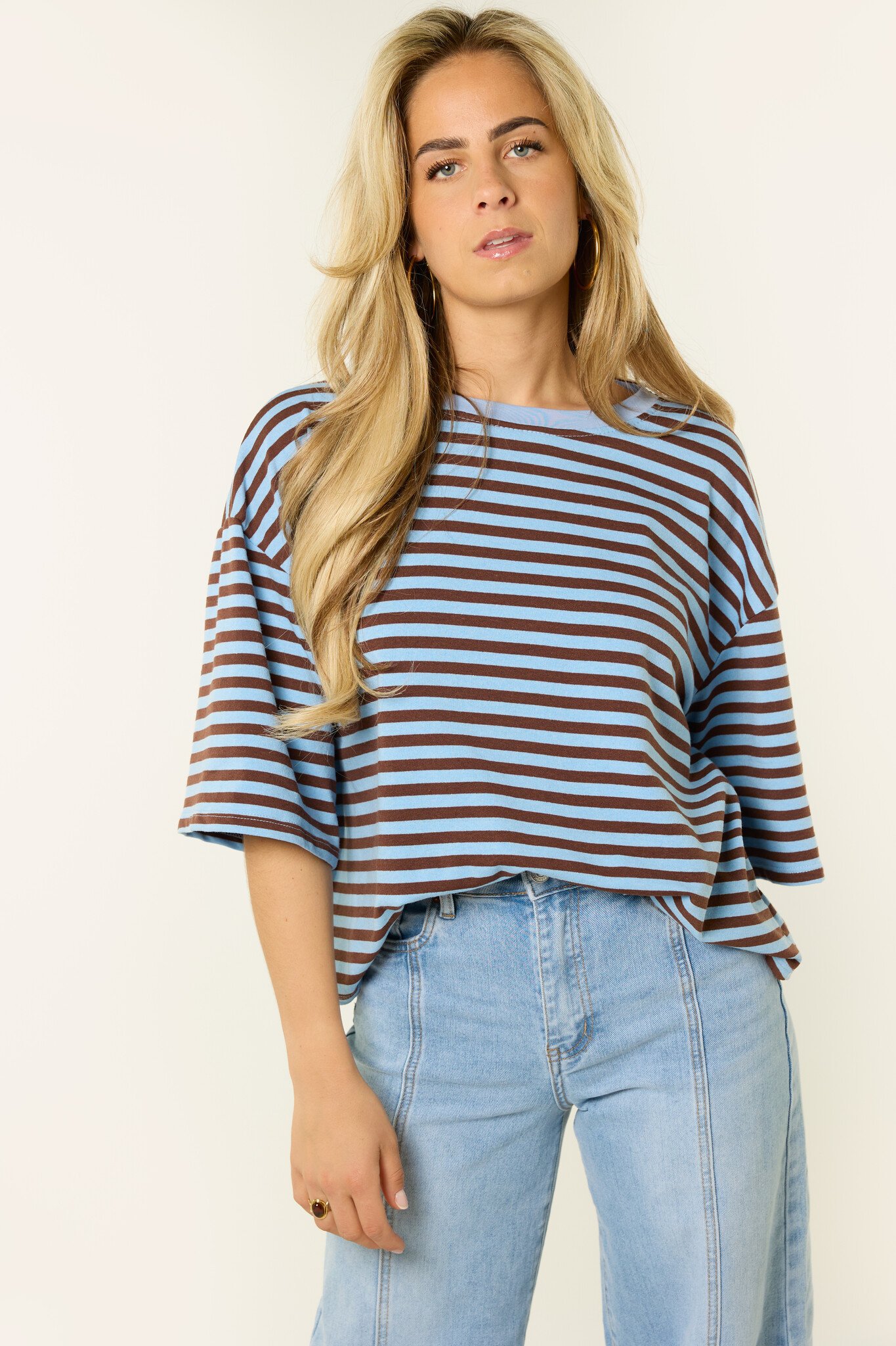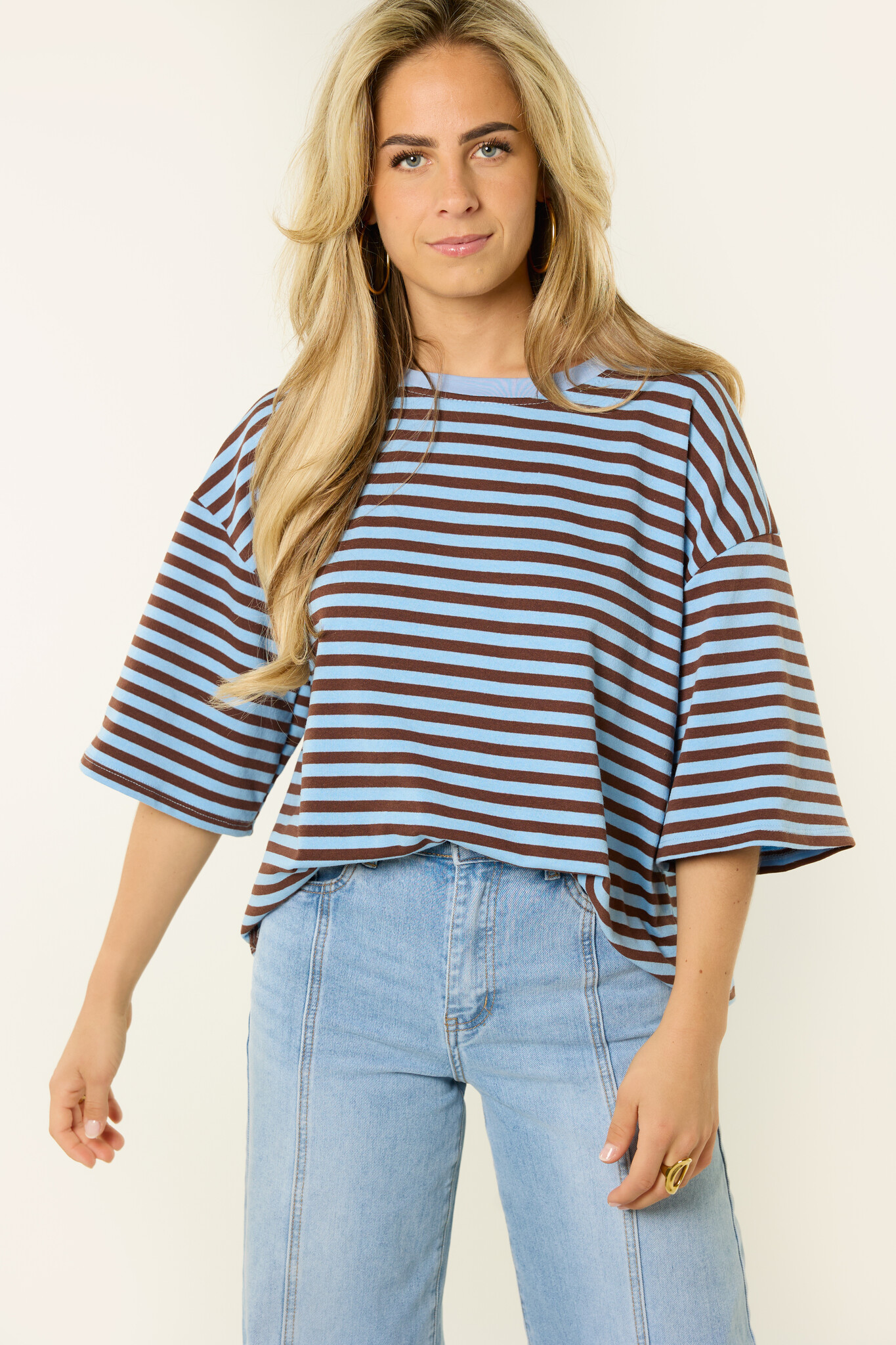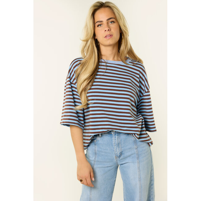 Dit oversized gestreepte shirt met blauw/bruine strepen is een fijne basic die je makkelijk overal bij draagt. De losvallende fit en de zachte stof zorgen voor een comfortabele look, terwijl de streepjes print het shirt net wat speelser maakt. Dit oversized t-shirt combineer je makkelijk met een jeans, wide leg broek of rok voor een casual en trendy outfit. Een gestreepte top die perfect is voor elke dag en die je eindeloos kunt combineren.