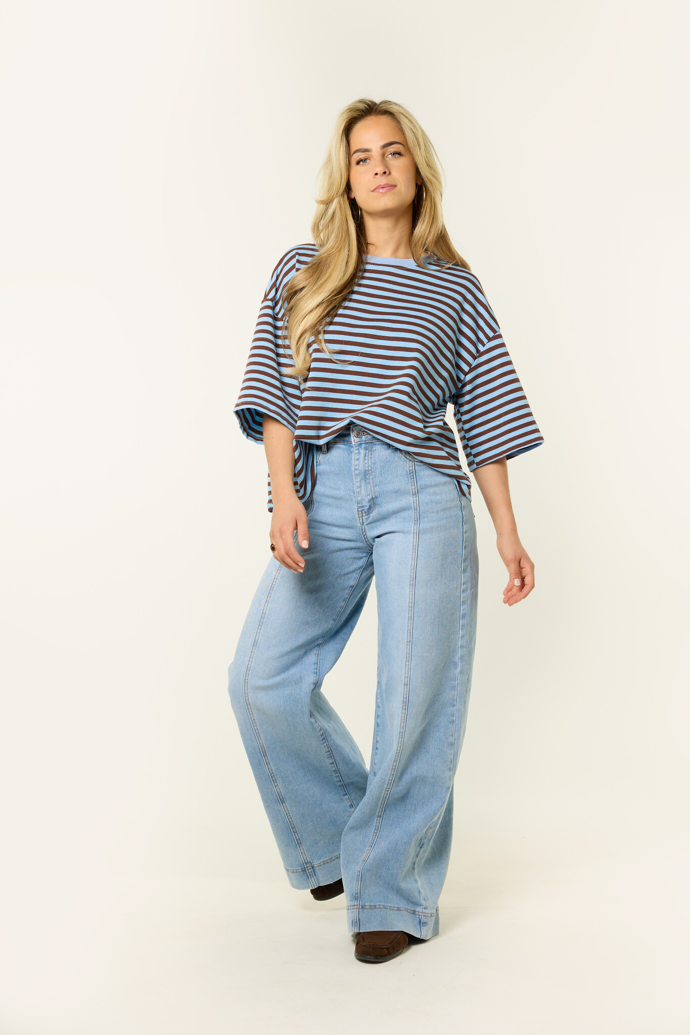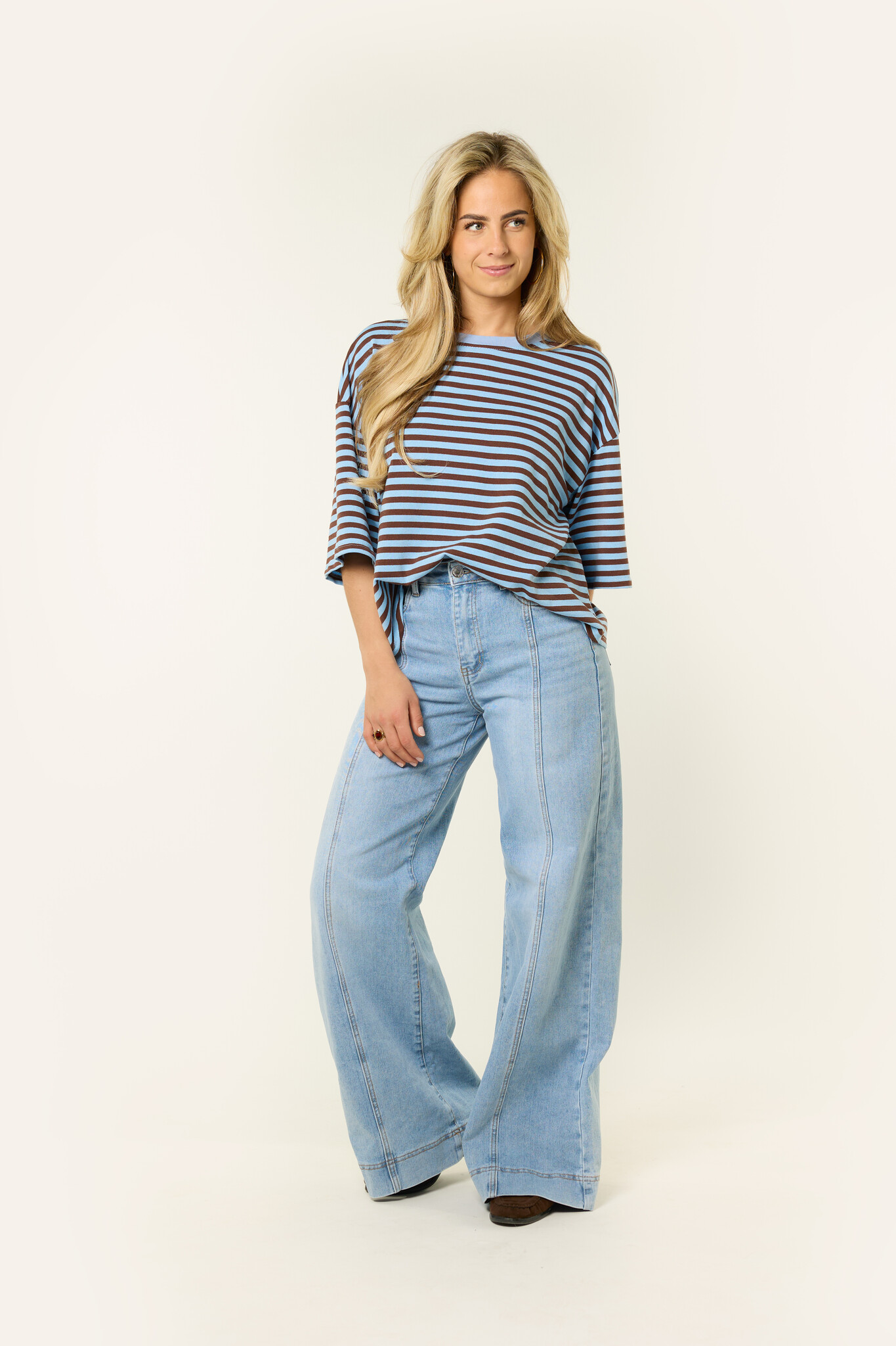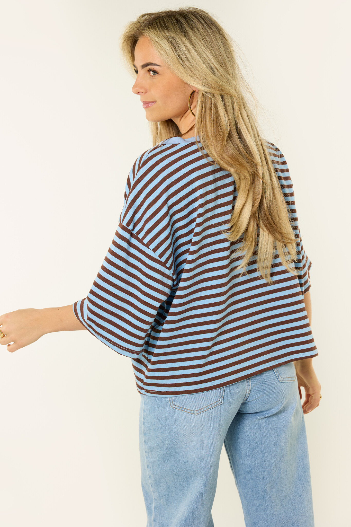 Dit oversized gestreepte shirt met blauw/bruine strepen is een fijne basic die je makkelijk overal bij draagt. De losvallende fit en de zachte stof zorgen voor een comfortabele look, terwijl de streepjes print het shirt net wat speelser maakt. Dit oversized t-shirt combineer je makkelijk met een jeans, wide leg broek of rok voor een casual en trendy outfit. Een gestreepte top die perfect is voor elke dag en die je eindeloos kunt combineren.
