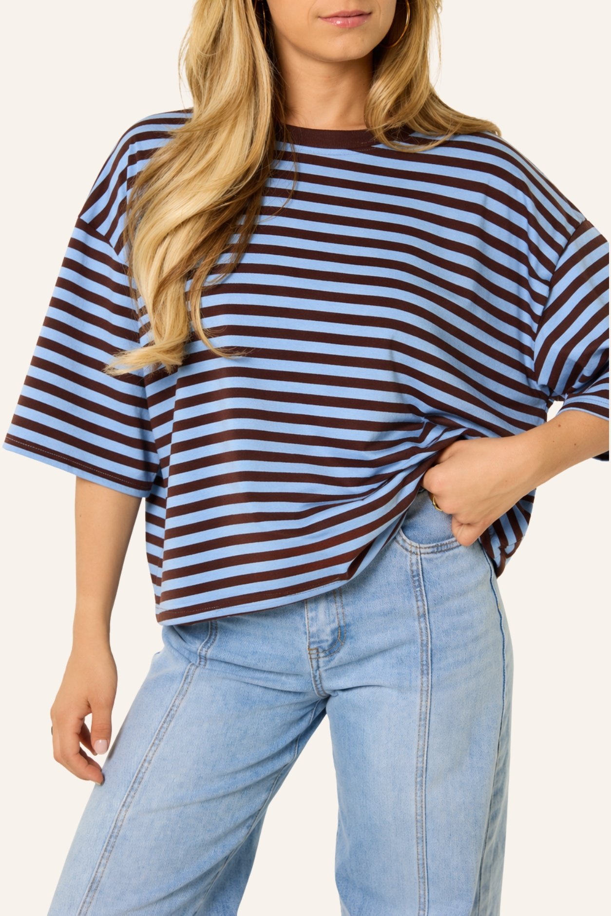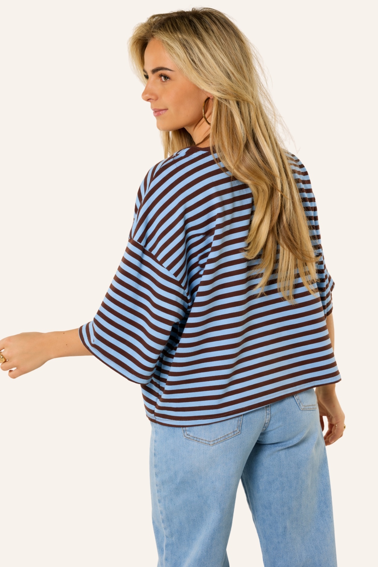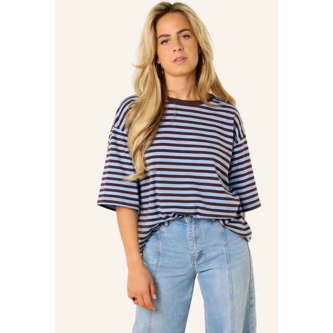 Dit oversized gestreepte shirt met blauw/bruine strepen is een fijne basic die je makkelijk overal bij draagt. De losvallende fit en de zachte stof zorgen voor een comfortabele look, terwijl de streepjes print het shirt net wat speelser maakt. Dit oversized t-shirt combineer je makkelijk met een jeans, wide leg broek of rok voor een casual en trendy outfit. Een gestreepte top die perfect is voor elke dag en die je eindeloos kunt combineren.