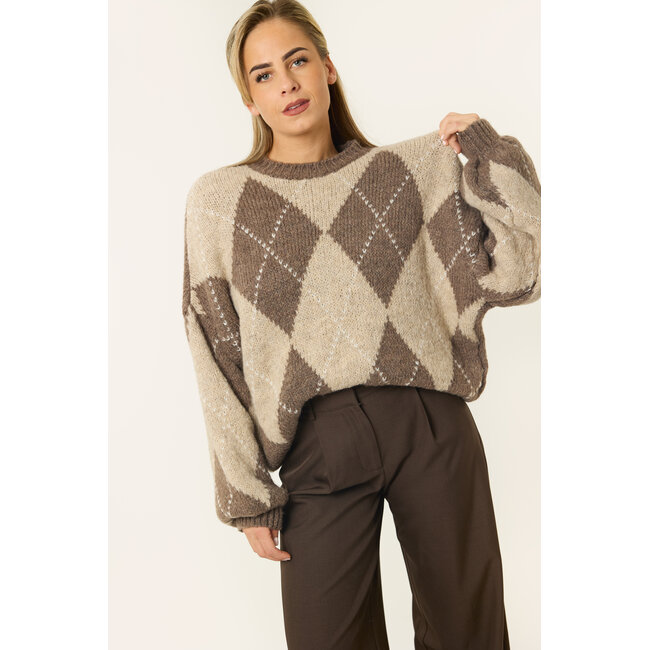 Deze gebreide trui met ruitpatroon is zo’n item waar je meteen blij van wordt. De combinatie van bruin en taupe geeft de trui een speelse, maar toch rustige uitstraling en maakt sweater makkelijk te combineren. De fit is lekker los en comfortabel, met zachte, volumineuze mouwen die zorgen voor een cozy look. Perfect voor een casual dag met een jeans, maar ook heel leuk op een nette pantalon voor een meer aangeklede outfit.
