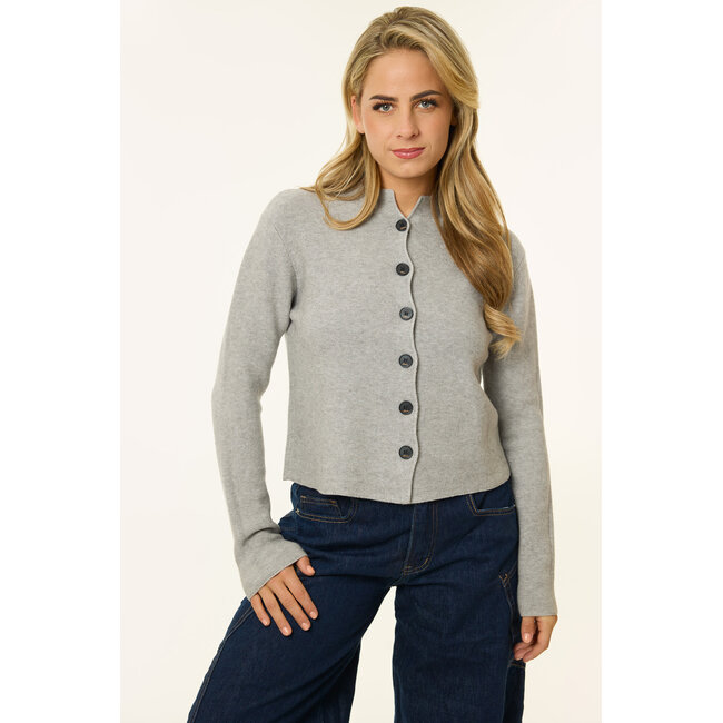 Deze grijze cardigan is een perfecte basic voor elke dag. De zachte, gebreide stof voelt heerlijk aan en de rechte fit zorgt voor een moderne, minimalistische look. De donkere knopen geven een subtiel contrast en maken de knit net wat stoerder. Draag het vest met een jeans voor een casual look of combineer met een pantalon voor een stijlvolle, effortless outfit.