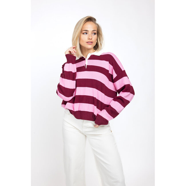 Deze gestreepte polo longsleeve in roze en bordeaux is een stijlvol en comfortabel item voor elke dag. De polo longsleeve met kraag en subtiele strepen geeft de top een speelse en vrouwelijke uitstraling. Dankzij de fijne stof en comfortabele pasvorm draagt de trui comfortabel. De gestreepte polo is eenvoudig te combineren met een jeans, pantalon of rok en past perfect bij een trendy en casual outfit.