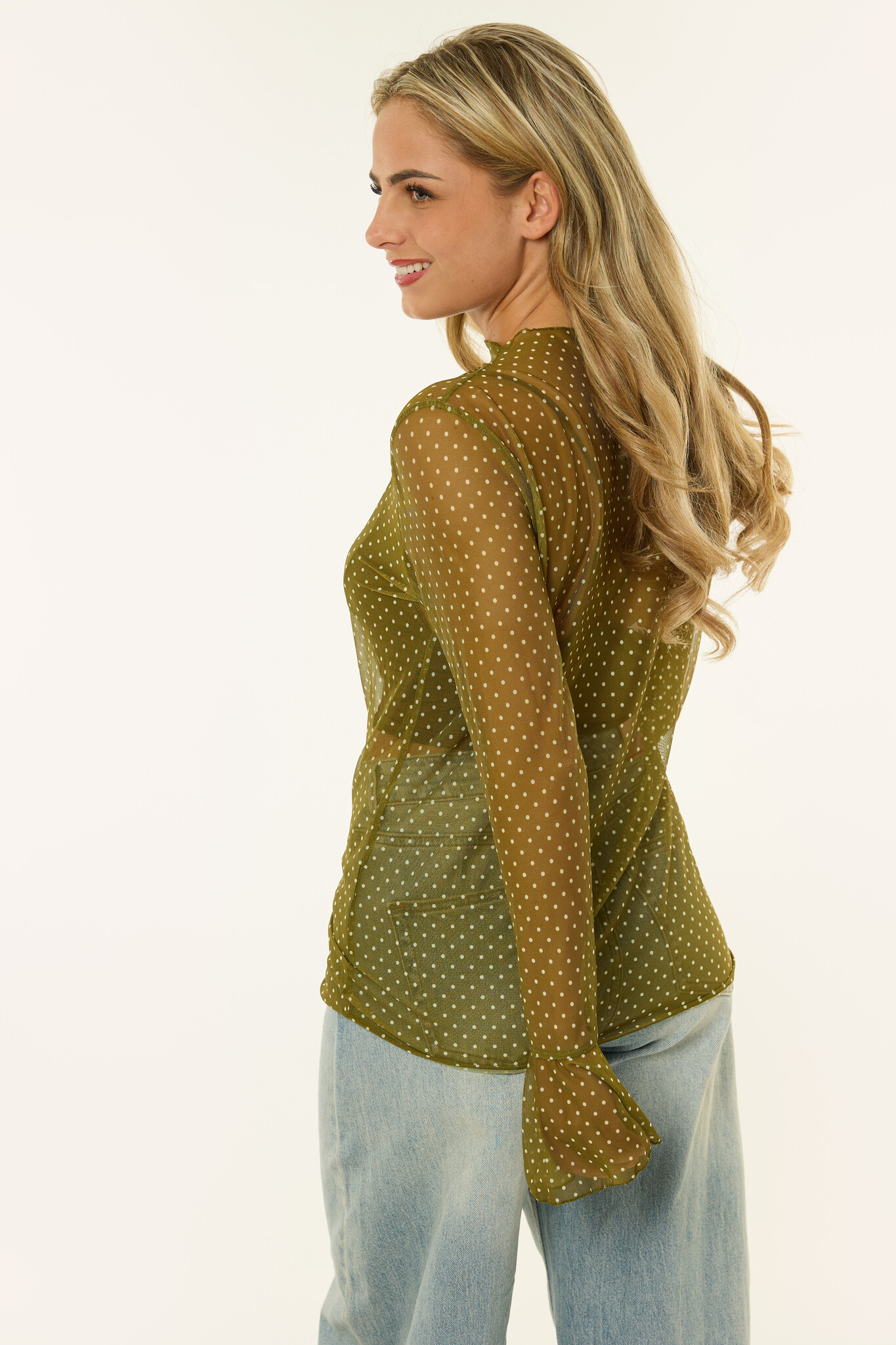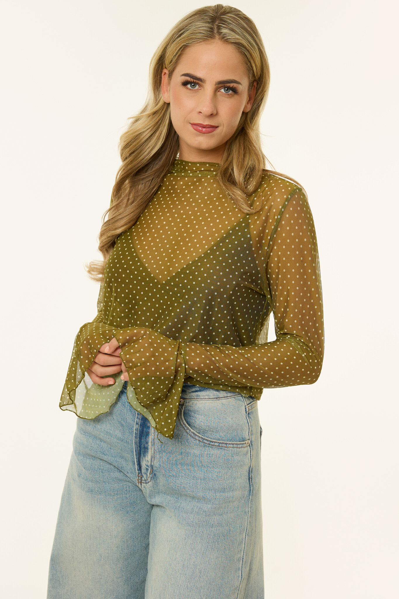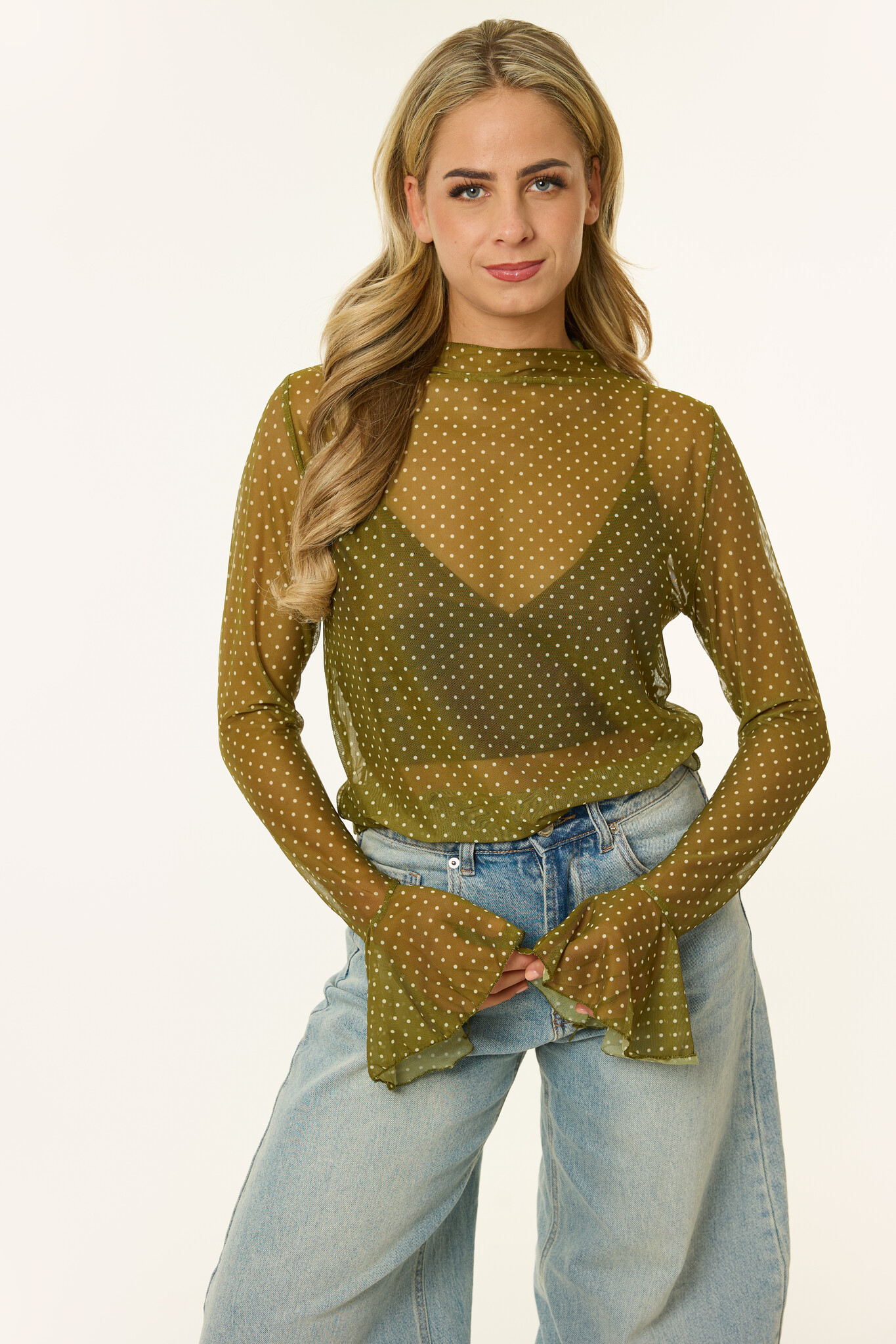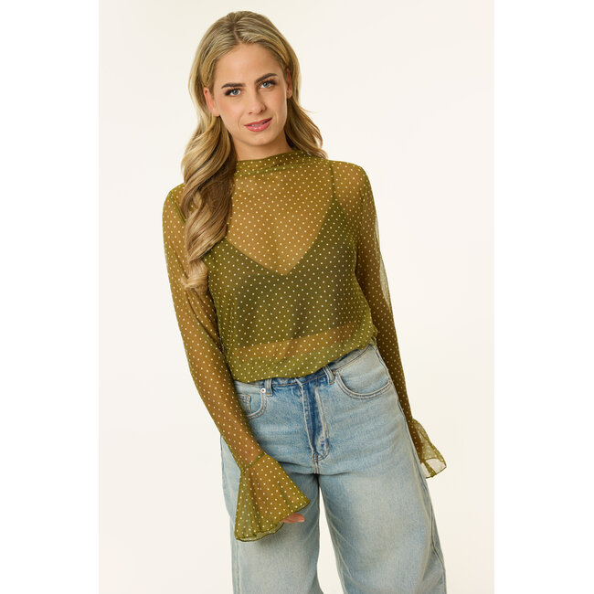 Deze groene mesh top met stippen is zo’n item dat je meteen een boost geeft. De doorschijnende stof geeft de top net dat beetje extra, terwijl de kleine polkadots en uitlopende mouwen juist weer heel vrouwelijk zijn. Draag de groene mesh longsleeve met een bralette eronder voor een avondje uit of gooi er een vestje overheen voor een comy maar chique look. Een echte eye-catcher om in je kast te hebben!