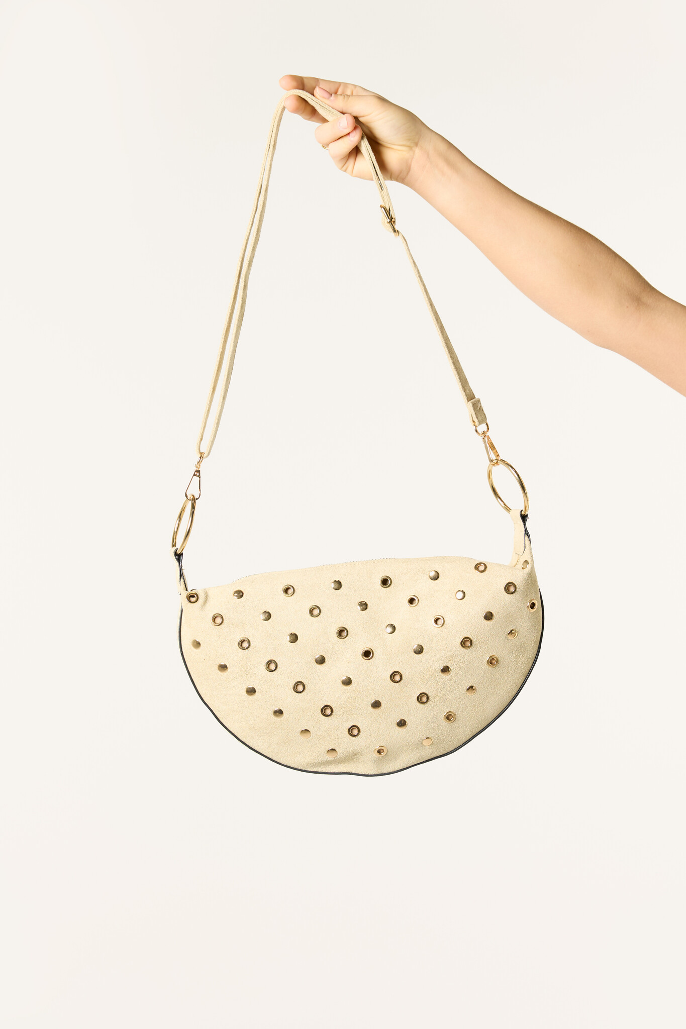 Deze beige schoudertas is een echte eyecatcher voor je outfit. De goudkleurige studs geven de tas een trendy uitstraling en maken hem perfect voor zowel een casual als een feestelijke look. De beige tas met studs is leuk te combineren met bijna elke outfit. Draag hem als schoudertas bij een jeans en top, een jurk of een festival outfit. Een tas die je outfit meteen een stijlvolle touch geeft.