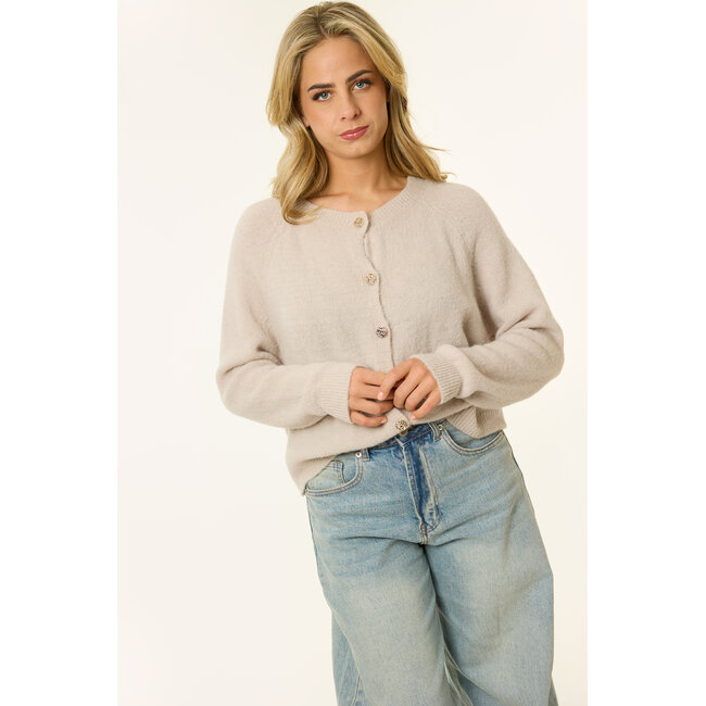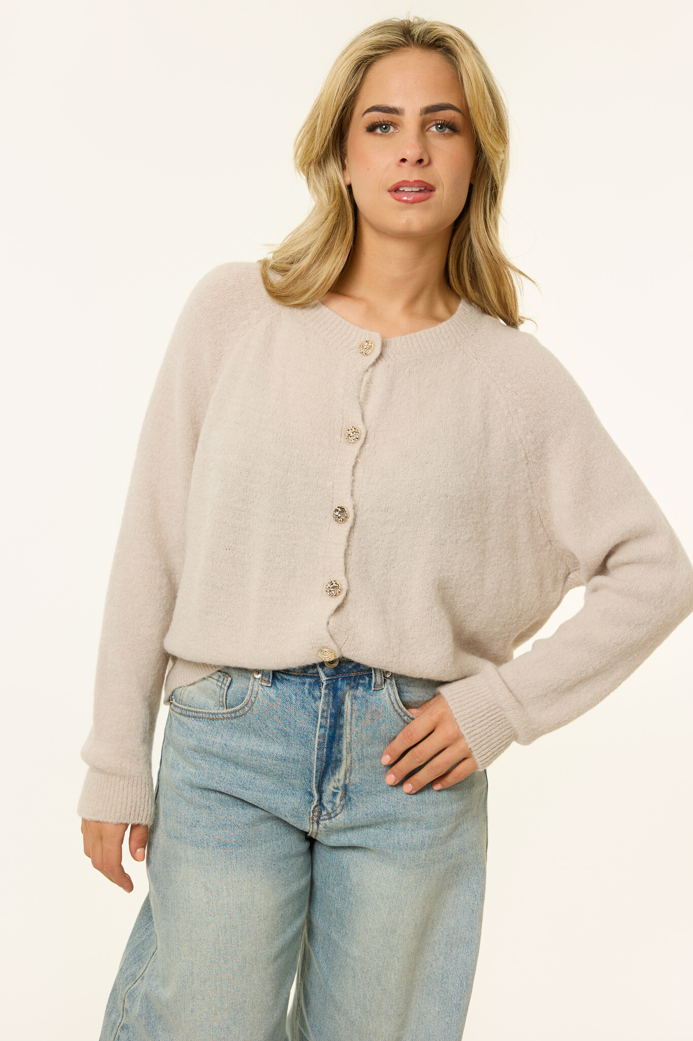 Deze beige gebreide cardigan is een echte essential voor het najaar. De zachte, fluffy stof voelt heerlijk warm aan en de relaxte fit zorgt voor een comfy, maar stijlvolle look. De glanzende knopen geven de cardigan een subtiele, vrouwelijke touch. Perfect te dragen met een jeans voor een casual outfit of over een jurk voor een cozy, herfstige look.
