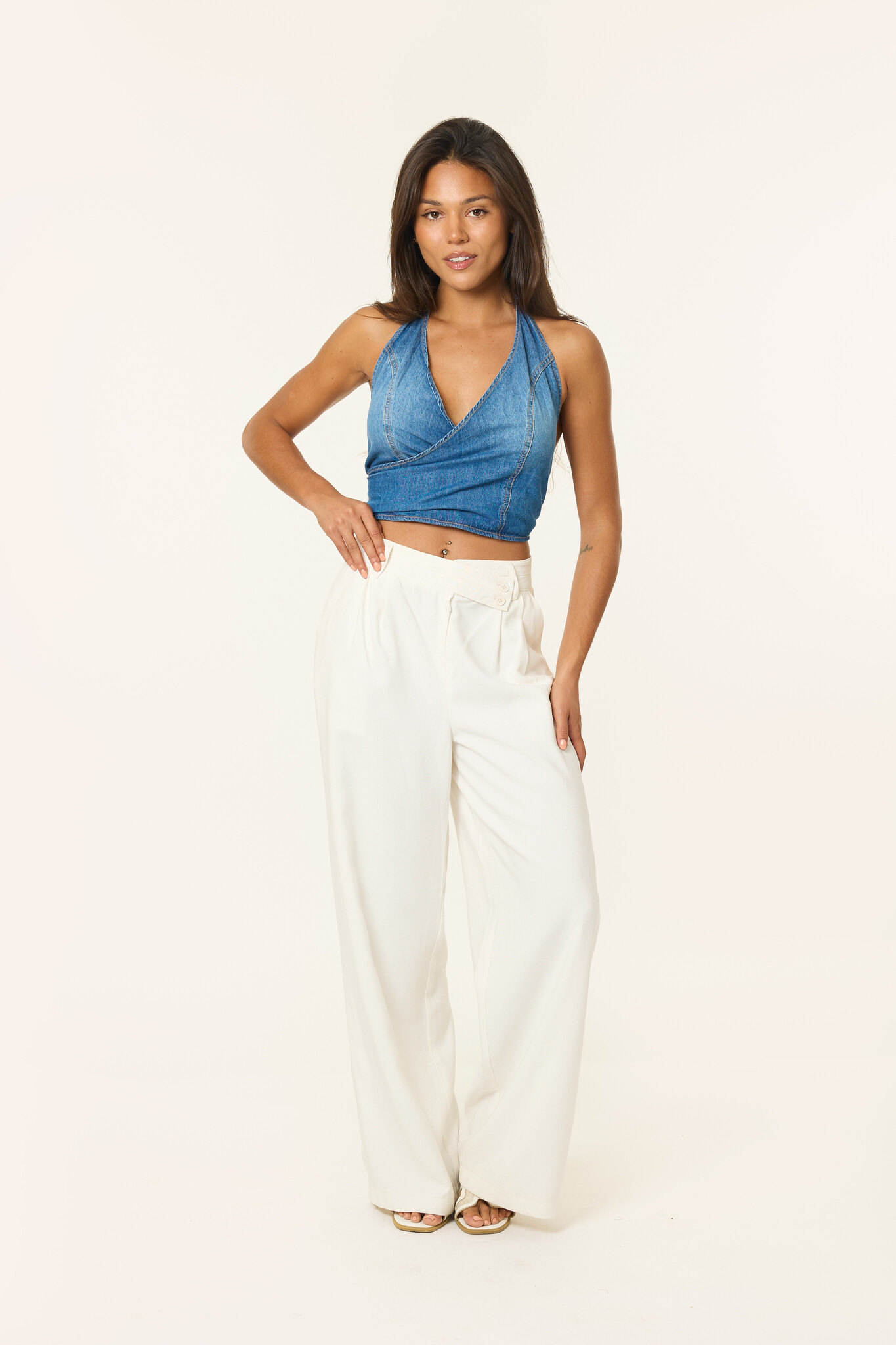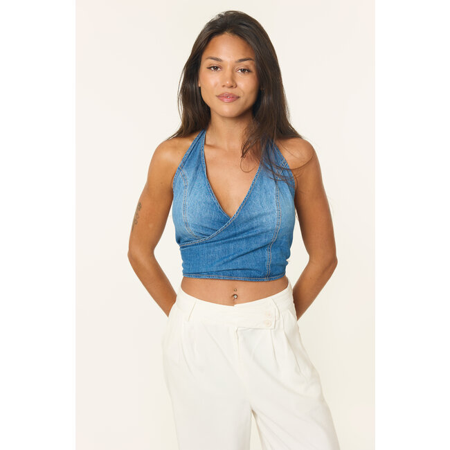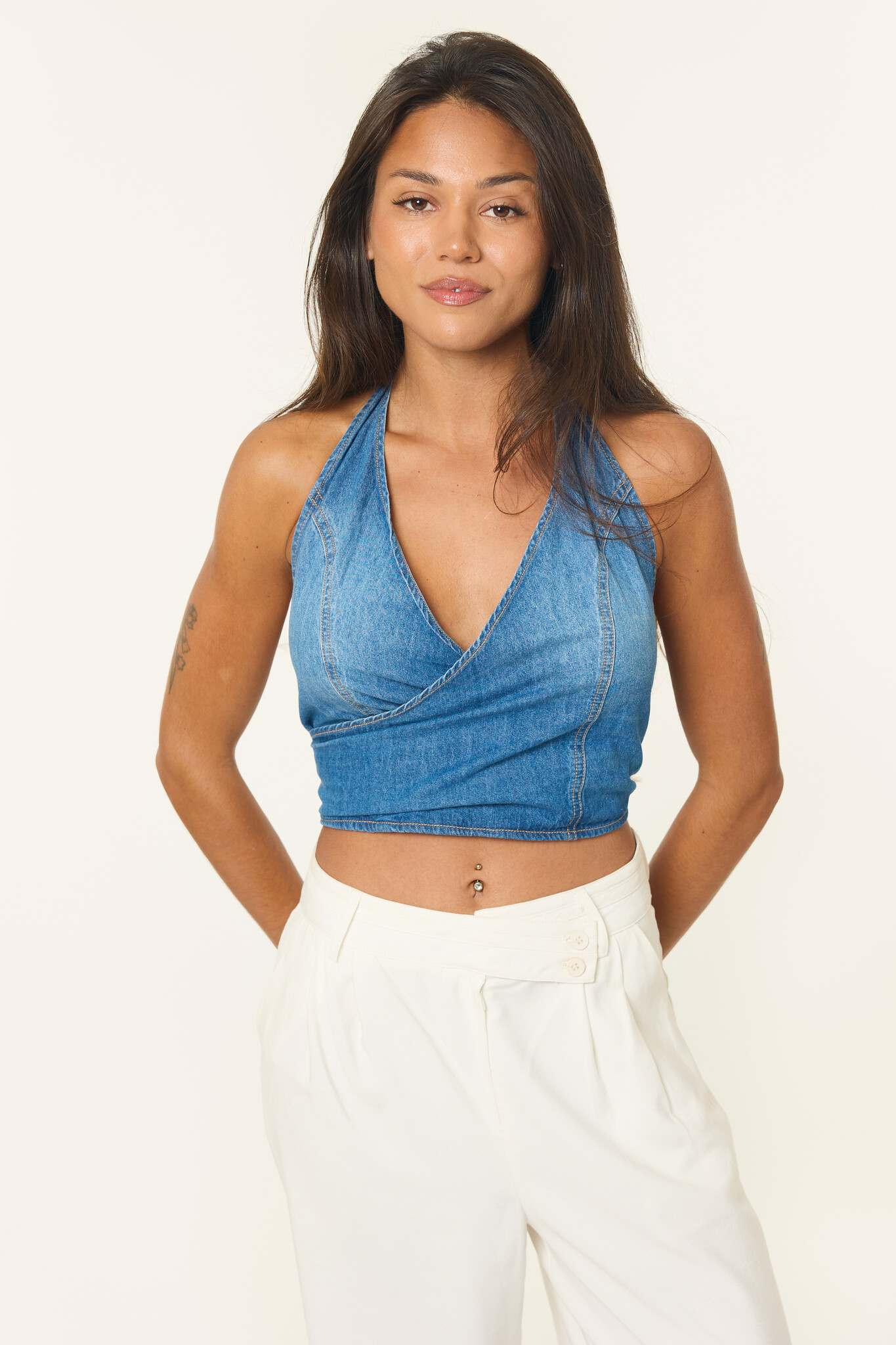 Deze denim blauwe halter top met open rug is gemaakt voor momenten waarop je effortless een leuke outfit nodig hebt. De denim look is tijdloos, waardoor je de top eindeloos kunt combineren. Perfect voor festivals, een avondje uit of gewoon die zomerdag waarop je outfit mag shinen.