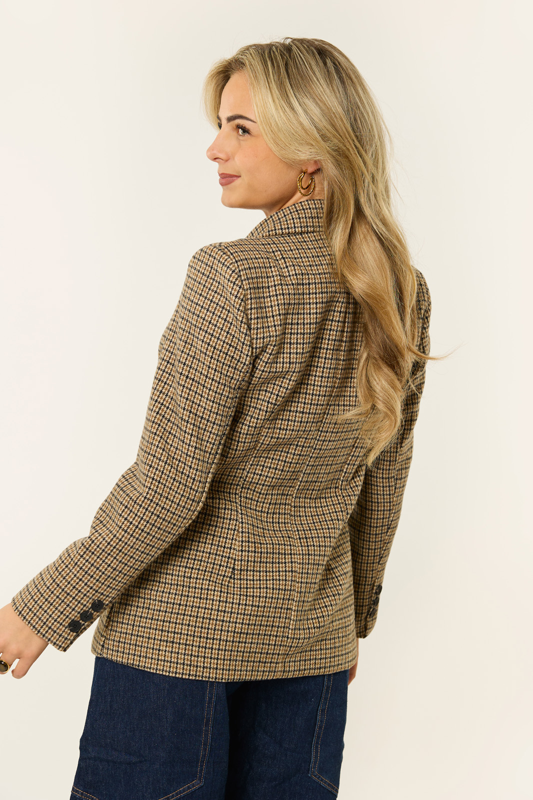 Deze geruite beige met zwarte blazer is zo’n item dat je outfit in één keer naar een hoger niveau tilt. De klassieke ruit geeft een stijlvolle, tijdloze uitstraling, terwijl de getailleerde pasvorm zorgt voor een mooi, vrouwelijk silhouet. De blazer is afgewerkt met een enkele knoopsluiting en subtiele zakdetails, waardoor hij zowel chic als draagbaar blijft. Draag hem zakelijk met een blouse en pantalon of juist casual met jeans en een basic top deze blazer werkt echt overal bij en is een perfecte toevoeging aan jouw herfst- en wintergarderobe.