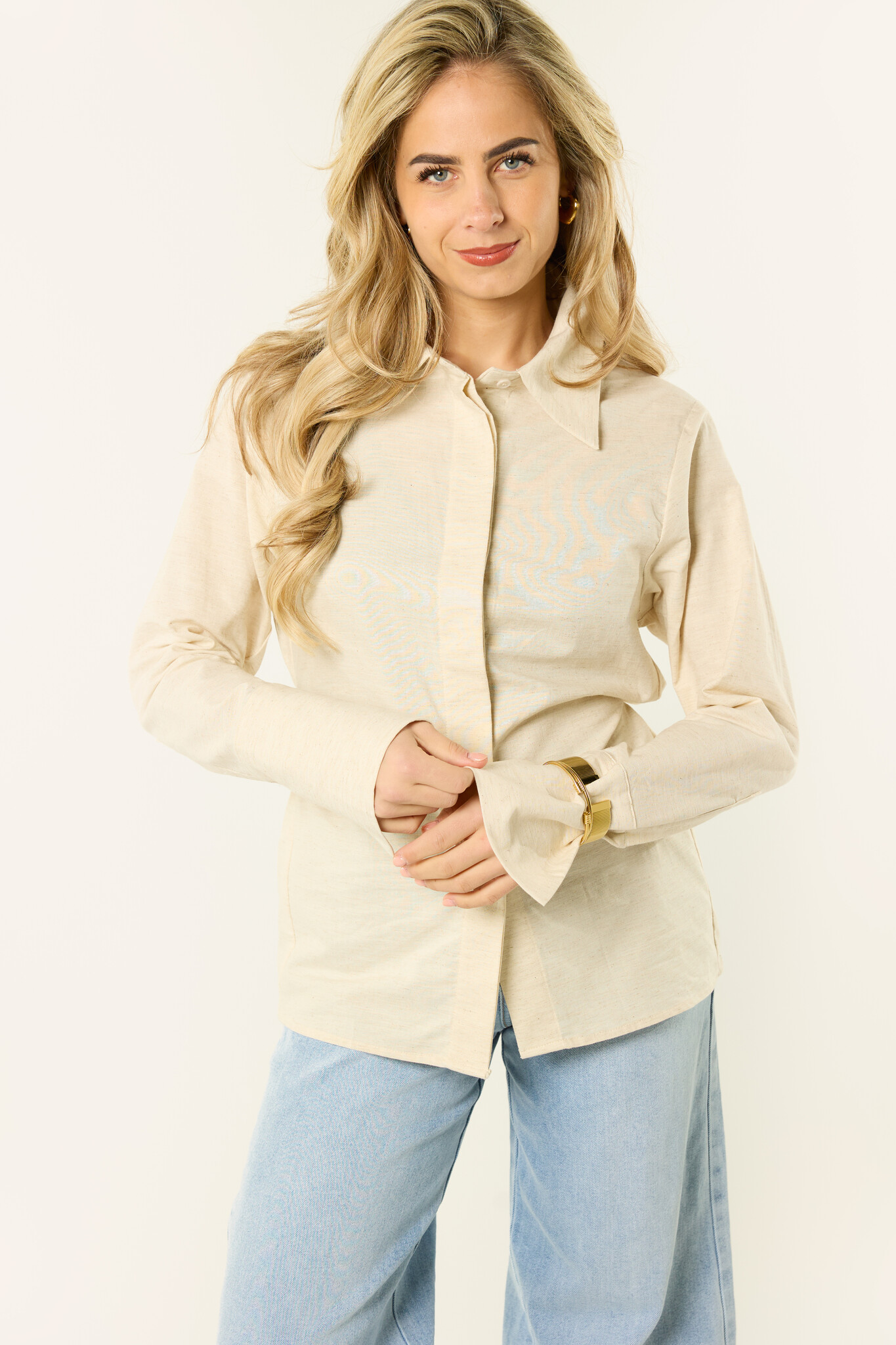 Deze getailleerde blouse in het beige is zo’n item dat je makkelijk overal bij draagt. De blouse heeft een mooie aansluitende pasvorm, lange mouwen en een tijdloze uitstraling.