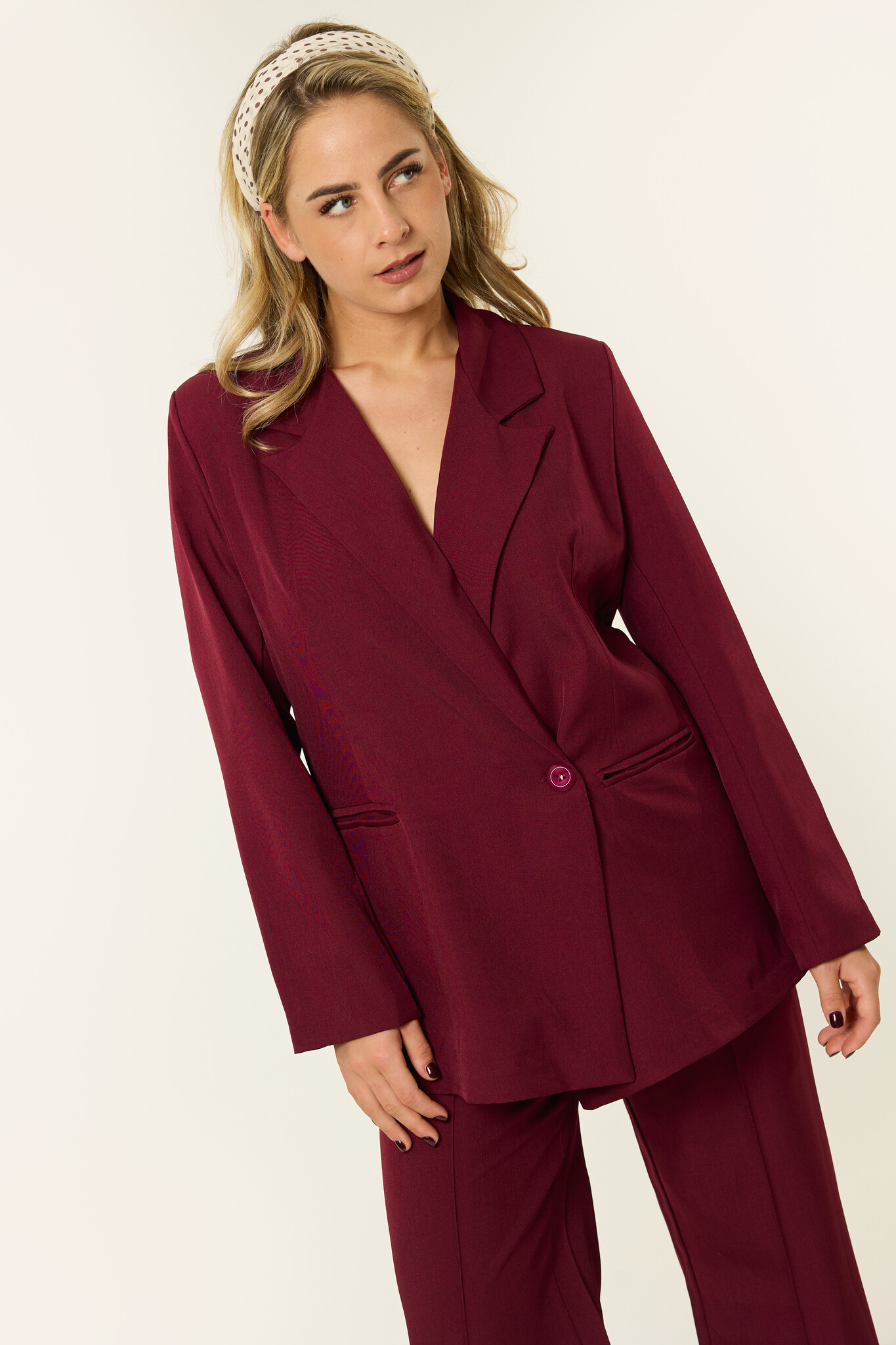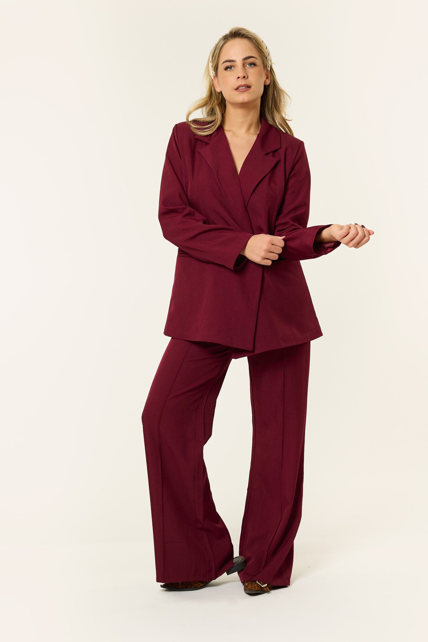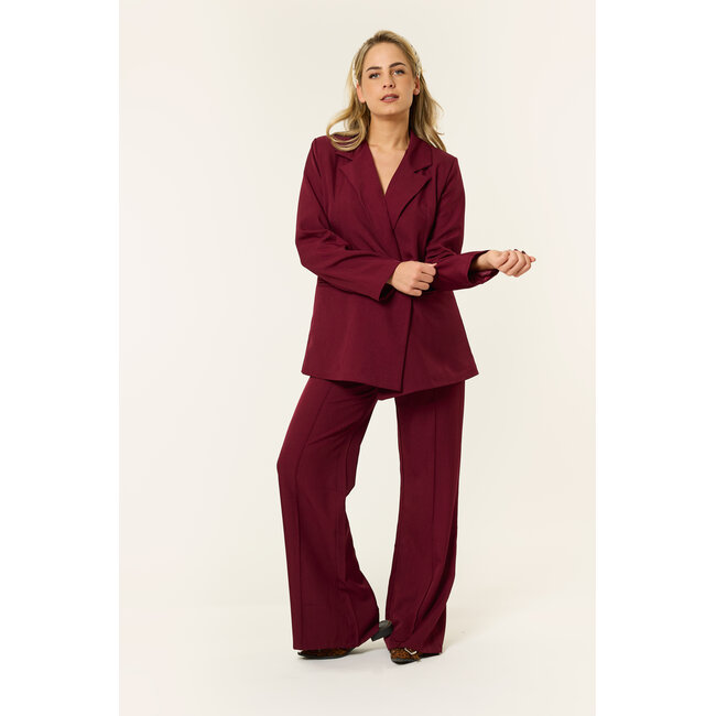 De bordeauxkleurige blazer dames is een echte musthave als je houdt van een krachtige maar vrouwelijke look. Deze burgundy oversized blazer valt mooi recht, sluit met één knoop en heeft subtiele schouderdetails waardoor hij meteen een luxe uitstraling krijgt. Door de diepe donkerrode kleur is dit een perfecte blazer voor zowel kantoor als een avondje uit. Combineer de blazer met de bijpassende Noortje pantalon voor een compleet pak, of draag de blazer casual over een basic top en jeans. Een tijdloze burgundy blazer die je outfit in één klap een elegante upgrade geeft.