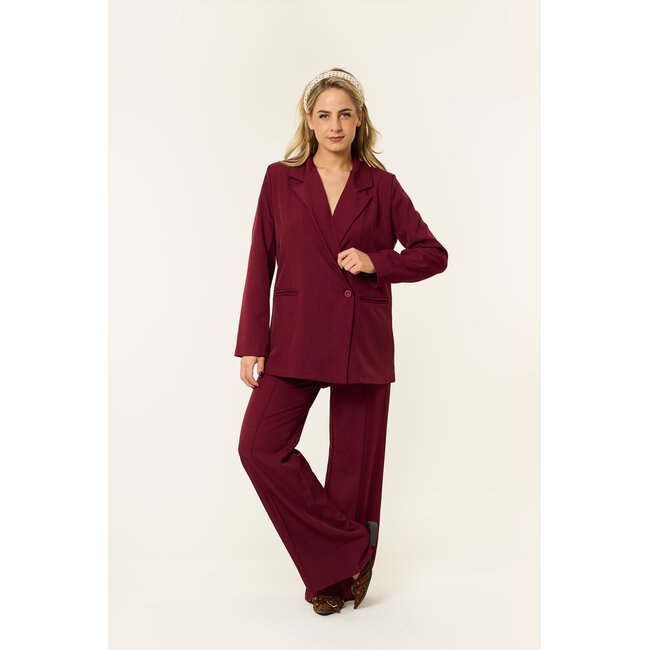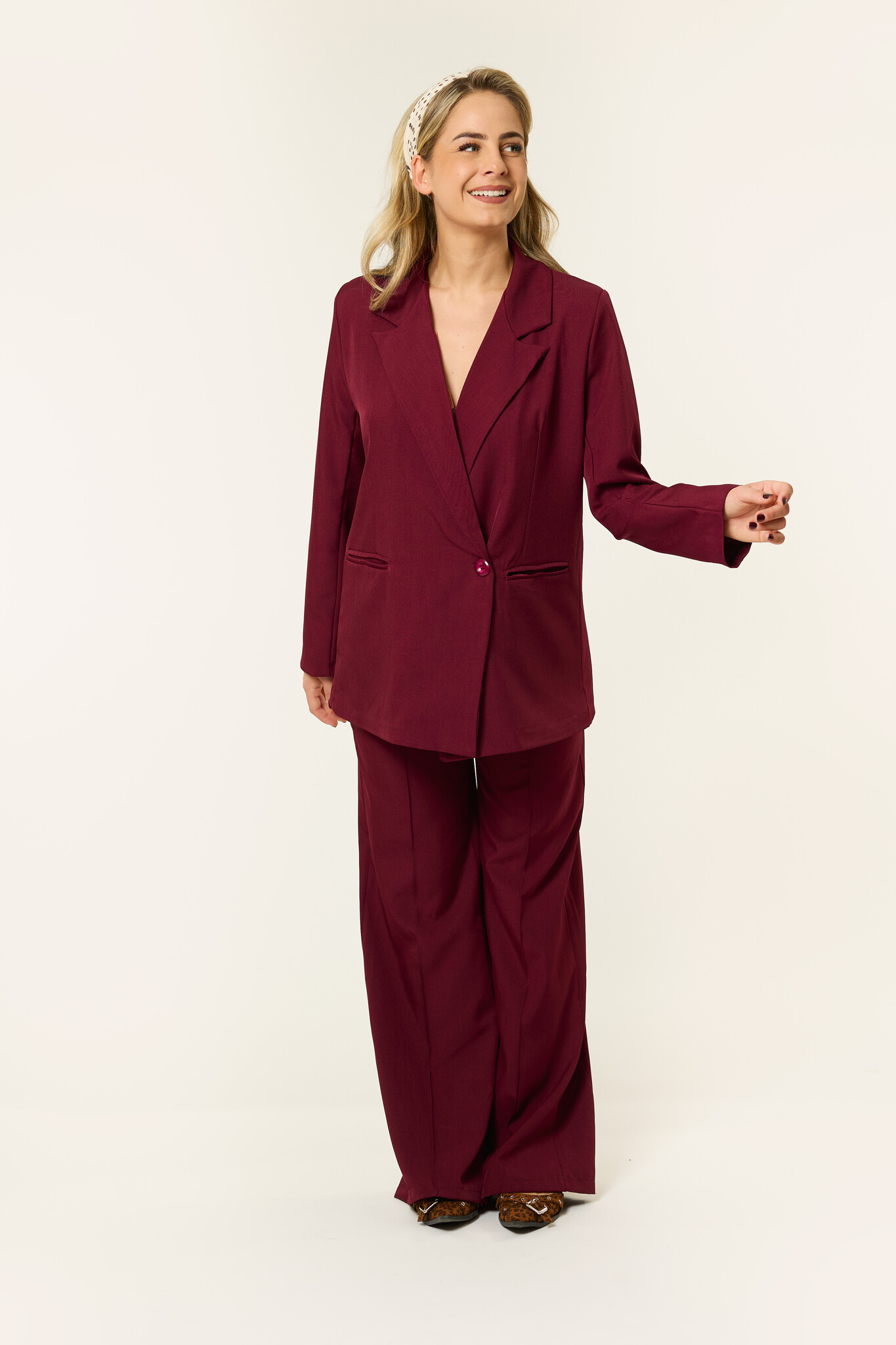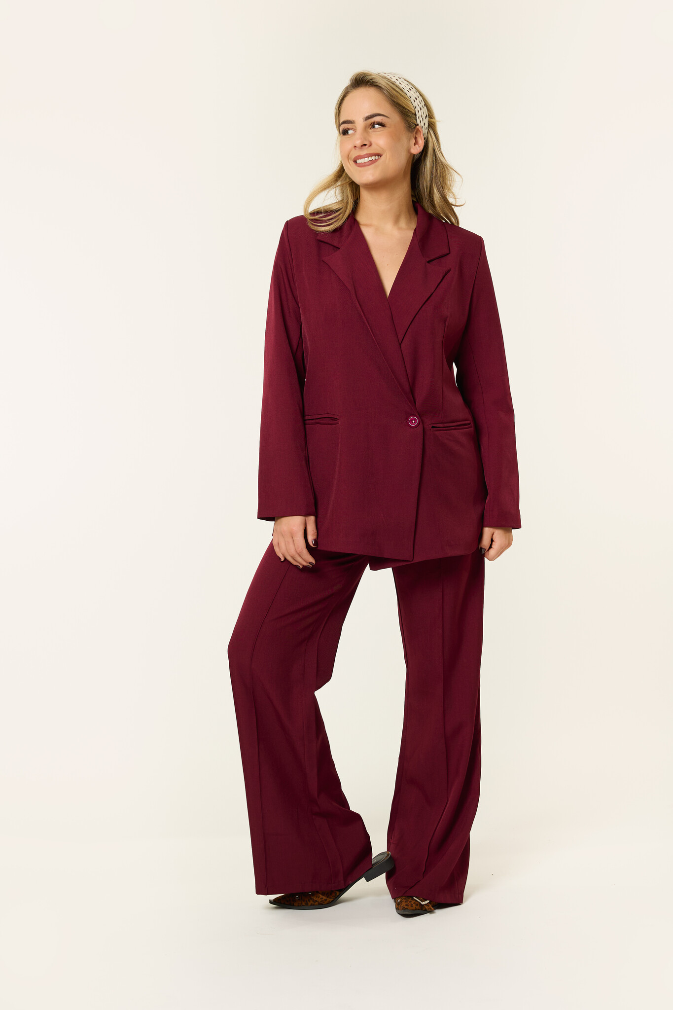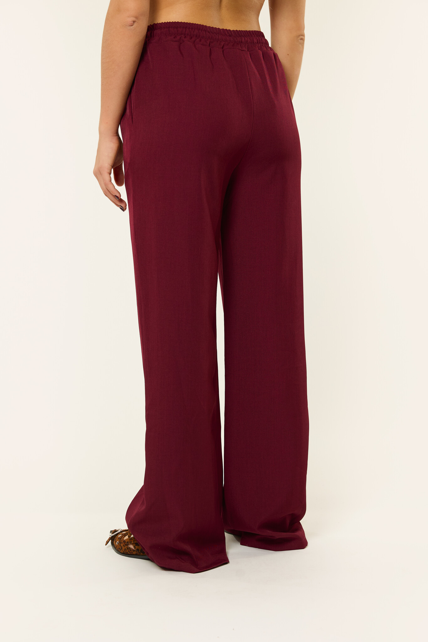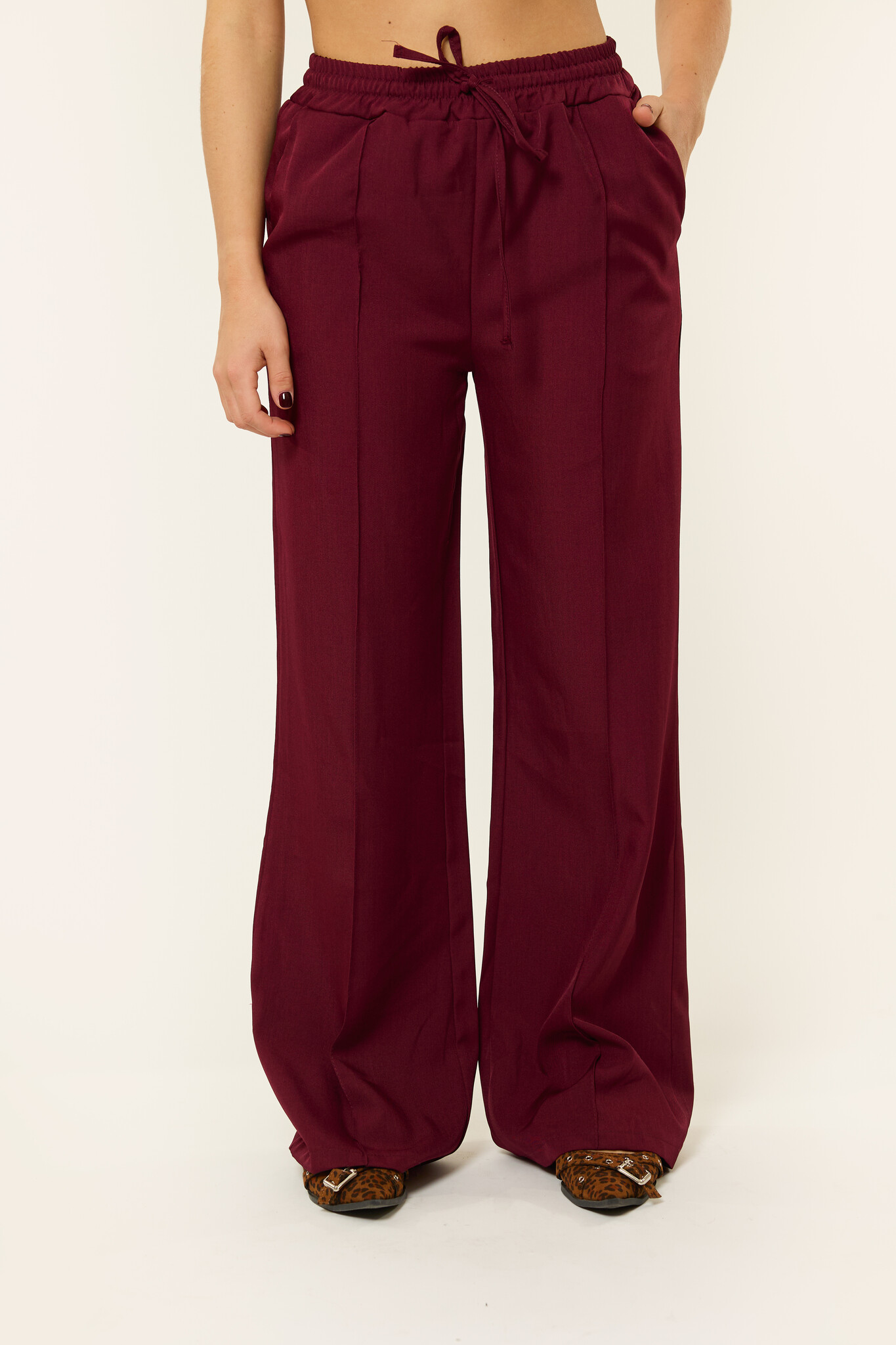 Deze burgundy wide leg broek met elastische taille is zo’n basic waar je altijd op kunt terugvallen. De donkerrode pantalon dames heeft een comfortabele stretchy band met strikkoord, rechte pijpen en een nette plooi voor een mooie look. Dankzij de soepele stof zit de wide leg broek bruin heerlijk, terwijl hij toch netjes oogt. Perfect voor kantoor, een casual dag of gecombineerd met een blouse voor een avondje uit of met de bijpassende Noortje blazer. Een tijdloze broek die je outfit meteen een rustige, chique vibe geeft.