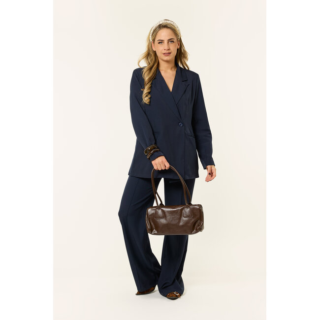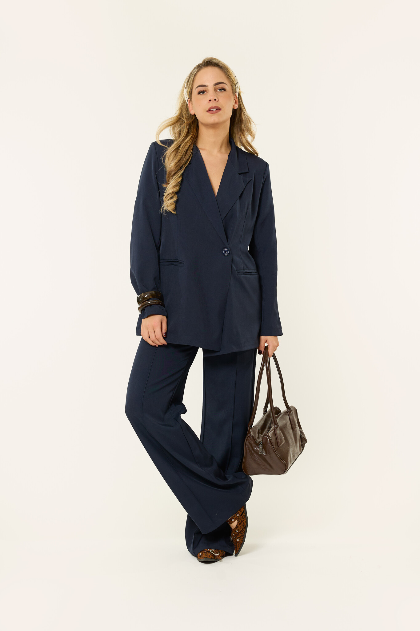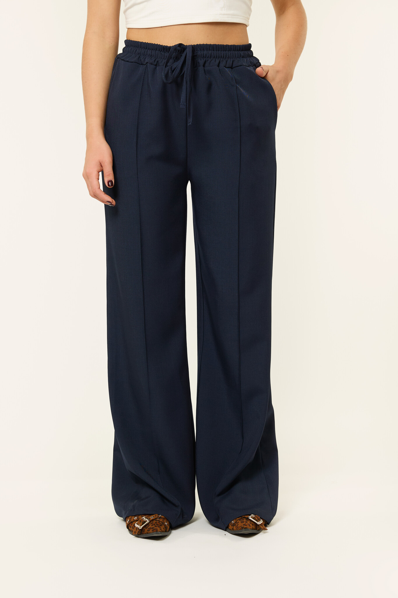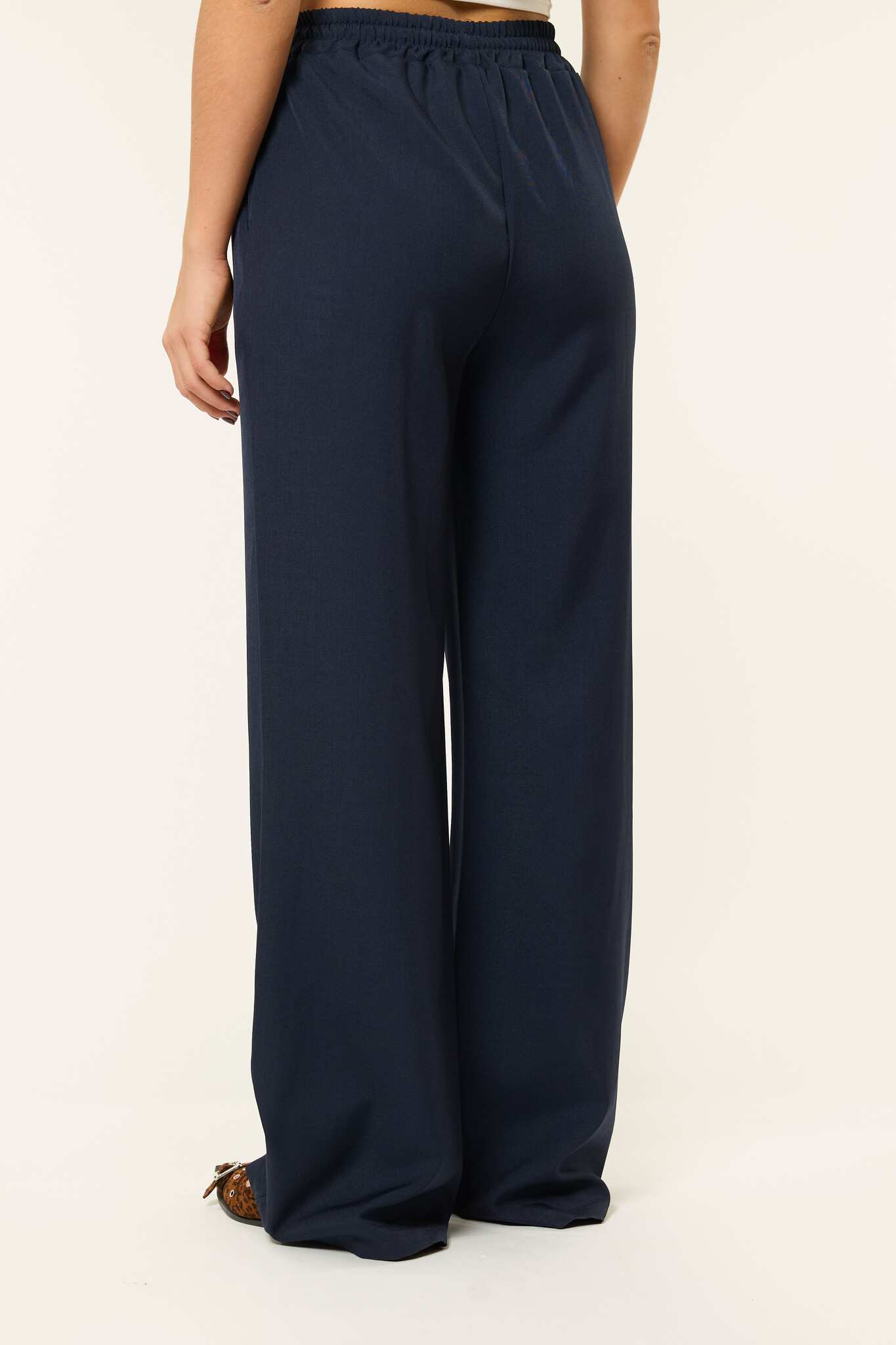 Deze navy blue wide leg broek met elastische taille is zo’n basic waar je altijd op kunt terugvallen. De donkerblauwe pantalon dames heeft een comfortabele stretchy band met strikkoord, rechte pijpen en een nette plooi voor een mooie look. Dankzij de soepele stof zit de wide leg broek bruin heerlijk, terwijl hij toch netjes oogt. Perfect voor kantoor, een casual dag of gecombineerd met een blouse voor een avondje uit of met de bijpassende Noortje blazer. Een tijdloze broek die je outfit meteen een rustige, chique vibe geeft.