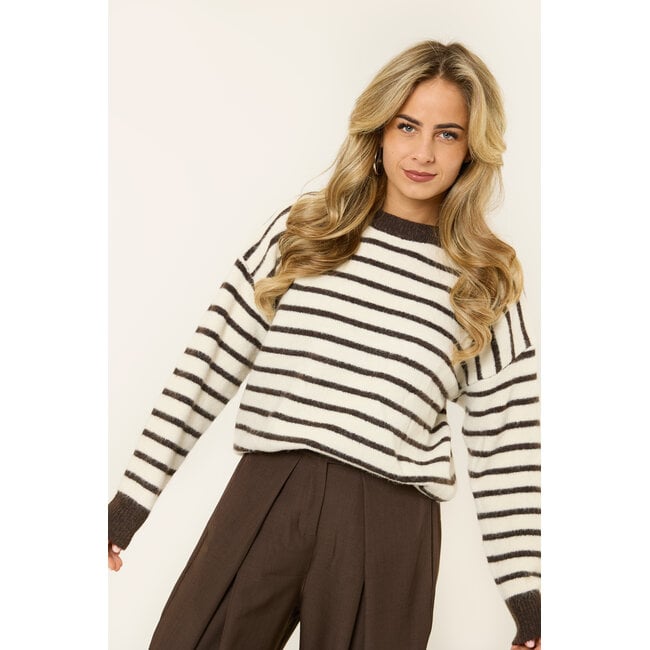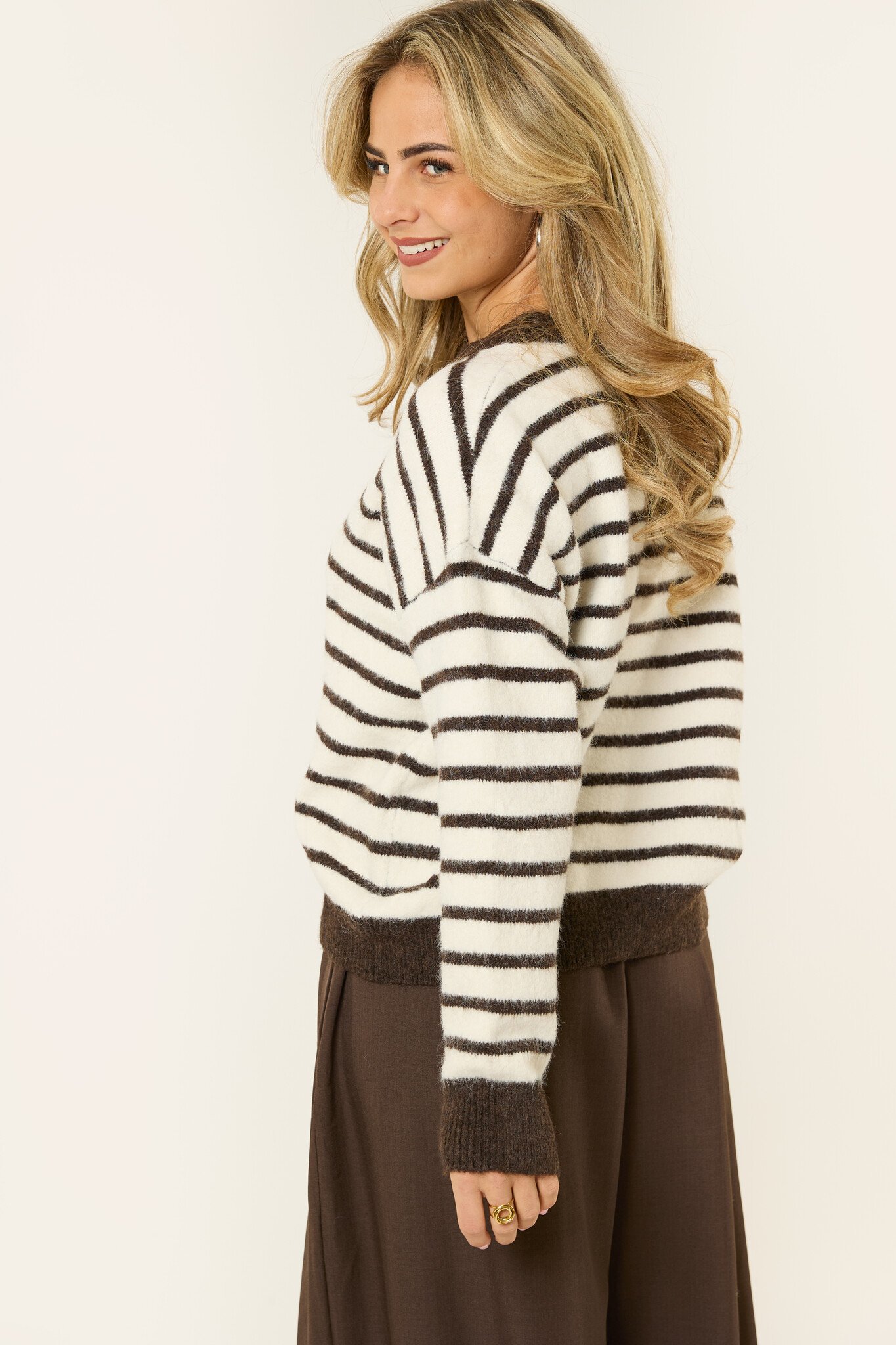 Deze gestreepte trui is zo’n item dat je er makkelijk bij pakt. De zachte stof en losse fit zorgen voor een comfortabele, cozy look, terwijl het streeppatroon hem net wat speelser maakt. Fijn om casual te dragen met een jeans, maar ook leuk te combineren met een nette broek voor een meer aangeklede outfit. Comfortabel, stijlvol en makkelijk te combineren: een echte everyday favoriet.