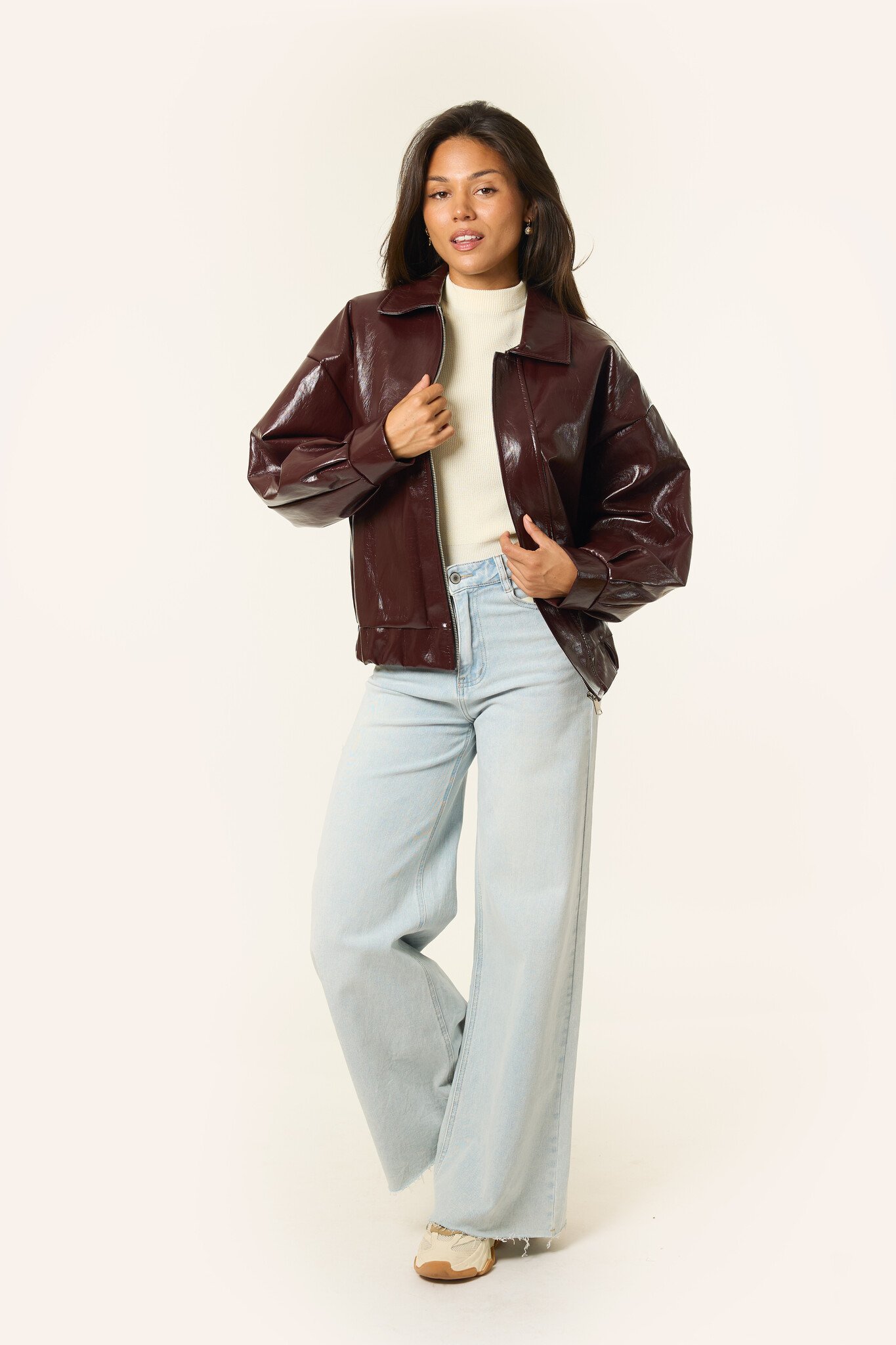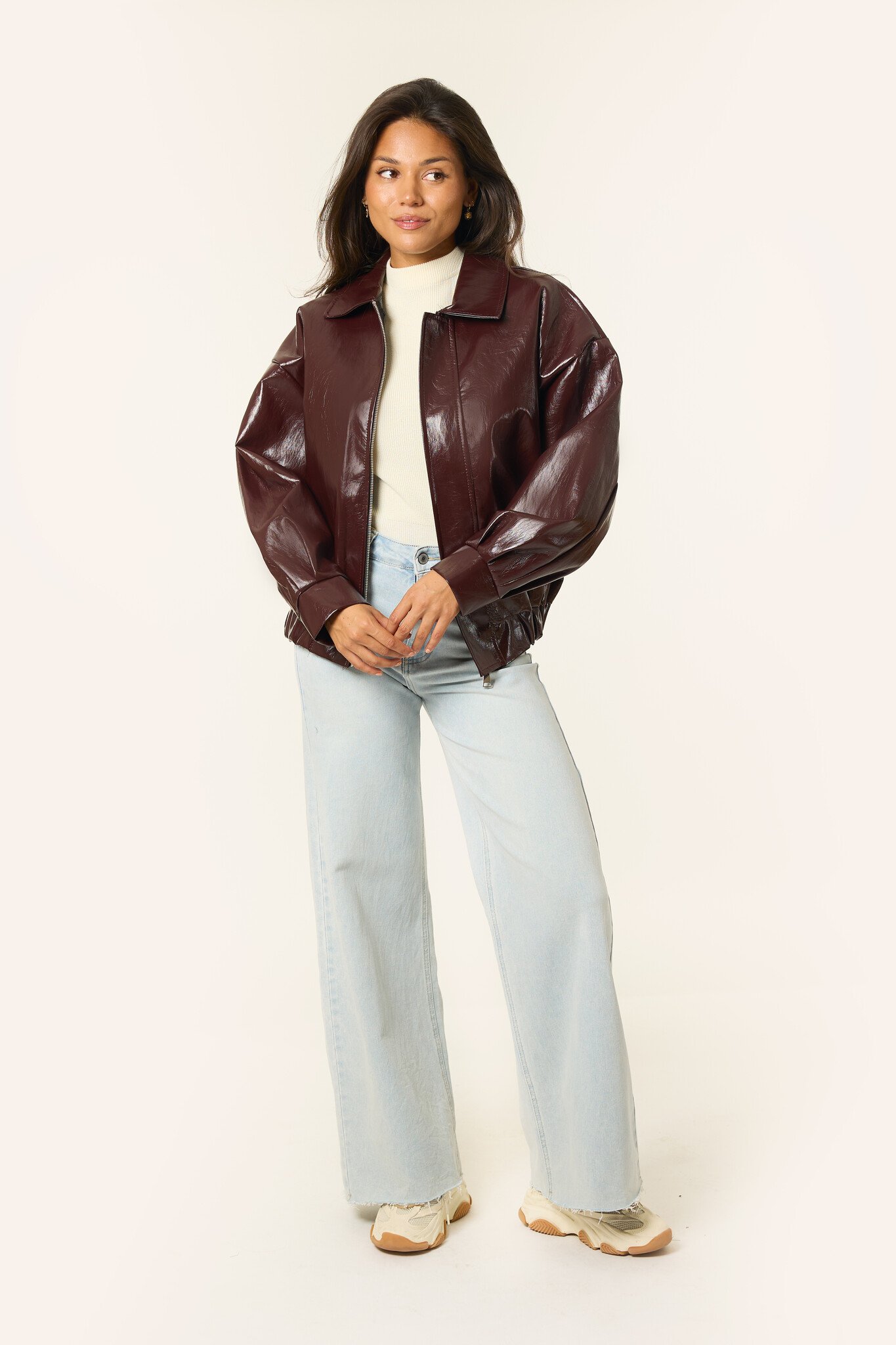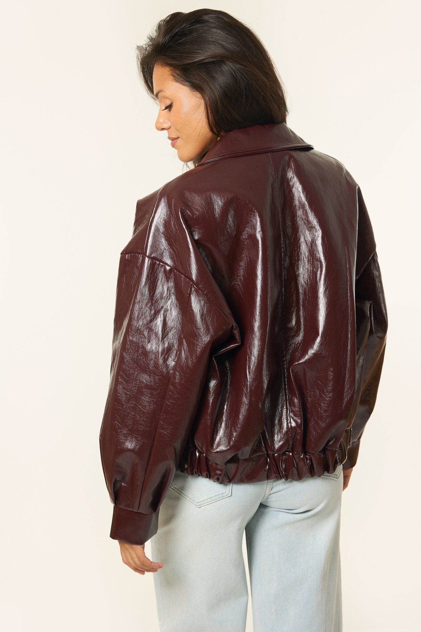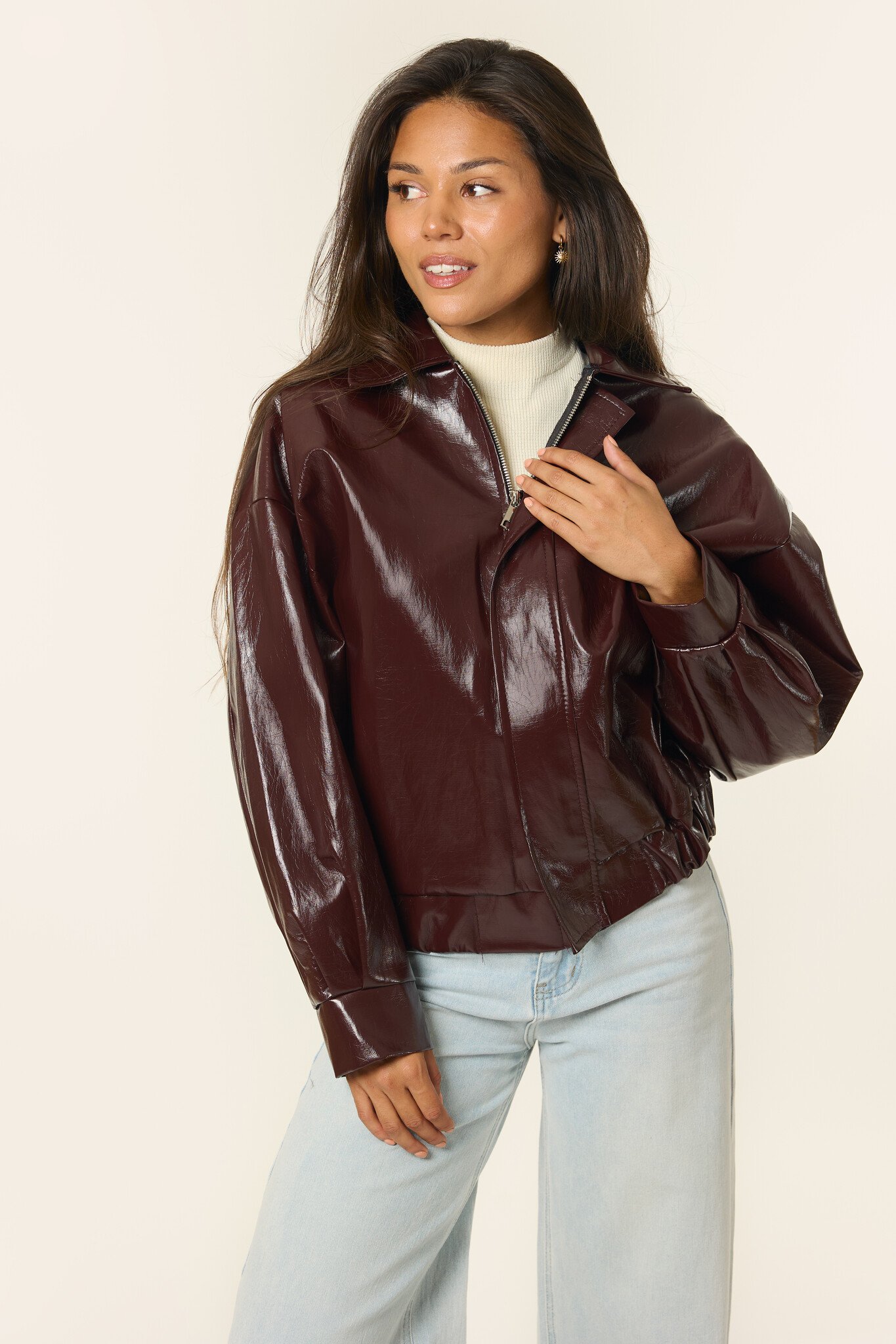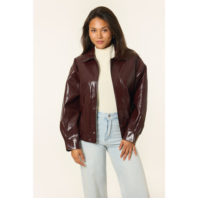 Deze burgundy rode leren bomberjas is de perfecte tussenjas voor deze herfst. Door de trendkleur cherry red is de jas super makkelijk te stylen met bijvoorbeeld een jeans en top. Deze jas is een statement piece that you need!