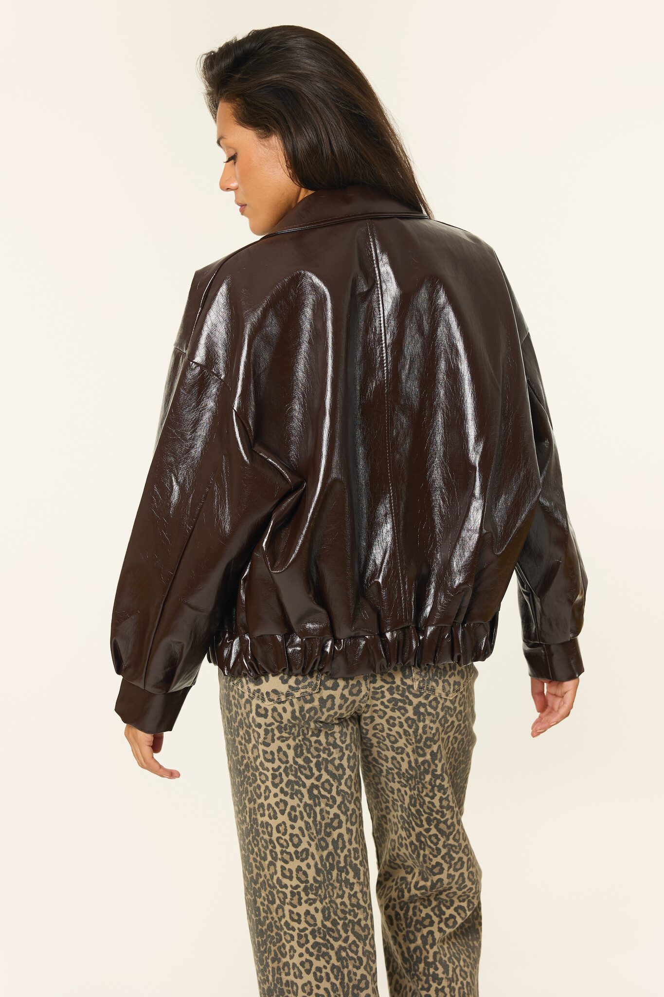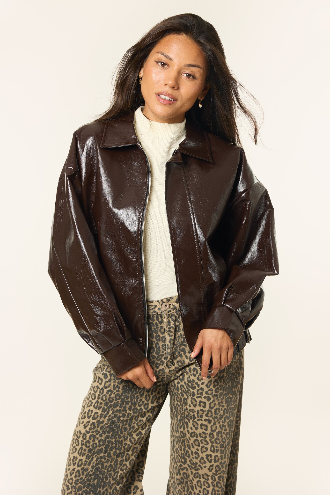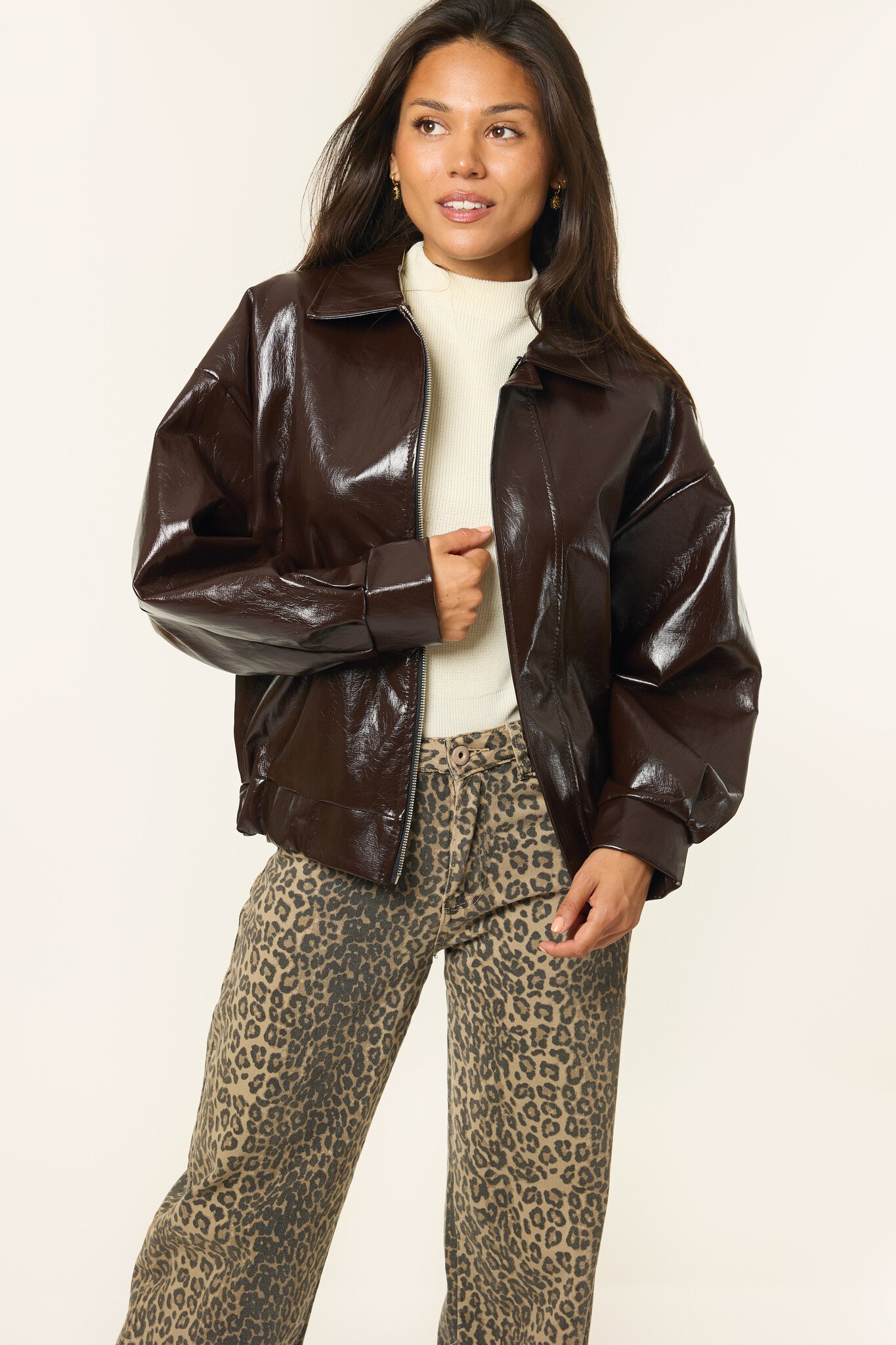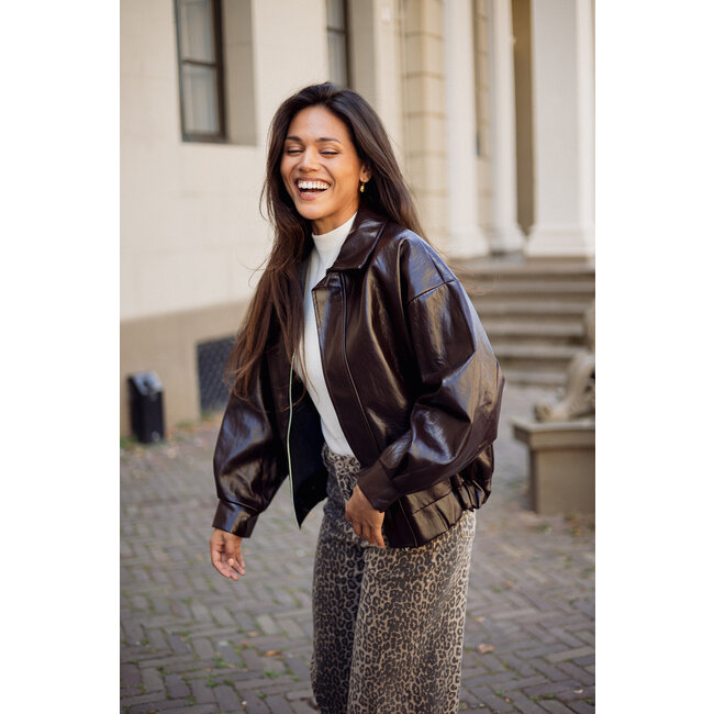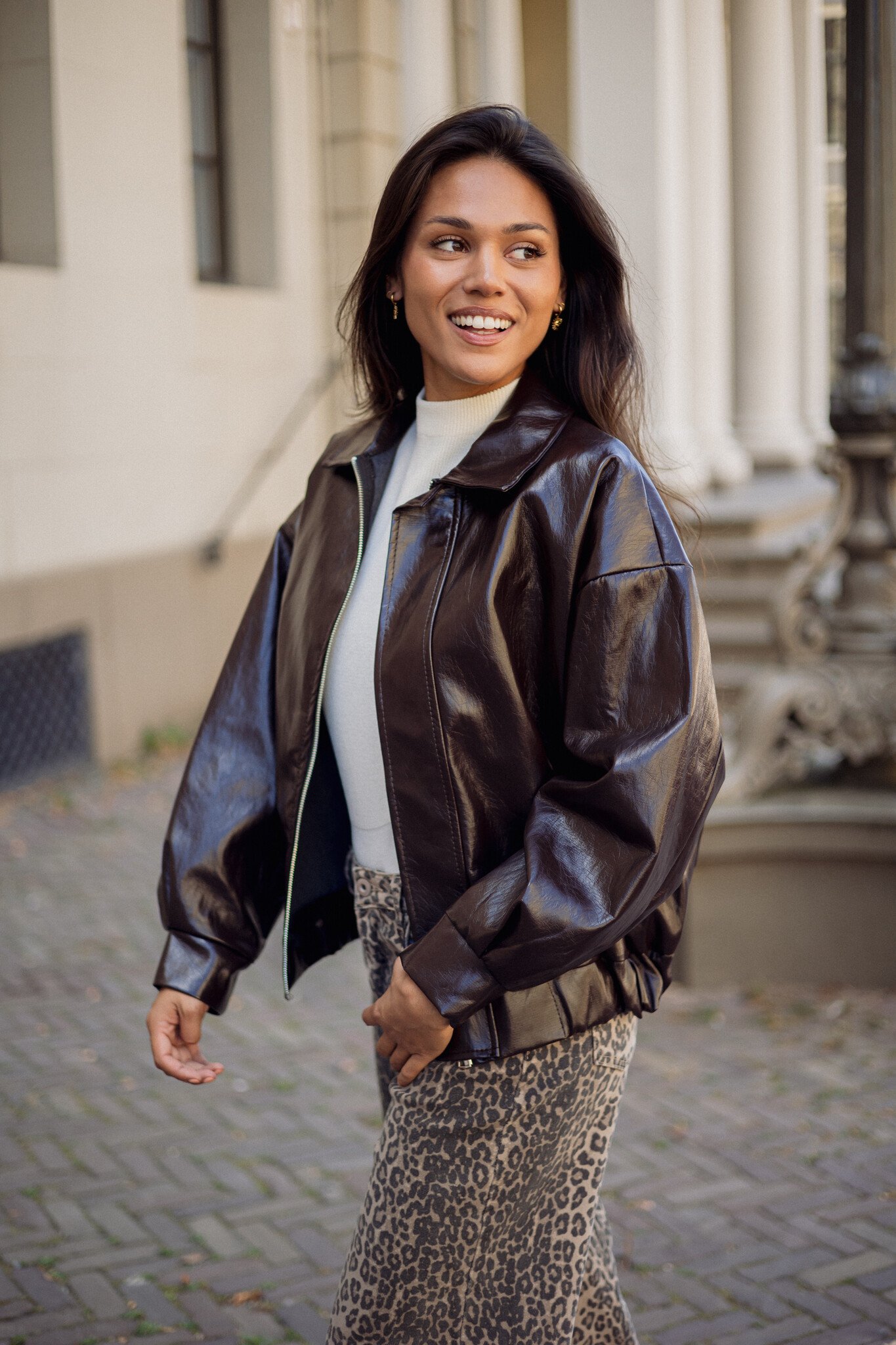 Deze donkerbruine leren bomberjas is de perfecte tussenjas voor deze herfst. Door de trendkleur donkerbruin is de jas super makkelijk te stylen met bijvoorbeeld een jeans en top. Deze jas is een statement piece that you need!