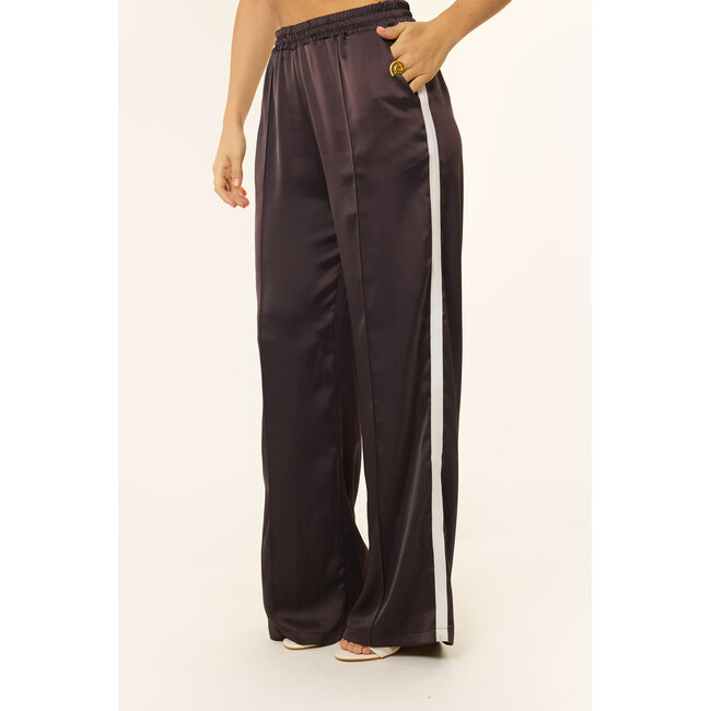 Deze bruine satijnen pantalon geeft elke outfit een chique touch. De soepelvallende stof en glanzende finish zorgen voor een luxe uitstraling, terwijl de witte zijstreep een sportieve twist toevoegt. Dankzij de elastische tailleband zit hij supercomfortabel, perfect voor zowel een casual daglook met sneakers als een avondlook met hakken.
