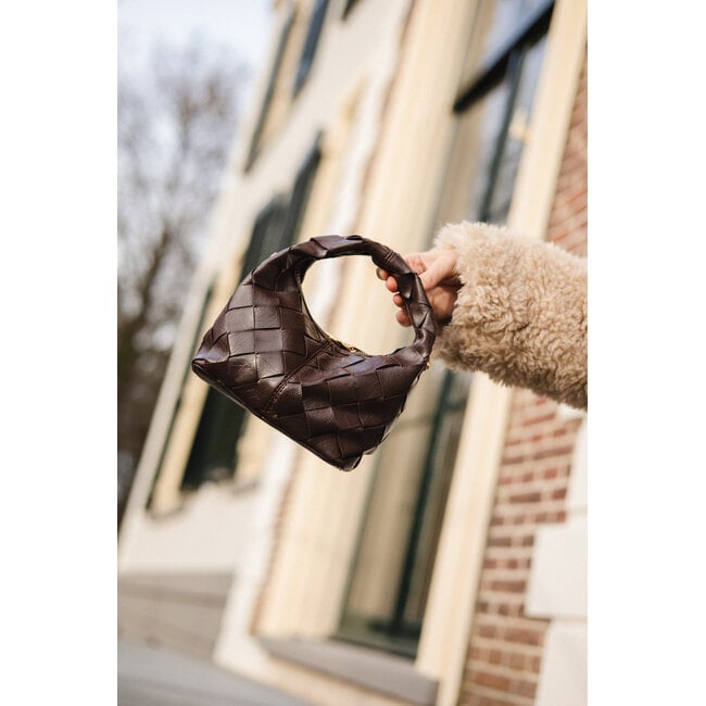 Deze bruine gevlochten polly handtas is een echte eyecatcher die je outfit direct een trendy en fashionable touch geeft. Het compacte formaat, het korte hengsel en het geweven design zorgen voor een unieke en trendy look. De warme bruine kleur maakt de tas makkelijk te combineren met al je favoriete outfits.