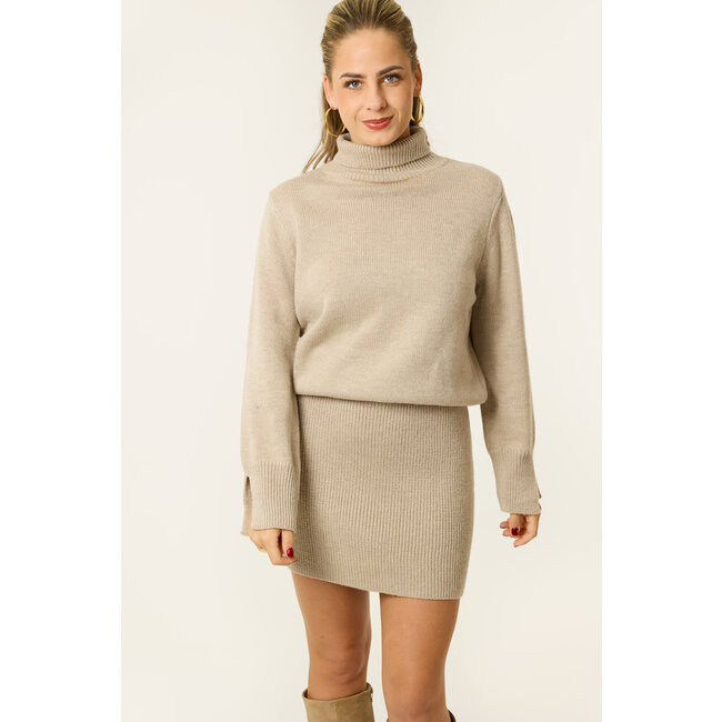 Deze gebreide set bestaat uit een aangesloten mini-rok en een high neck sweater met rechte fit. De zachte knitstof voelt heerlijk aan en is perfect voor frisse dagen. Draag de set casual met sneakers of juist classy met laarzen, alles kan met deze veelzijdige herfstfavoriet.