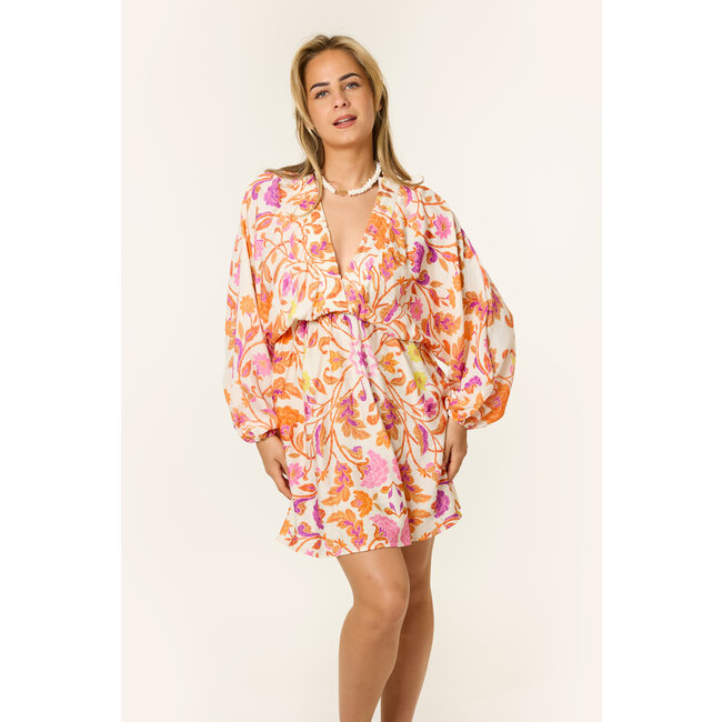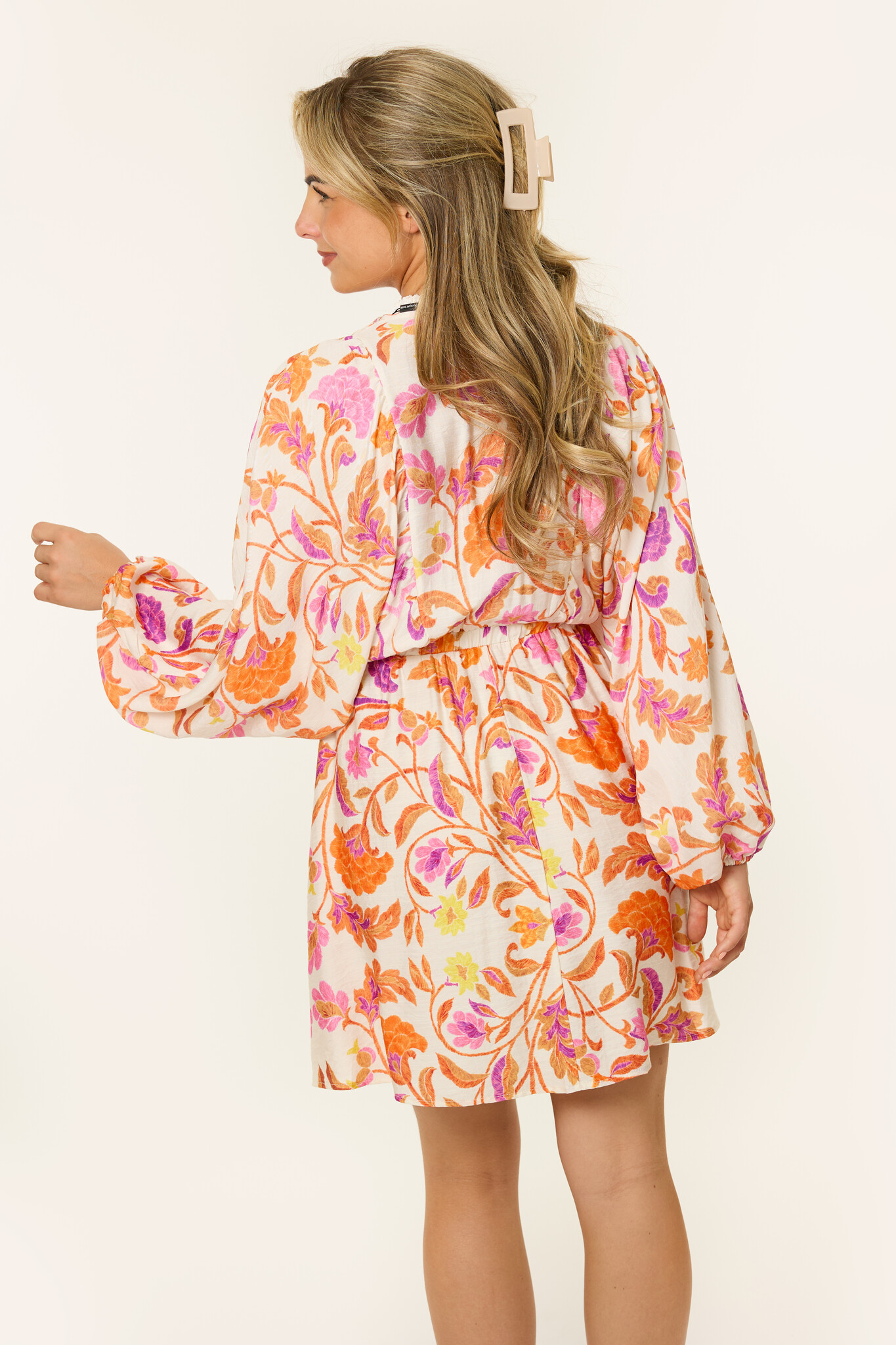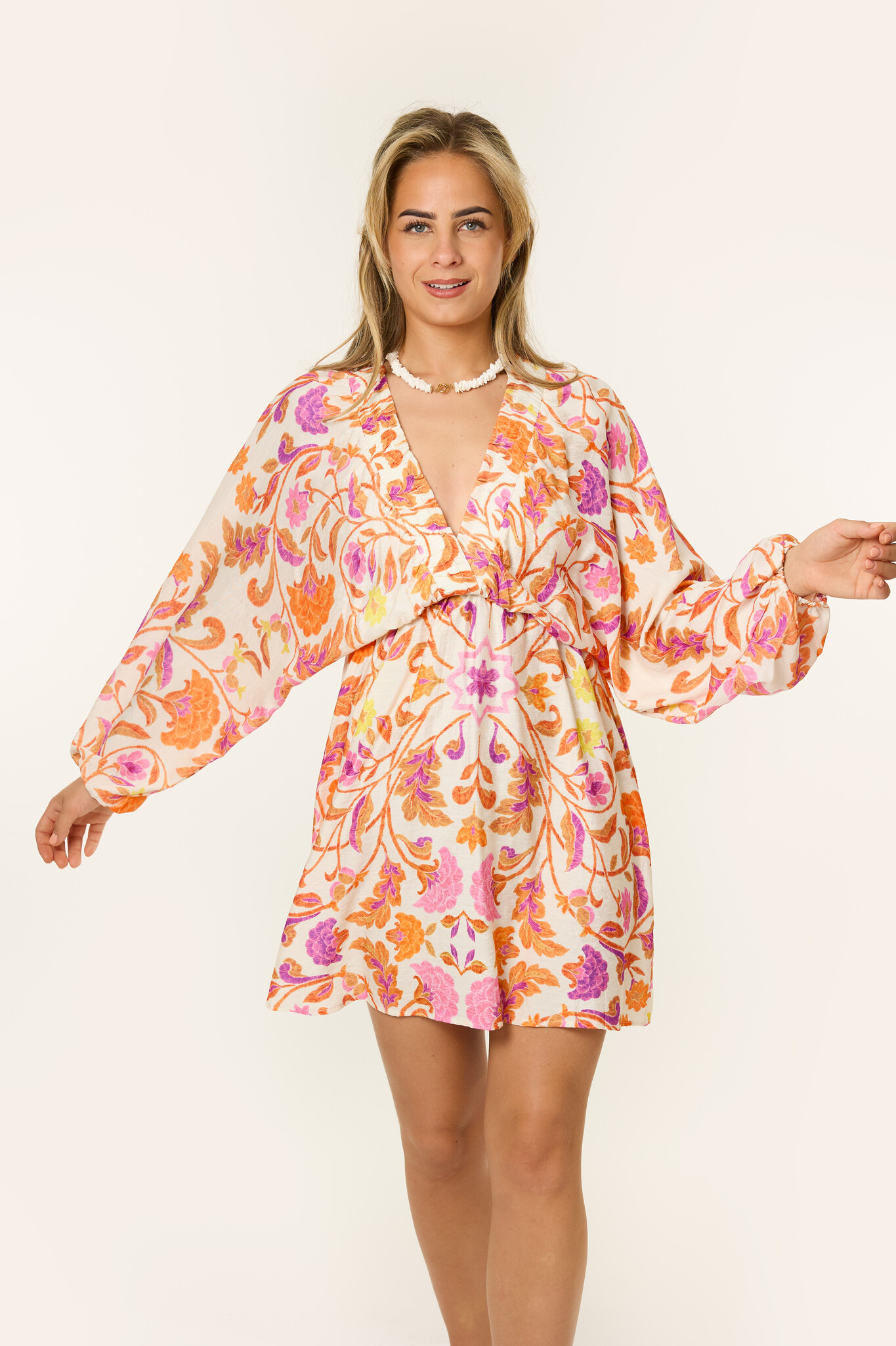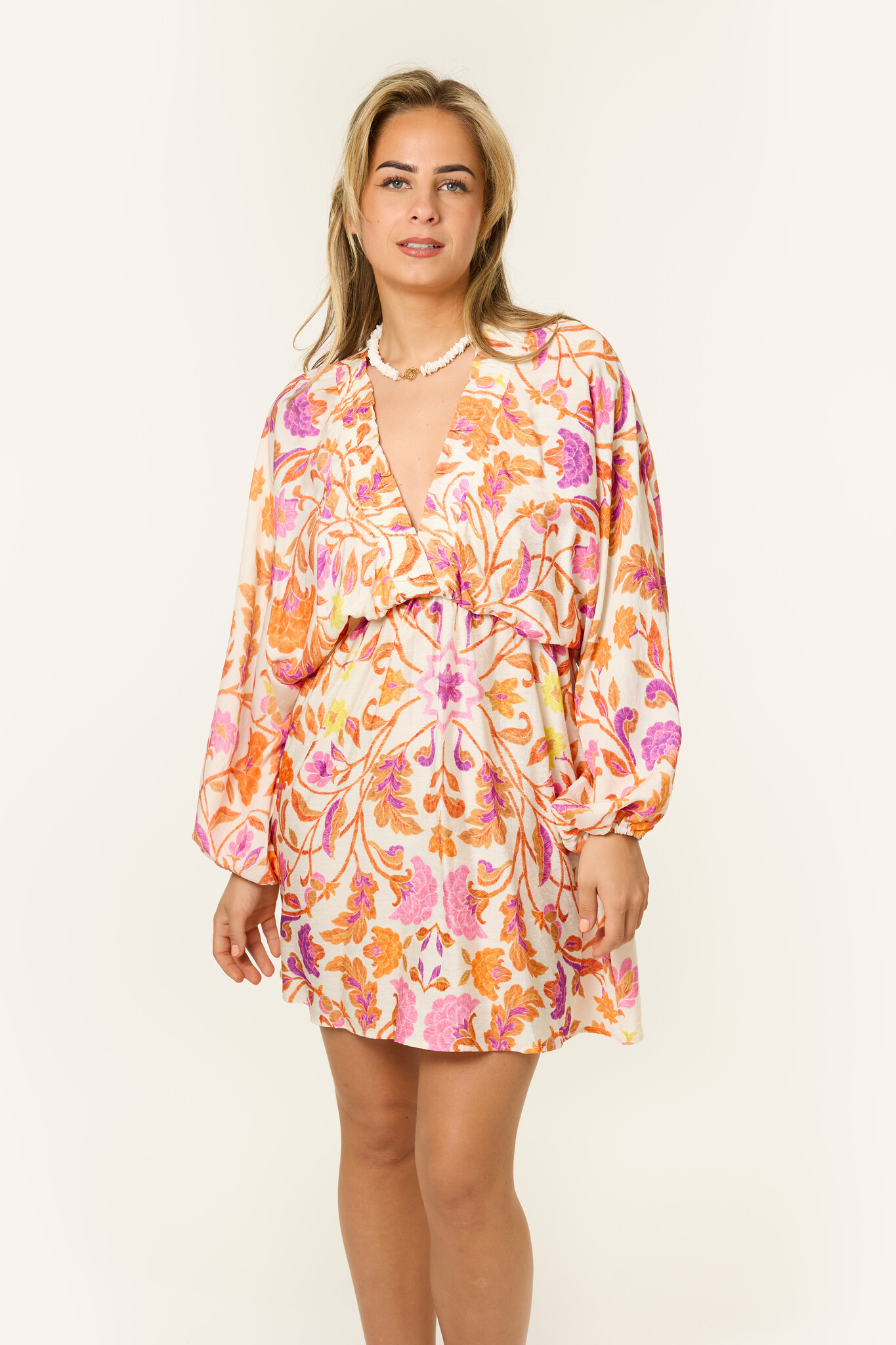 Voeg net dat beetje extra toe aan je garderobe met dit super leuke beige jurkje met lange mouwen. De jurk heeft een bloemenprint in roze en oranje tinten en heeft een vrouwelijke getailleerde pasvorm die zowel comfortabel als flatterend is. De soepele stof en lange mouwen maken dit jurkje perfect voor zowel het voorjaar als de zomer en voor elke occasion. Draag het bloemenjurkje met sandalen voor een casual look, of met hakken en sieraden voor bijvoorbeeld een 21 diner!