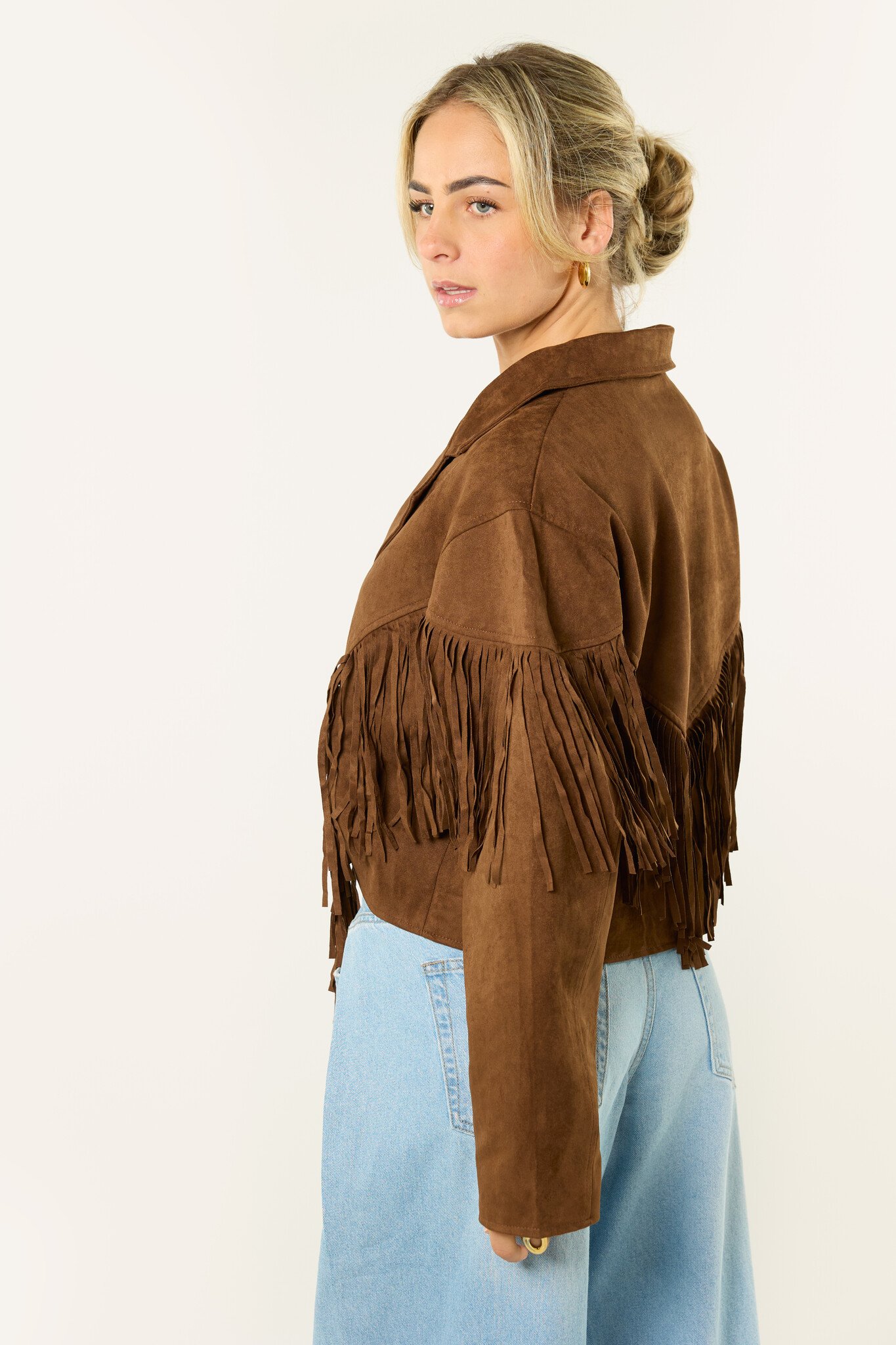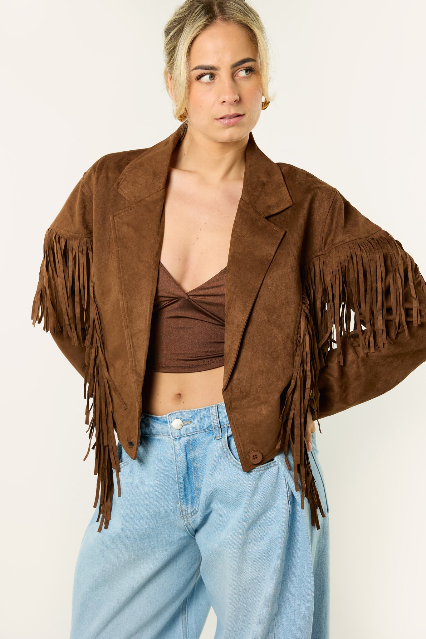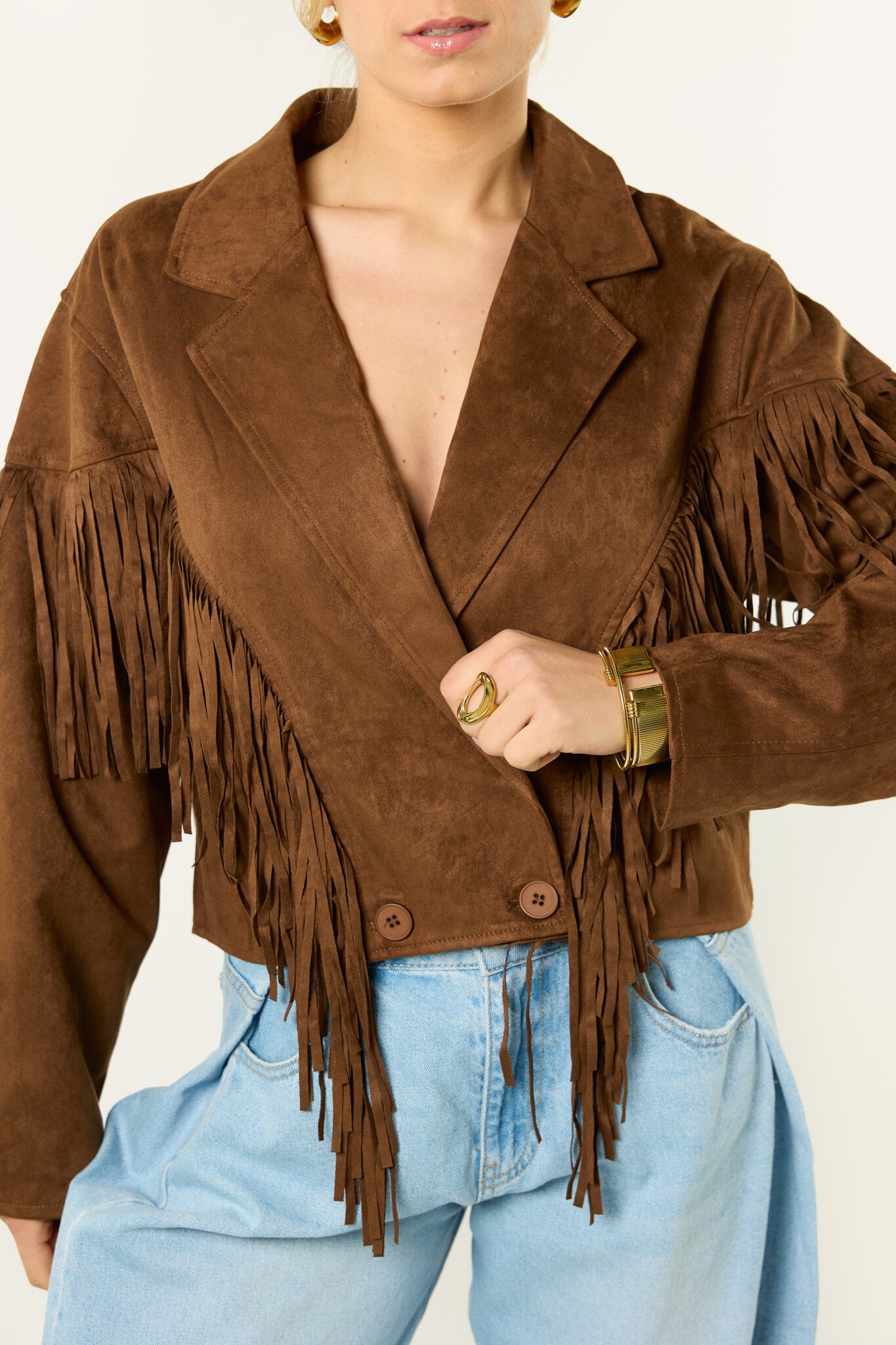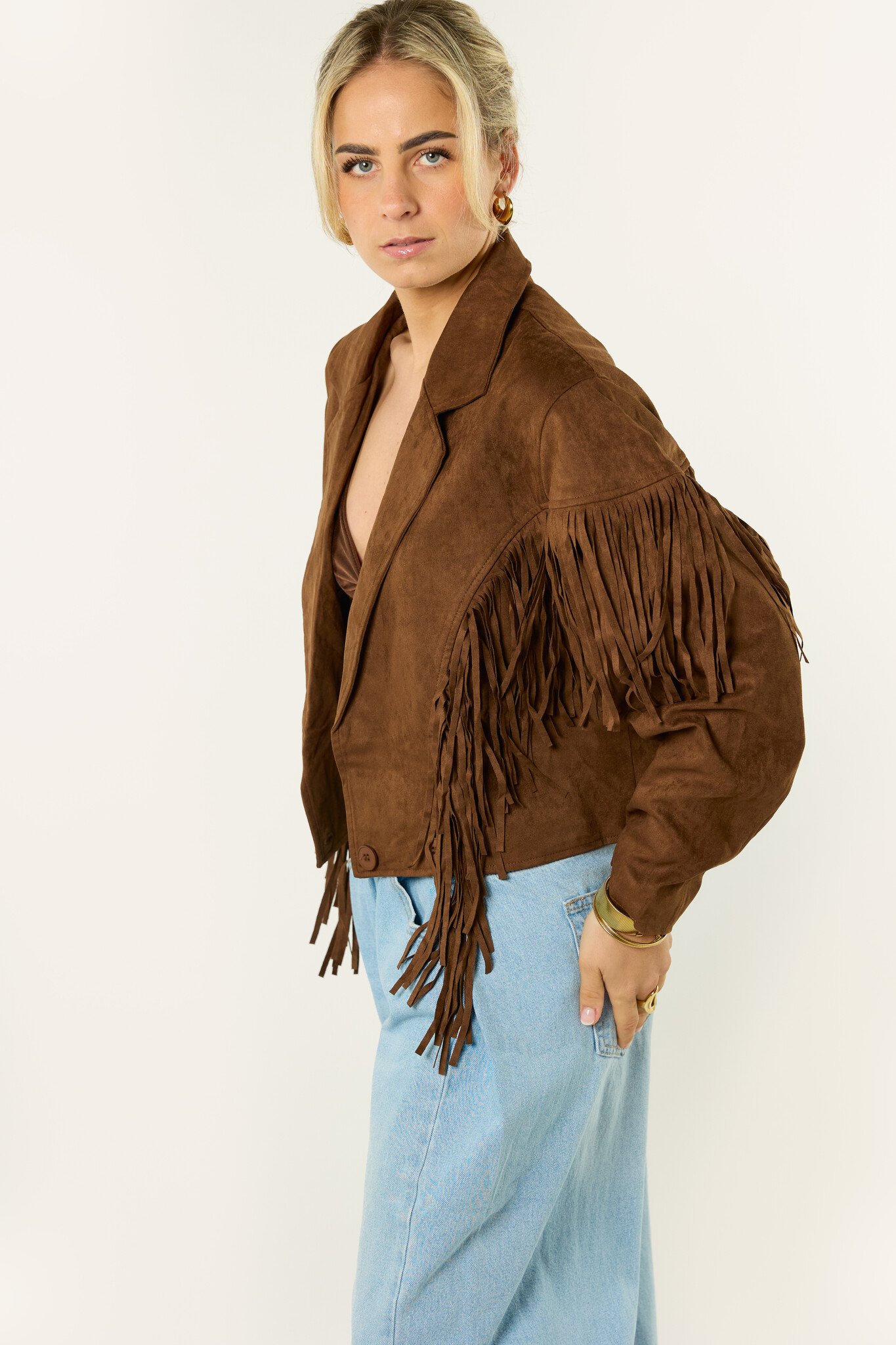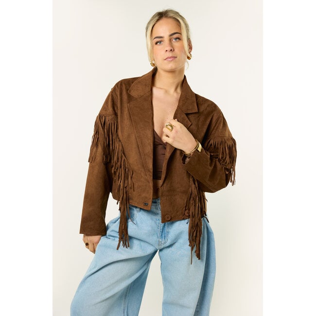 Deze bruine jas met franjes is een echte eyecatcher. De suède look en franjes geven de jas een boho en western vibe, terwijl de korte fit zorgt voor een trendy uitstraling. Makkelijk te combineren met een jeans, rokje of jurkje en perfect voor een festival of gewoon voor elke dag. Een leuk item dat je outfit net wat extra’s geeft.