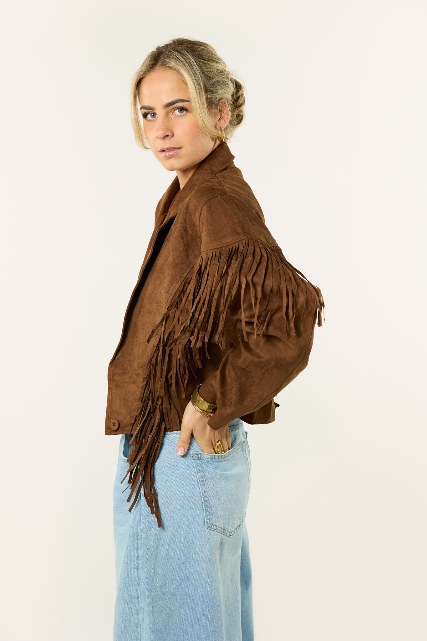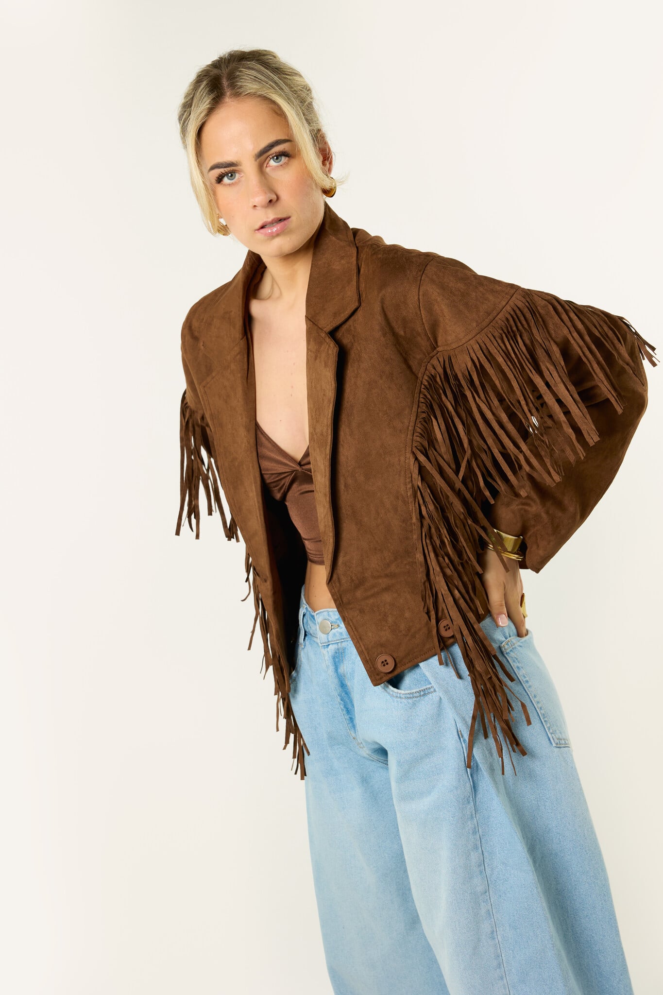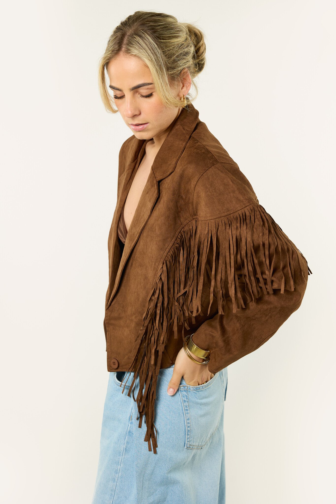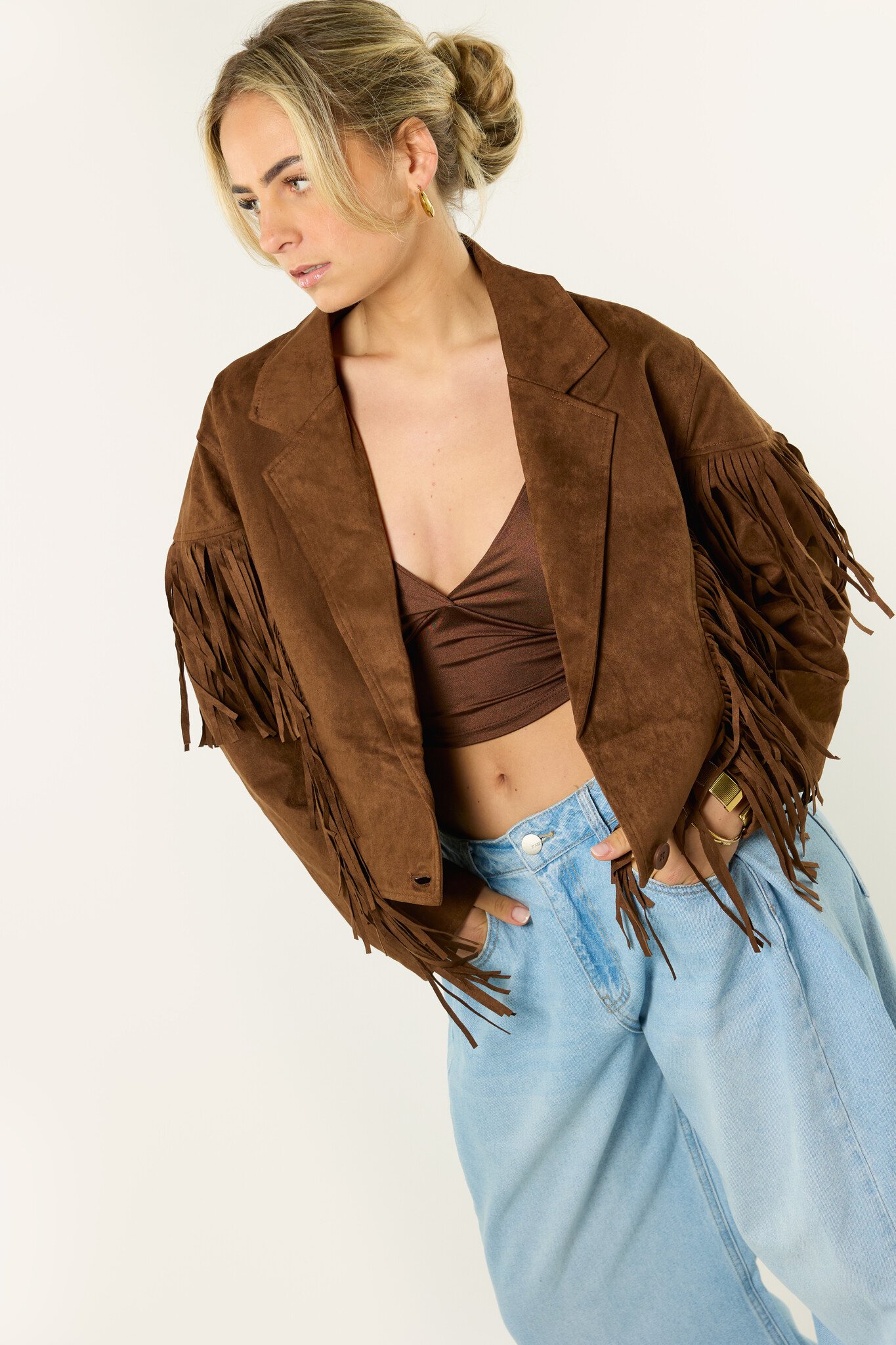 Deze bruine jas met franjes is een echte eyecatcher. De suède look en franjes geven de jas een boho en western vibe, terwijl de korte fit zorgt voor een trendy uitstraling. Makkelijk te combineren met een jeans, rokje of jurkje en perfect voor een festival of gewoon voor elke dag. Een leuk item dat je outfit net wat extra’s geeft.