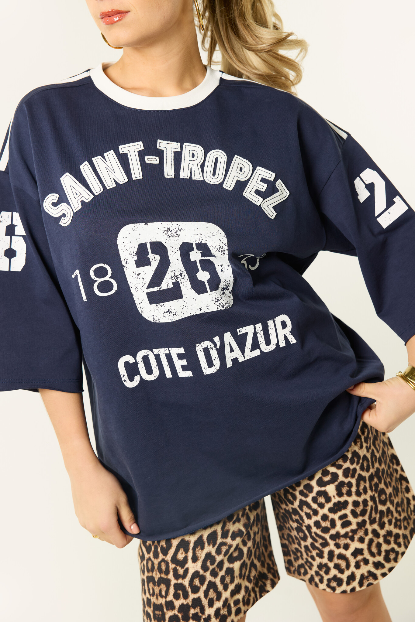 Dit donkerblauwe t-shirt met graphic print is een echte must-have voor het seizoen. De oversized fit en de sportieve Saint-Tropez print geven het shirt een stoere en trendy look. Combineer dit donkerblauwe t-shirt makkelijk met een jeans, short of rok voor een leuke outfit. Perfect voor een festival of een zonnige dag.