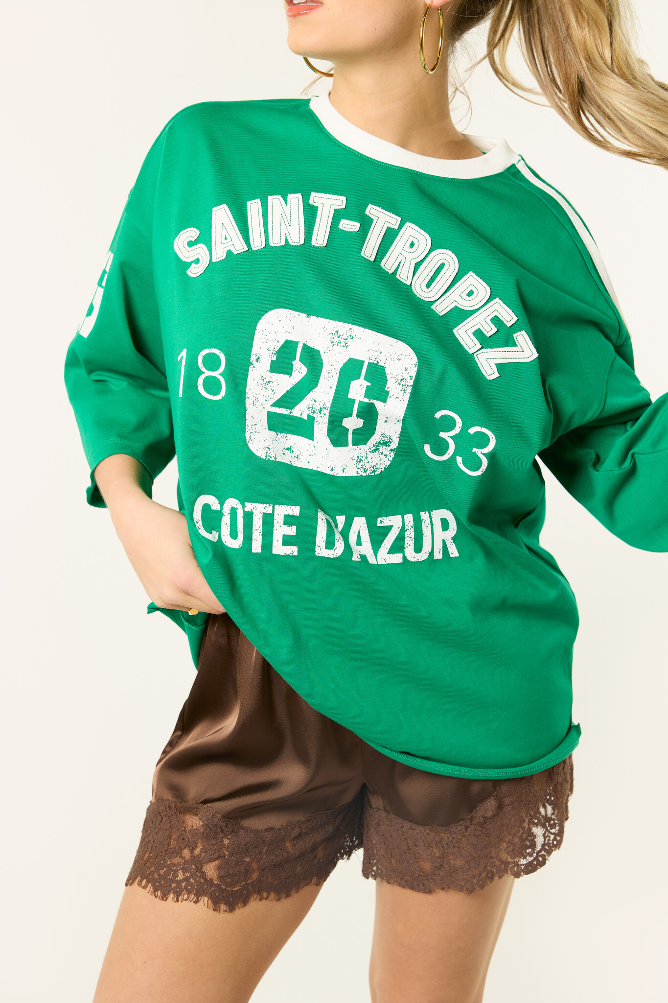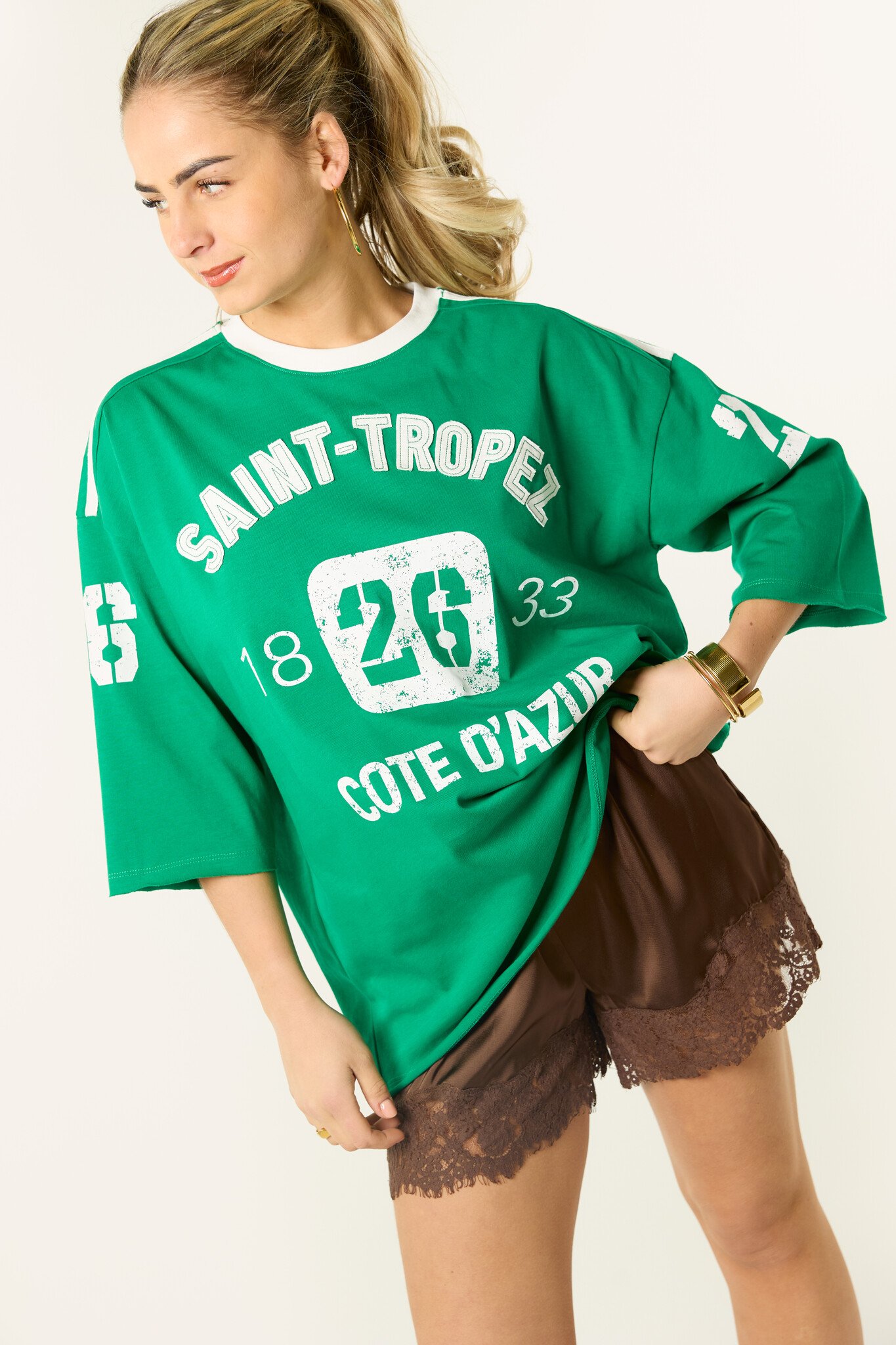 Dit groene t-shirt met graphic print is een echte must-have voor het seizoen. De oversized fit en de sportieve Saint-Tropez print geven het shirt een stoere en trendy look. Combineer dit groene t-shirt makkelijk met een jeans, short of rok voor een leuke outfit. Perfect voor een festival of een zonnige dag.