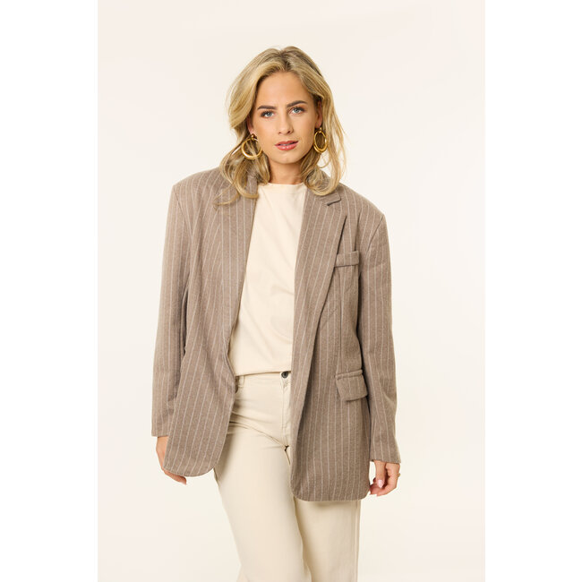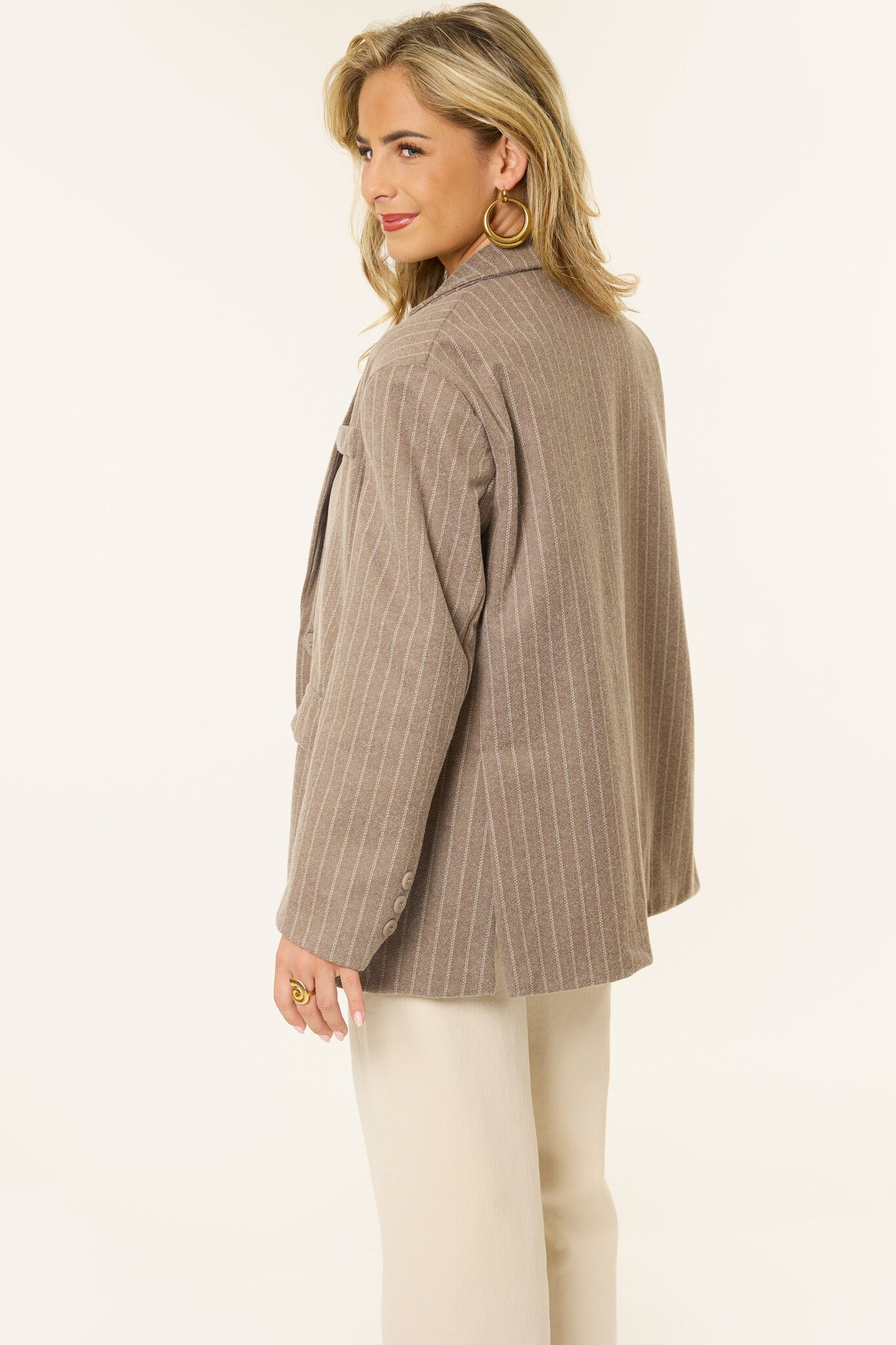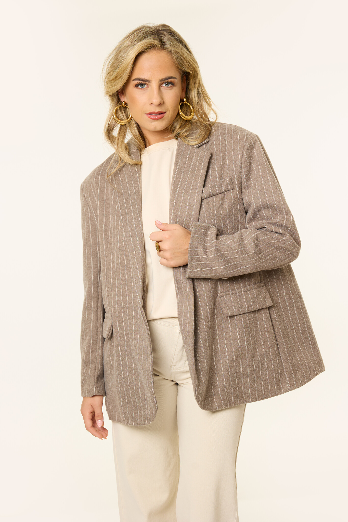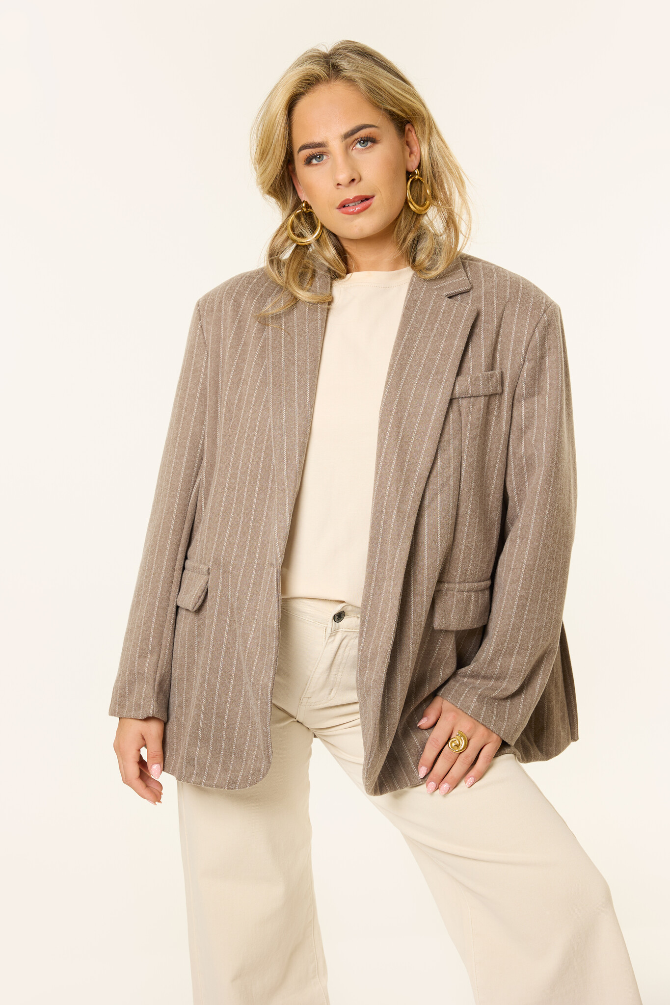 Deze taupe oversized blazer met subtiele strepen is een echte wardrobe essential. Het losse model geeft een oversized fit. Perfect om te dragen over een basic top en jeans, of als tussenjas voor het najaar. De lengte van de blazer is 76 cm.