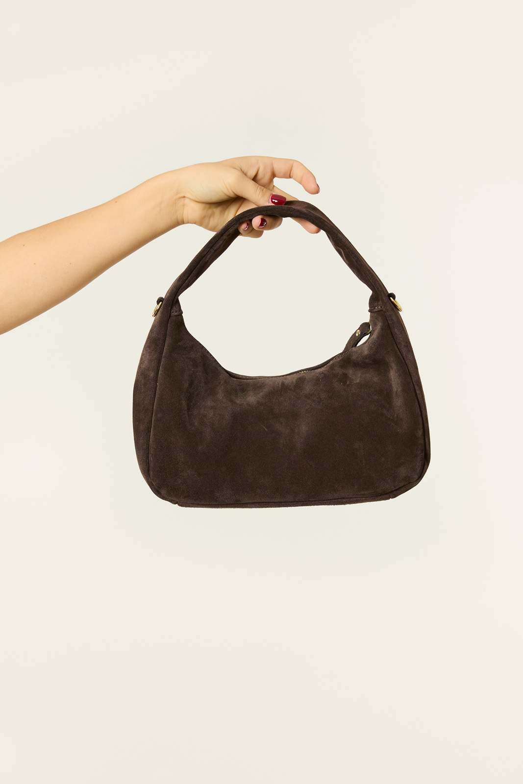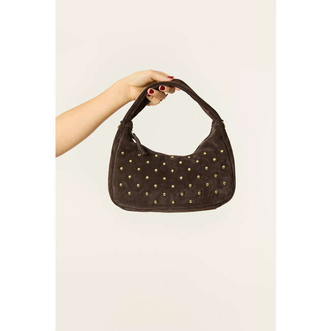 Deze bruine schoudertas met gouden studs is een echte eyecatcher voor je herfst- en winterlook. De zachte suèdelook stof geeft de tas een chique uitstraling, terwijl de goudkleurige studs zorgen voor een fun twist. Dankzij het compacte formaat neem je de tas makkelijk overal mee naartoe, van een dagje shoppen tot een avondje uit. Perfect te combineren met zowel een casual als classy outfit.