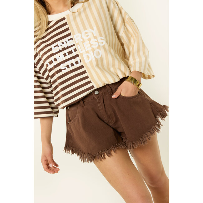 Deze bruine wide fit short is een fijne basic met een trendy twist. De wijde pijpen zorgen voor een mooie pasvorm en de rafelrand geeft de short net wat extra. De bruine short zit comfortabel en is makkelijk te combineren met een t-shirt, top of blouse. Perfect voor warme dagen en een casual zomerse look.