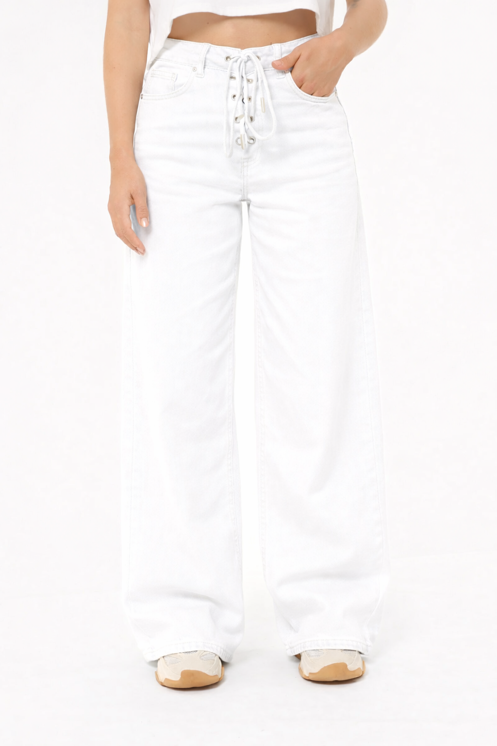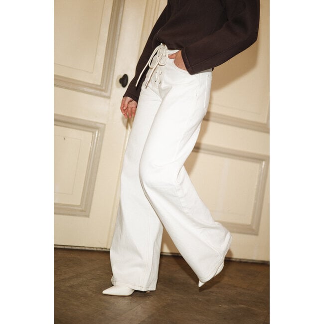 Deze off white wide leg jeans met veters is een trendy en uniek item dat je outfit meteen een stijlvolle uitstraling geeft. De veterdetails aan de voorkant zorgen voor een opvallend detail en de wijde pijpen creëren een mooie, lange pasvorm. De off white kleur maakt deze jeans fris en makkelijk te combineren met al je favoriete tops en blouses. Draag deze off white jeans met veters casual met een trui of combineer met een blouse voor een meer verzorgde look.