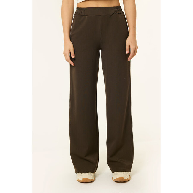 Deze bruine pantalon met witte strepen is een perfecte mix van sportief en chic. De rechte pijpen en hoge taille zorgen voor een flatterende pasvorm, terwijl de soepele stof heerlijk comfortabel zit. De witte strepen langs de zijkant geven de broek een moderne, sportieve uitstraling. Draag de pantalon als set met de bijpassende Sofie bomber jacket of combineer met een knit of blouse voor een effortless, trendy, herfst look.