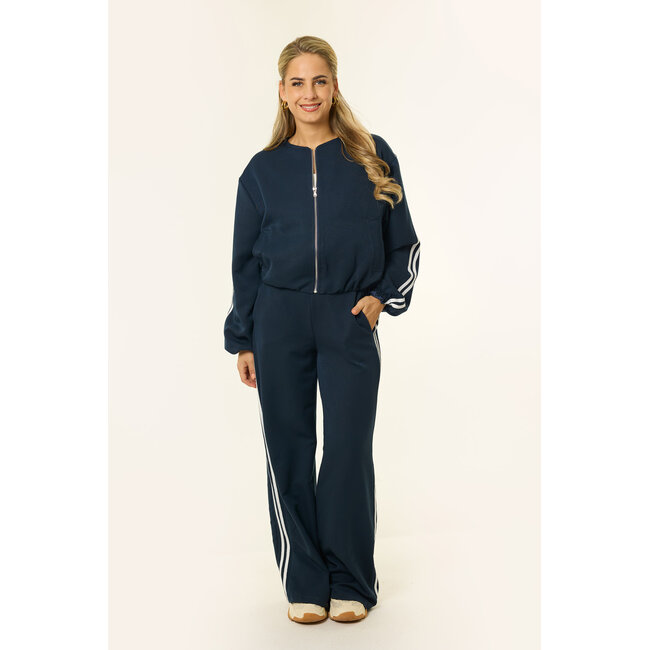 Deze donkerblauwe pantalon met witte strepen is een perfecte mix van sportief en chic. De rechte pijpen en hoge taille zorgen voor een flatterende pasvorm, terwijl de soepele stof heerlijk comfortabel zit. De witte strepen langs de zijkant geven de broek een moderne, sportieve uitstraling. Draag de pantalon als set met de bijpassende Sofie bomber jacket of combineer met een knit of blouse voor een effortless, trendy look.