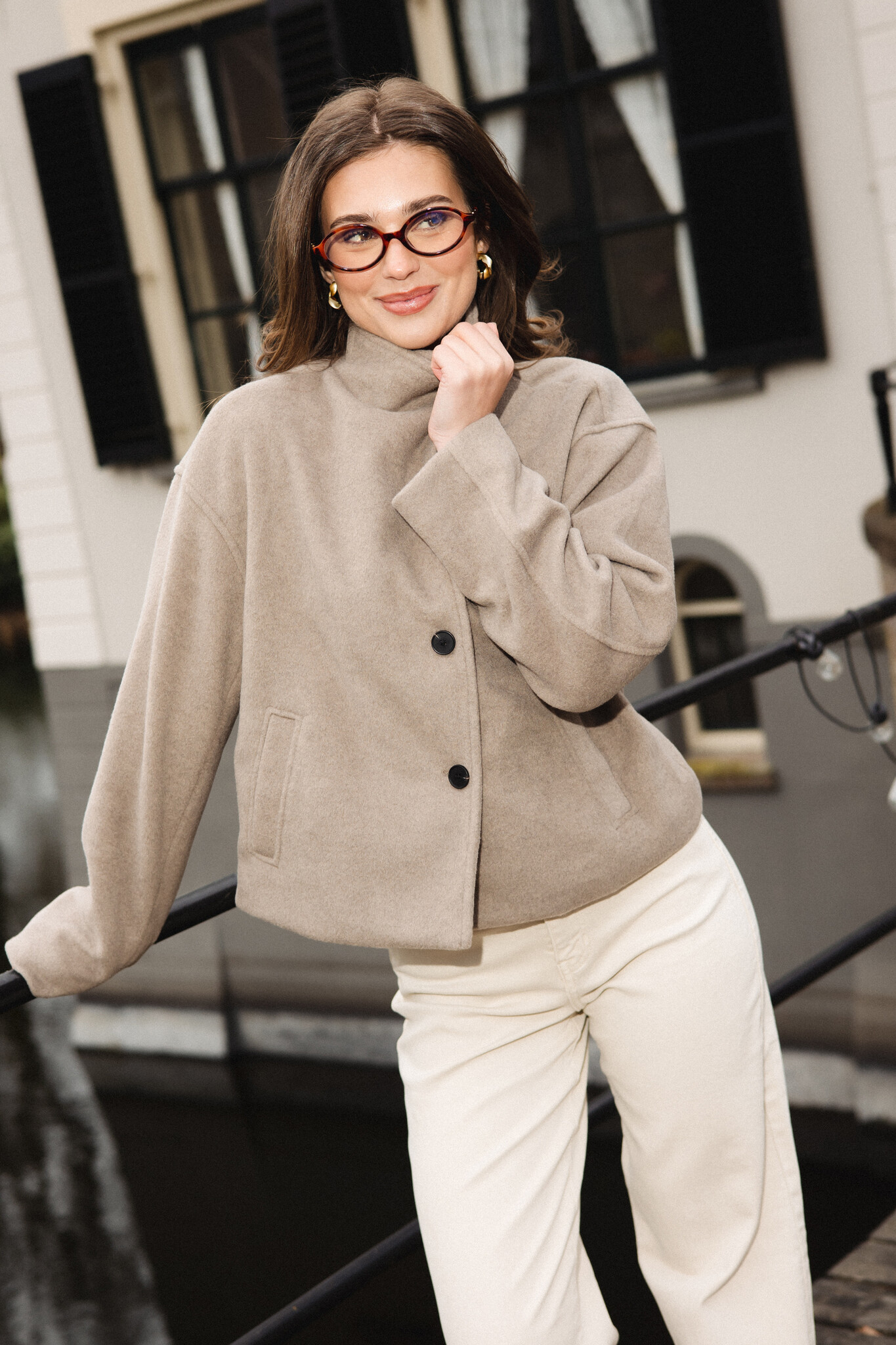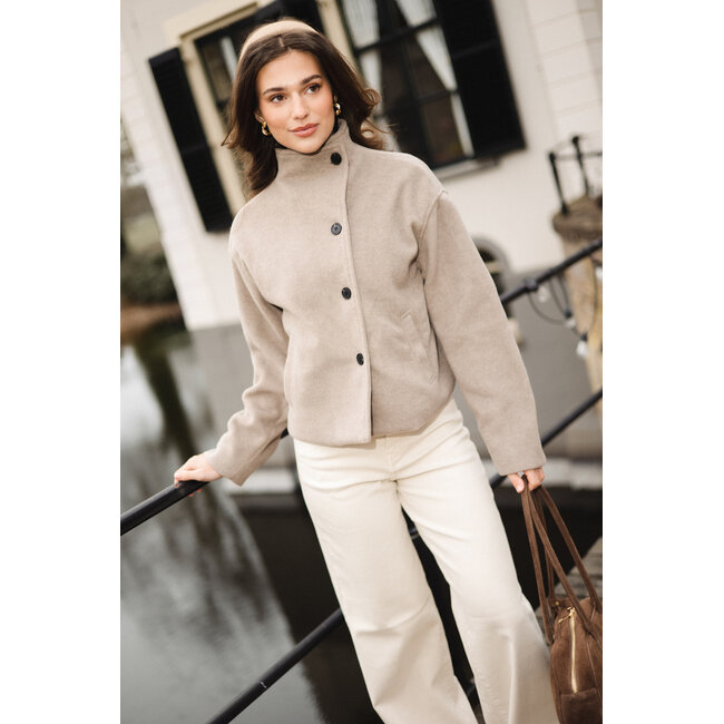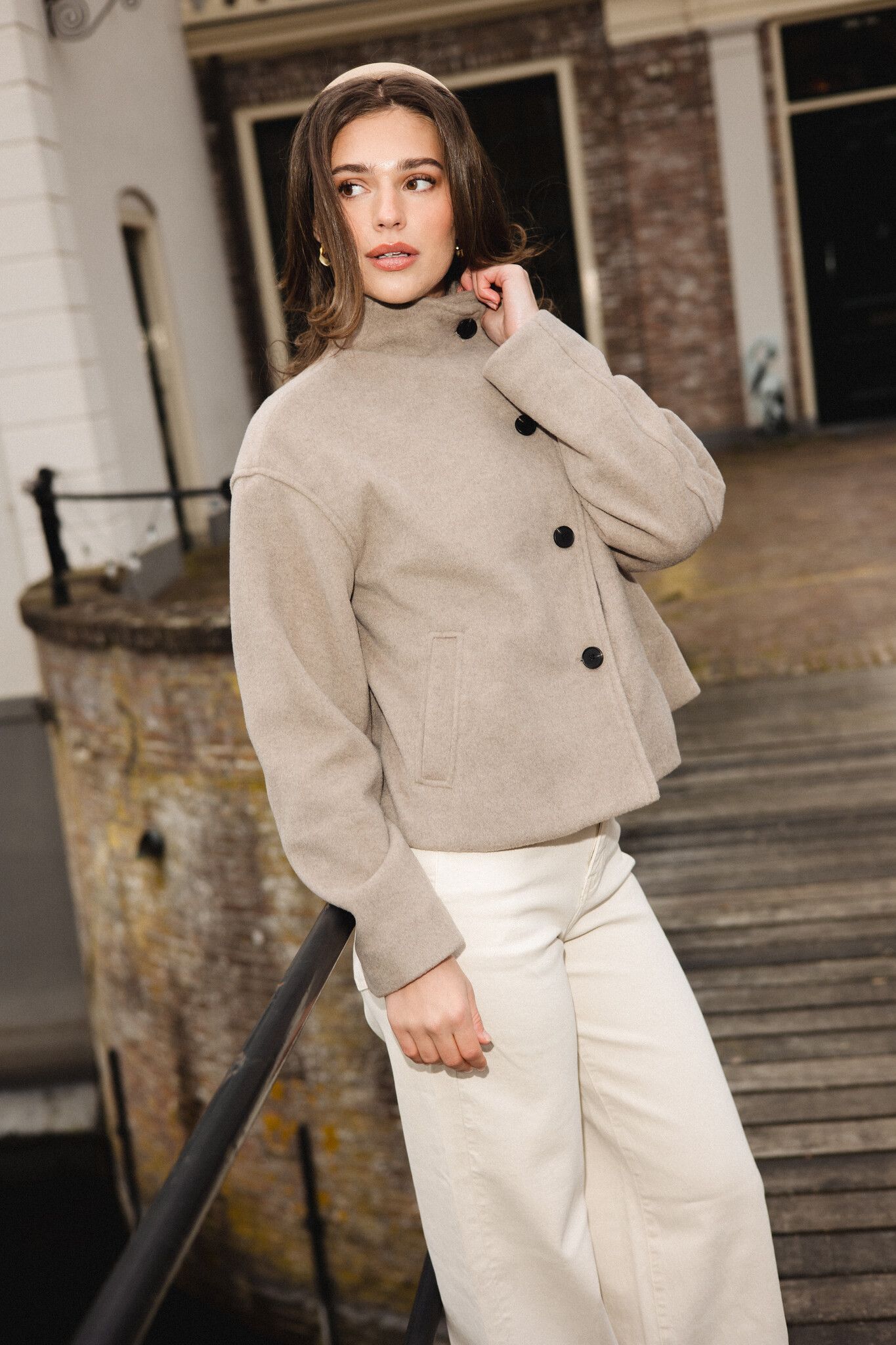 Deze mantel jas in het taupe is een stijlvol en tijdloos item met een korte pasvorm en knoopsluiting. De jas heeft een mooie fit en is perfect als korte tussenjas met knopen voor het voor- en najaar.