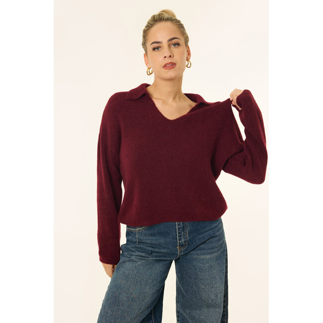 Deze bordeauxrode knit met kraag is de perfecte mix van comfy en classy. De zachte stof zit heerlijk en de V-hals met subtiele kraag geeft een stijlvolle, vrouwelijke touch. De relaxed fit maakt hem ideaal voor elke dag, draag de trui met een jeans voor een casual look of met een pantalon voor een wat meer nette vibe. Een warme, tijdloze knit die je het hele seizoen door wilt dragen.
