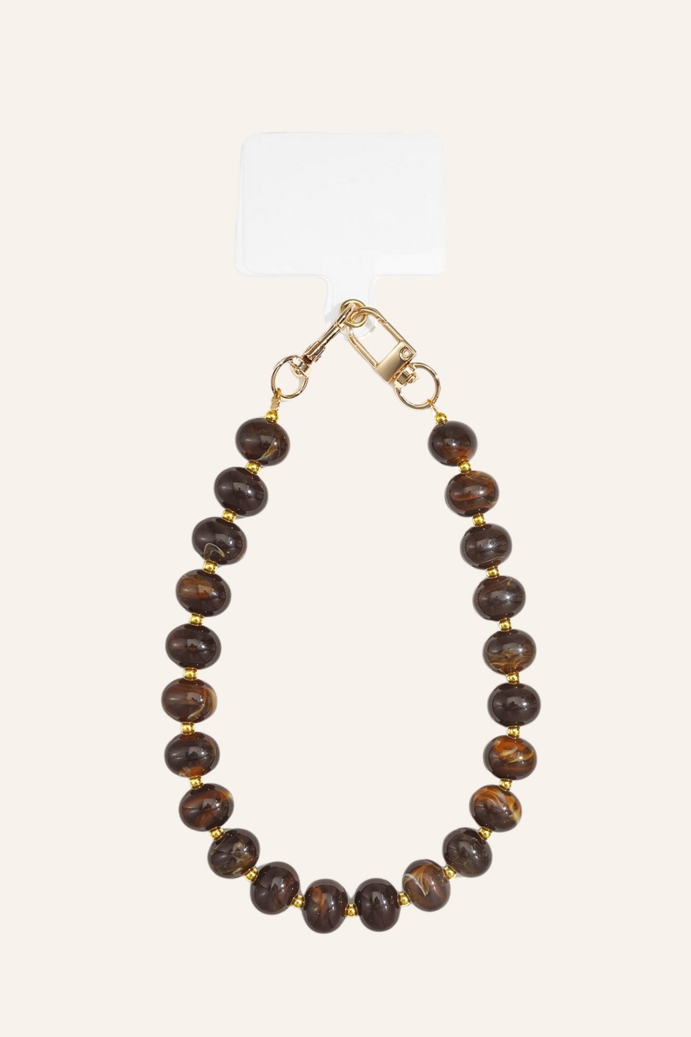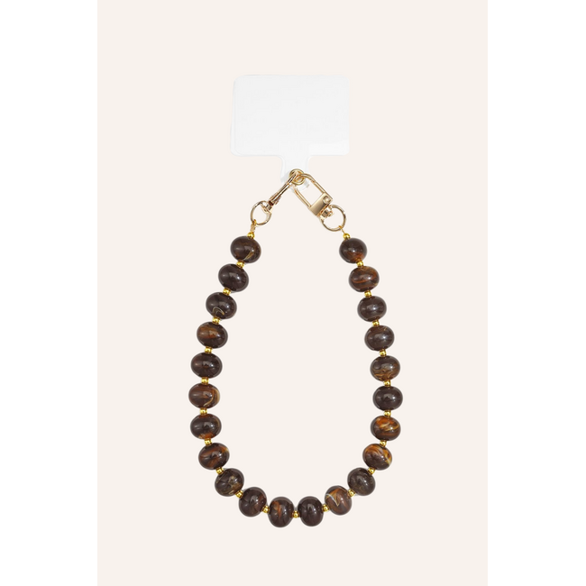 Dit universele telefoonkoord geeft je telefoon en je outfit, net dat beetje extra. De donkerbruine kralen met gouden details maken het telefoonkoord makkelijk te combineren met elke case. Handig voor dagelijks gebruik en een leuke toevoeging aan je outfit!