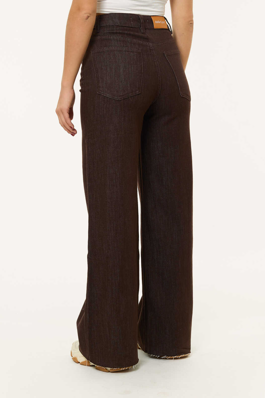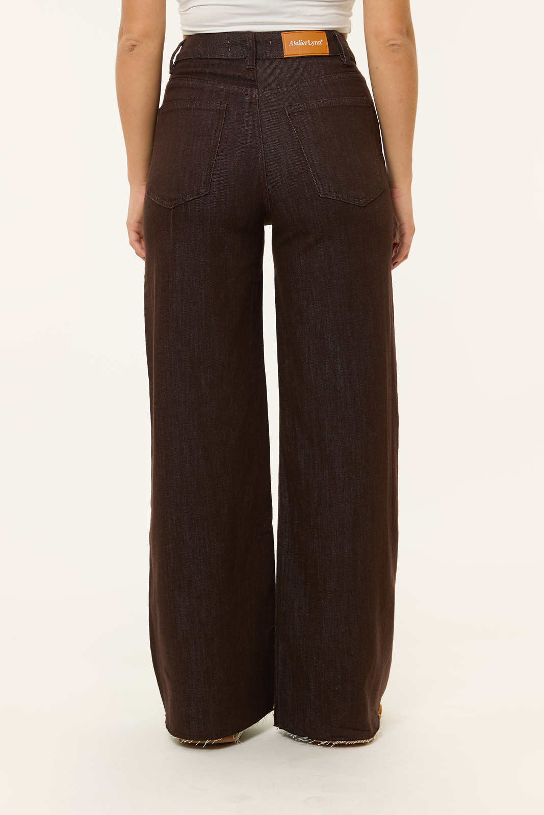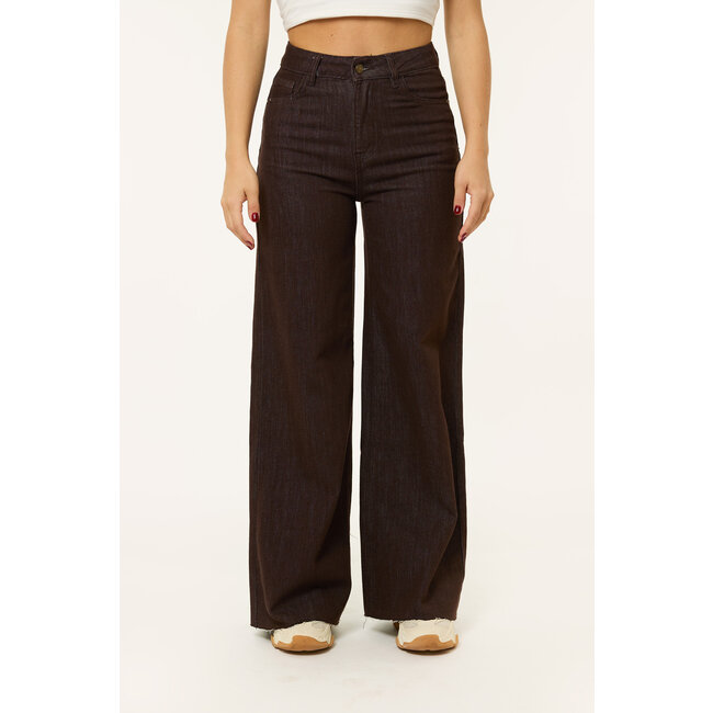 Deze donkerbruine wide leg jeans is de perfecte mix van stoer en stijlvol. De broek heeft een high waist pasvorm en wijde pijpen die mooi recht naar beneden vallen. Het stevige denim zorgt voor een mooie, aangesloten fit, ietsje strakker dan onze stretchmodellen. De rafelige zoom onderaan de jeans geeft net dat beetje extra. Combineer de broek met een basic top, blazer of knit voor een easy everyday look met een warm herfstgevoel.