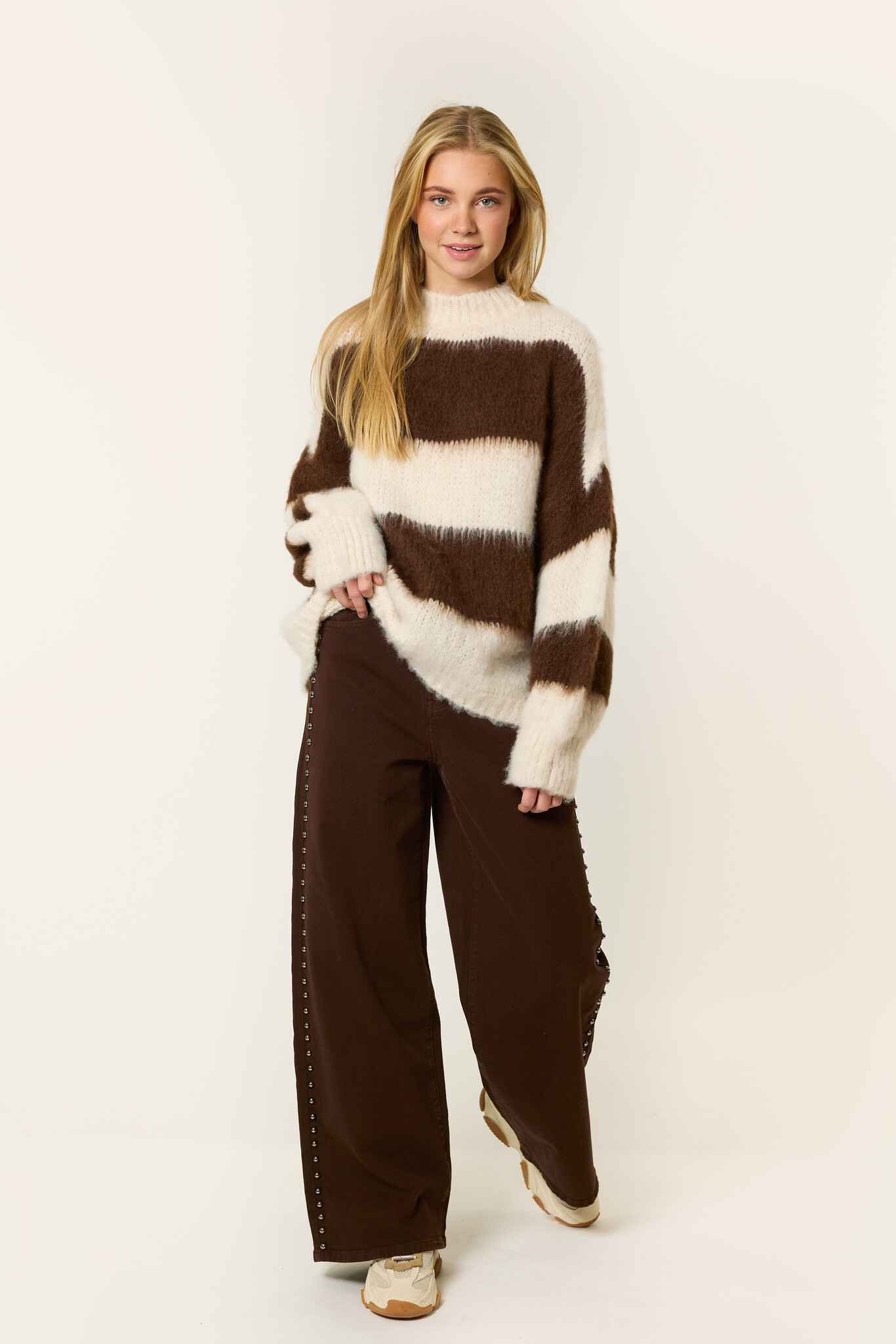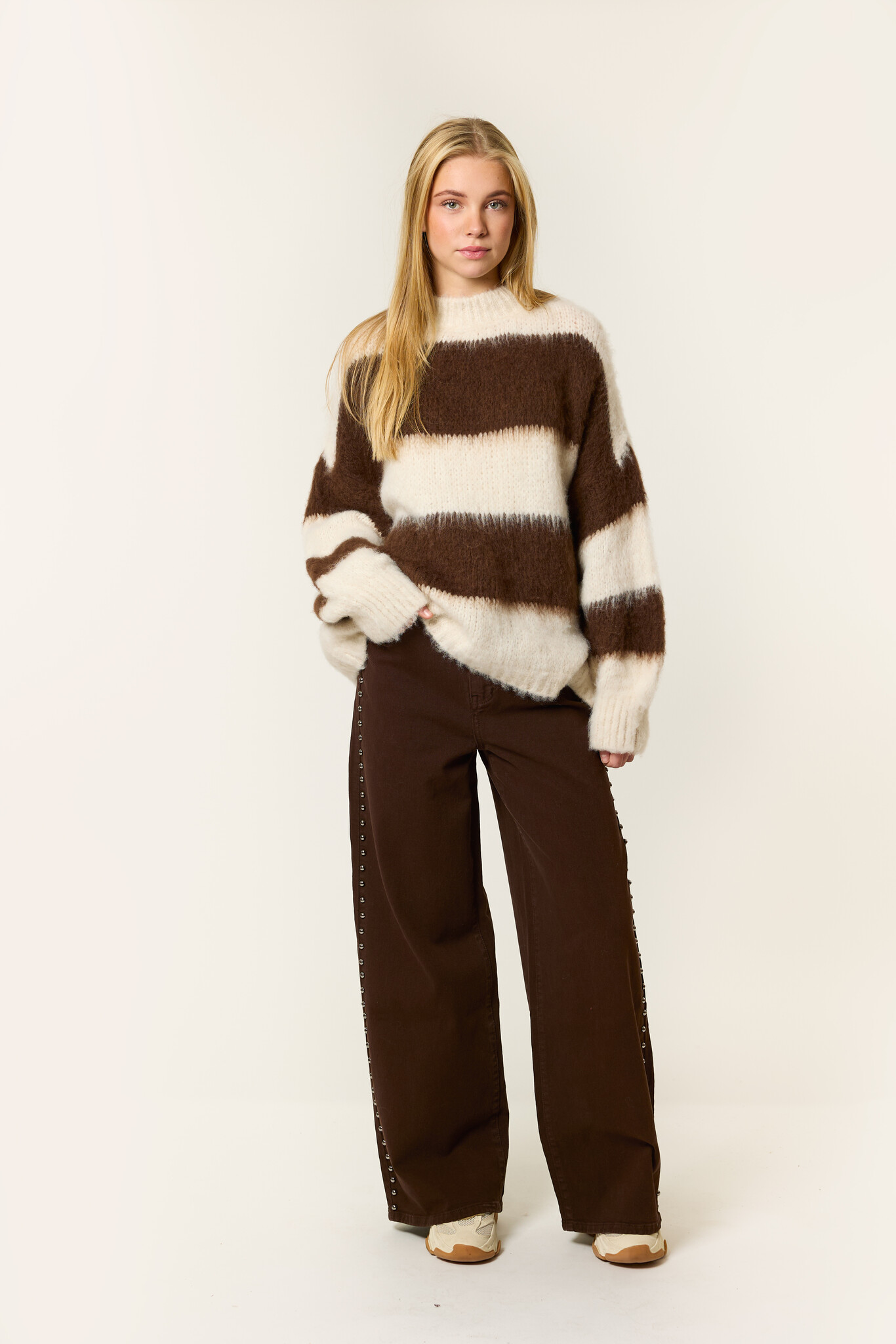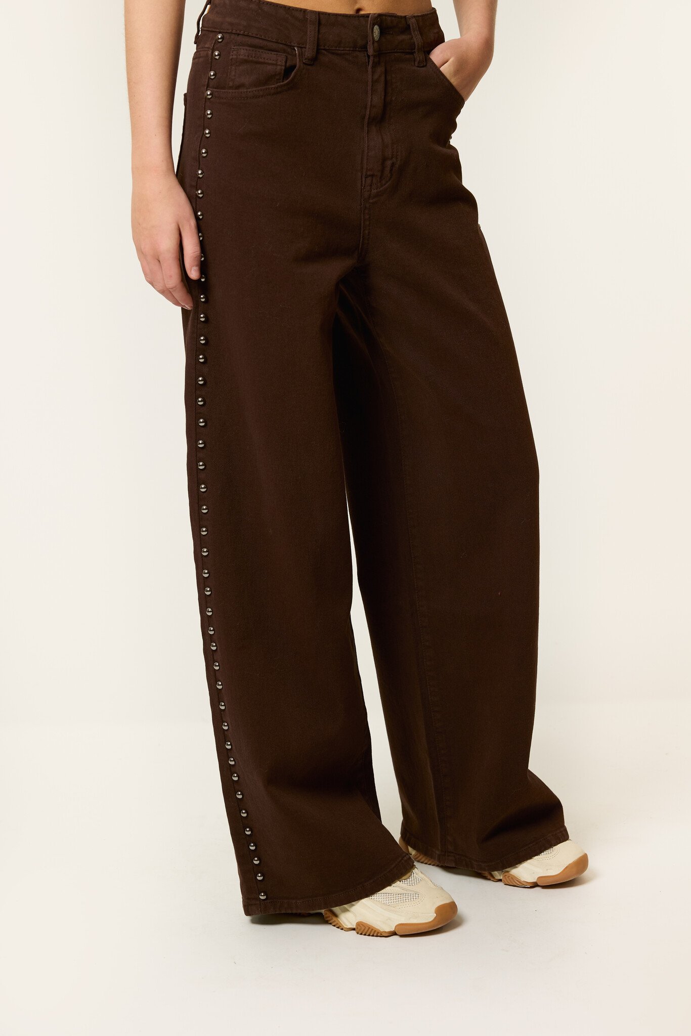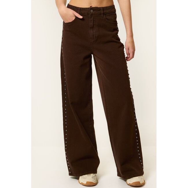 Hoe leuk is deze bruine jeans met studs?! Precies wat je nodig hebt als je even iets anders wilt dan een basic jeans. Draag het met een simpele top of oversized blouse en je hebt een perfect every day look met net dat beetje extra!