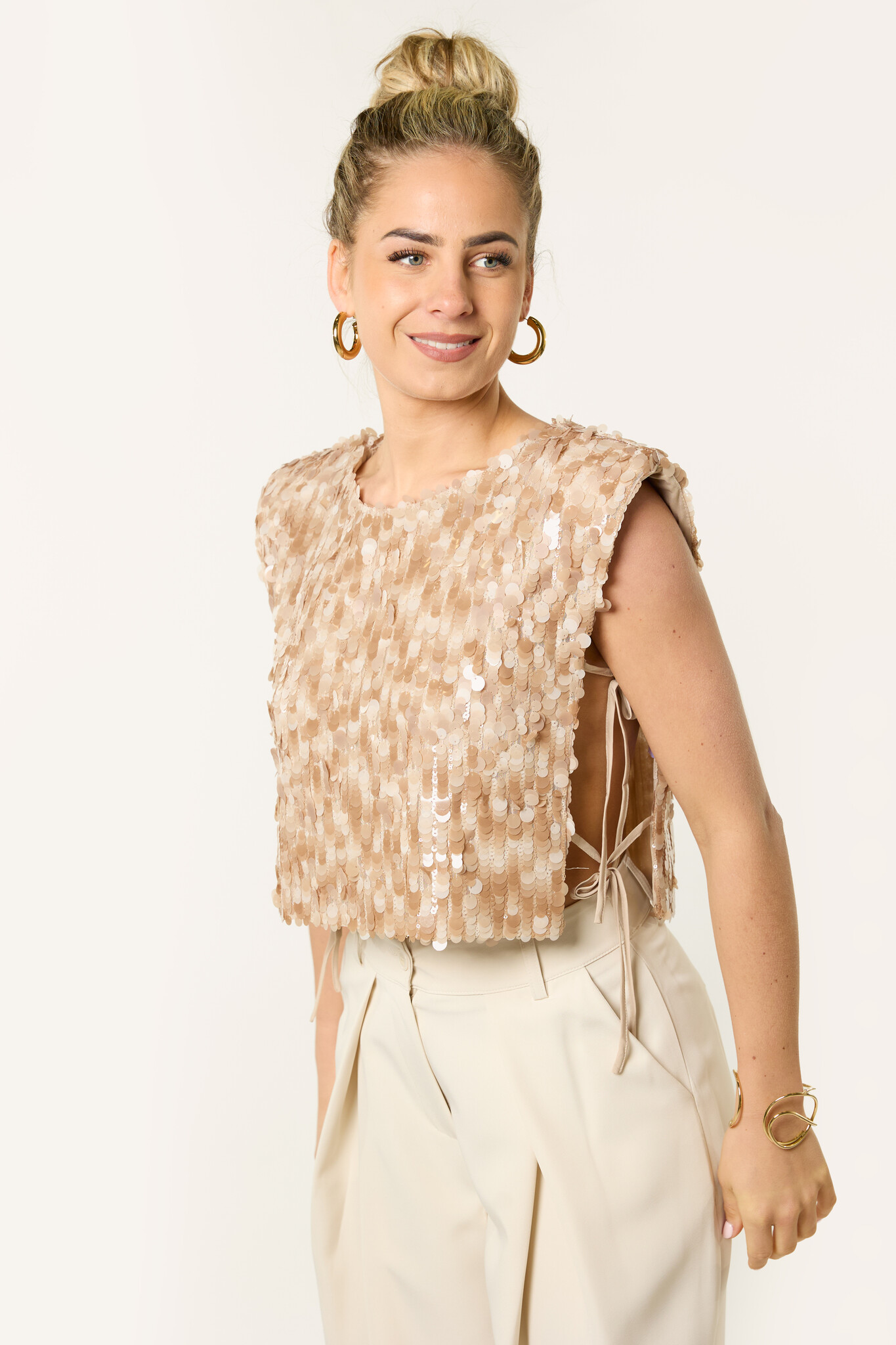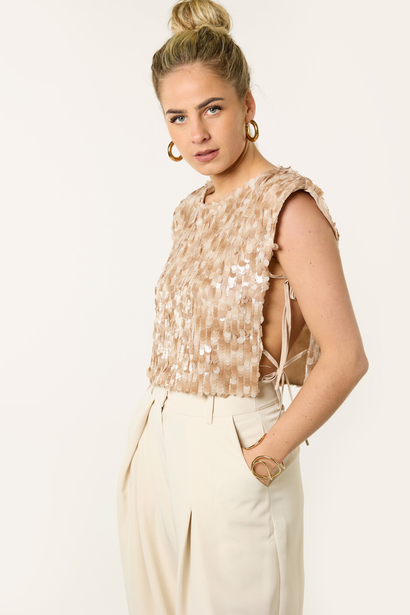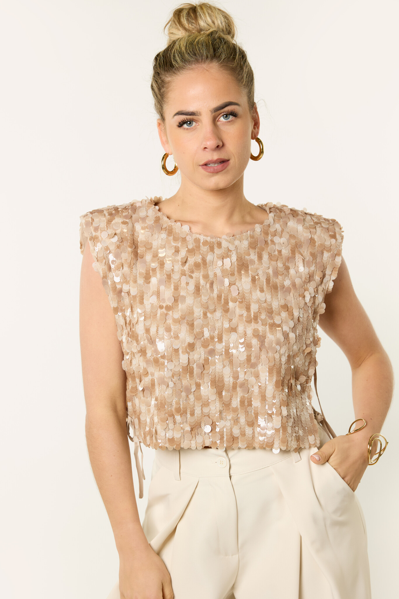 Deze beige pailletten top is zo’n top die je outfit meteen laat stralen. De glitter top is volledig bedekt met pailletten en geeft een feestelijke en opvallende uitstraling, terwijl de neutrale beige kleur hem makkelijk te combineren maakt.