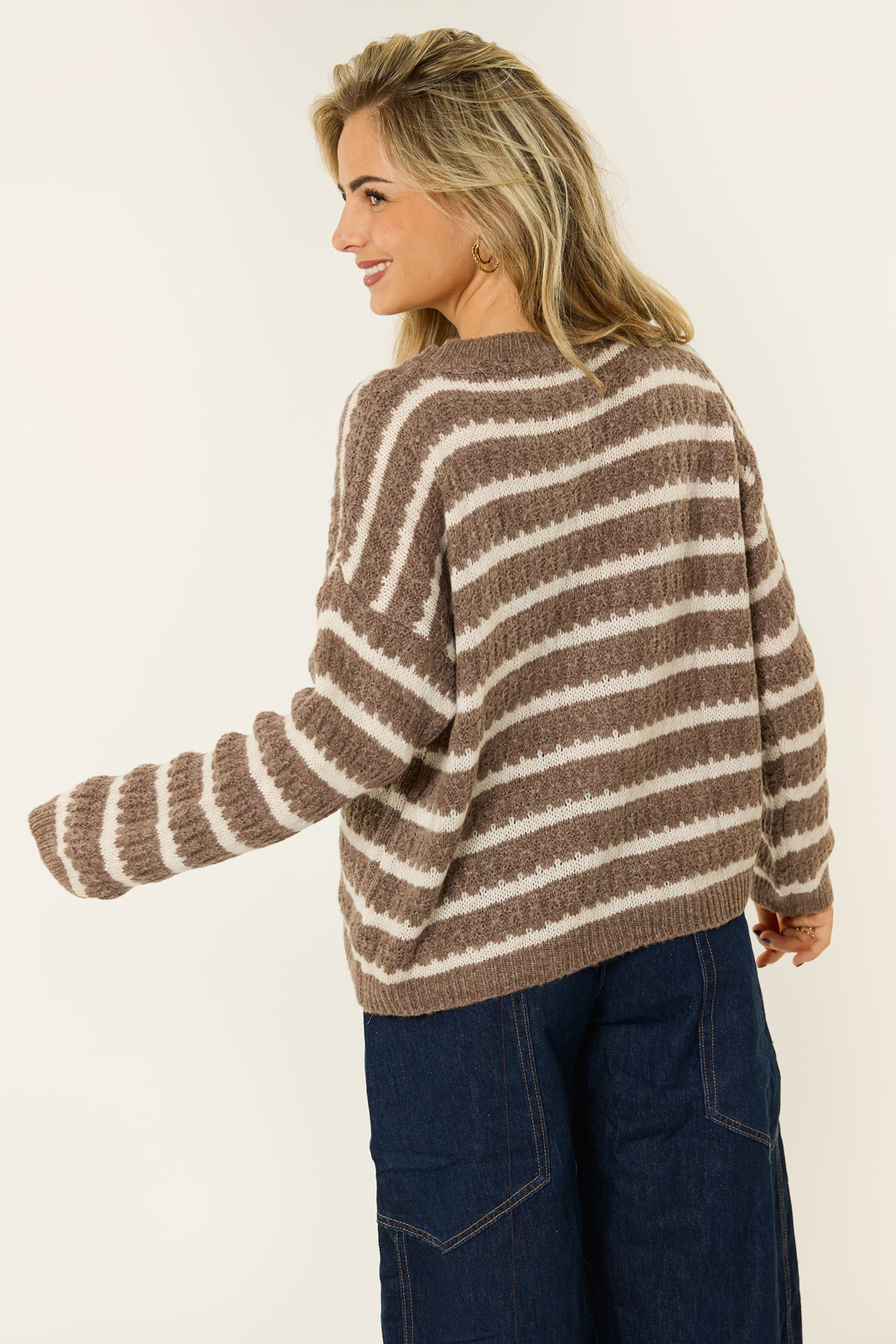 Deze gestreepte gebreide trui is de perfecte cozy essential voor het nieuwe seizoen. De zachte knit voelt heerlijk comfortabel aan, terwijl het fun kabel- en streepdesign je outfit net wat extra’s geeft. Dankzij de relaxed fit valt de trui mooi oversized, ideaal om casual te stylen met je favoriete jeans of als warme laag op koudere dagen. Een fijne knit die je moeiteloos elke dag draagt én combineert.