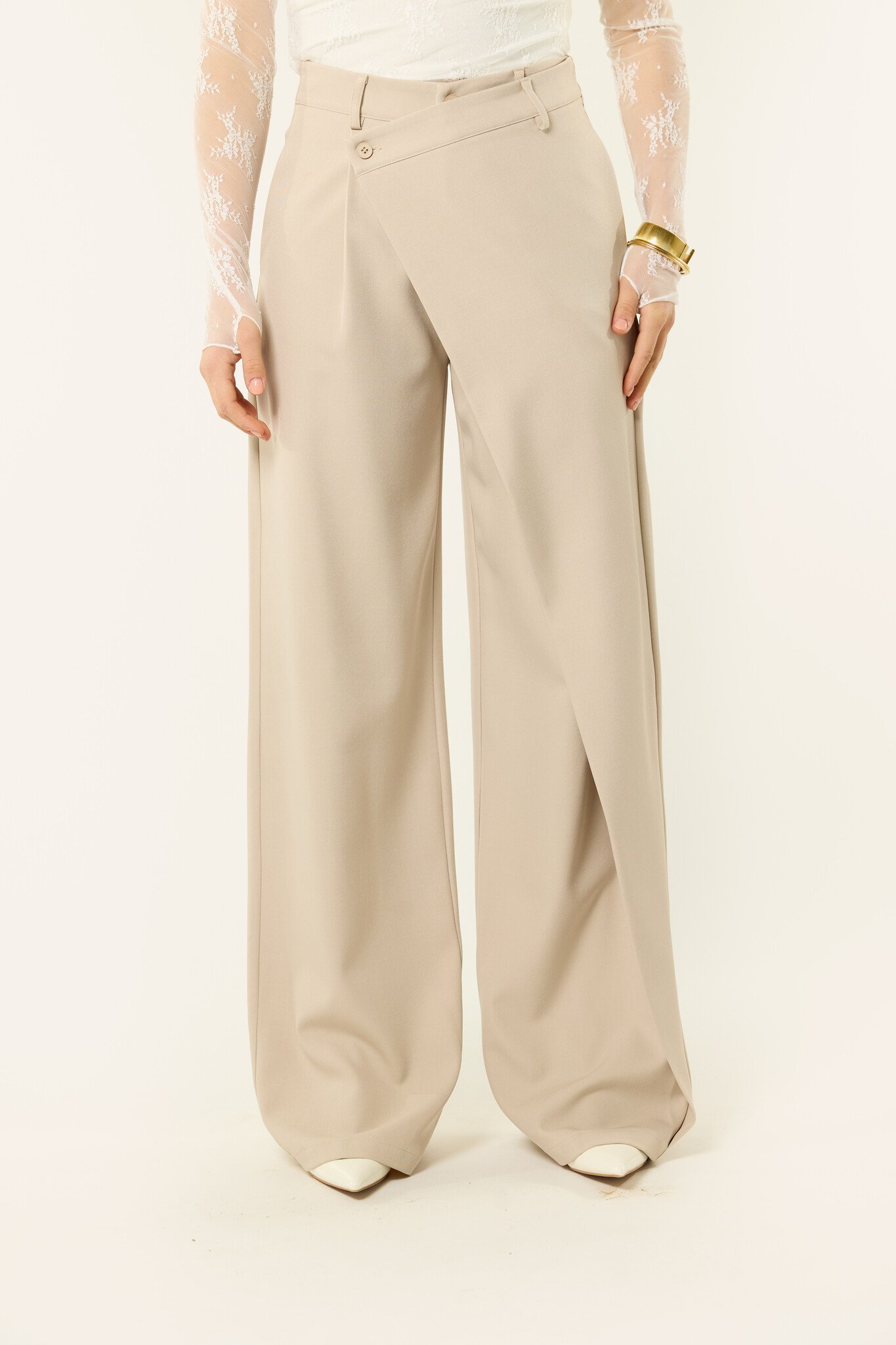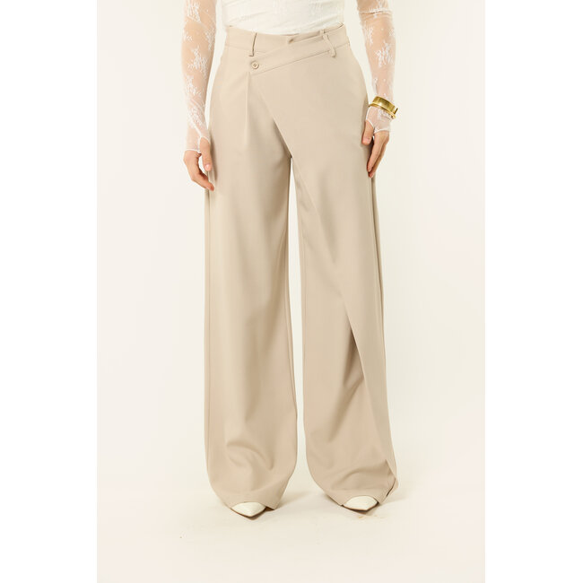 Deze beige wide leg pantalon heeft een stijlvolle en moderne look. De overslag aan de voorkant geeft de broek een bijzonder detail en zorgt voor een mooie, flatterende pasvorm. Door de hoge taille en de lange pijpen valt de pantalon elegant en creëer je makkelijk een chique outfit.